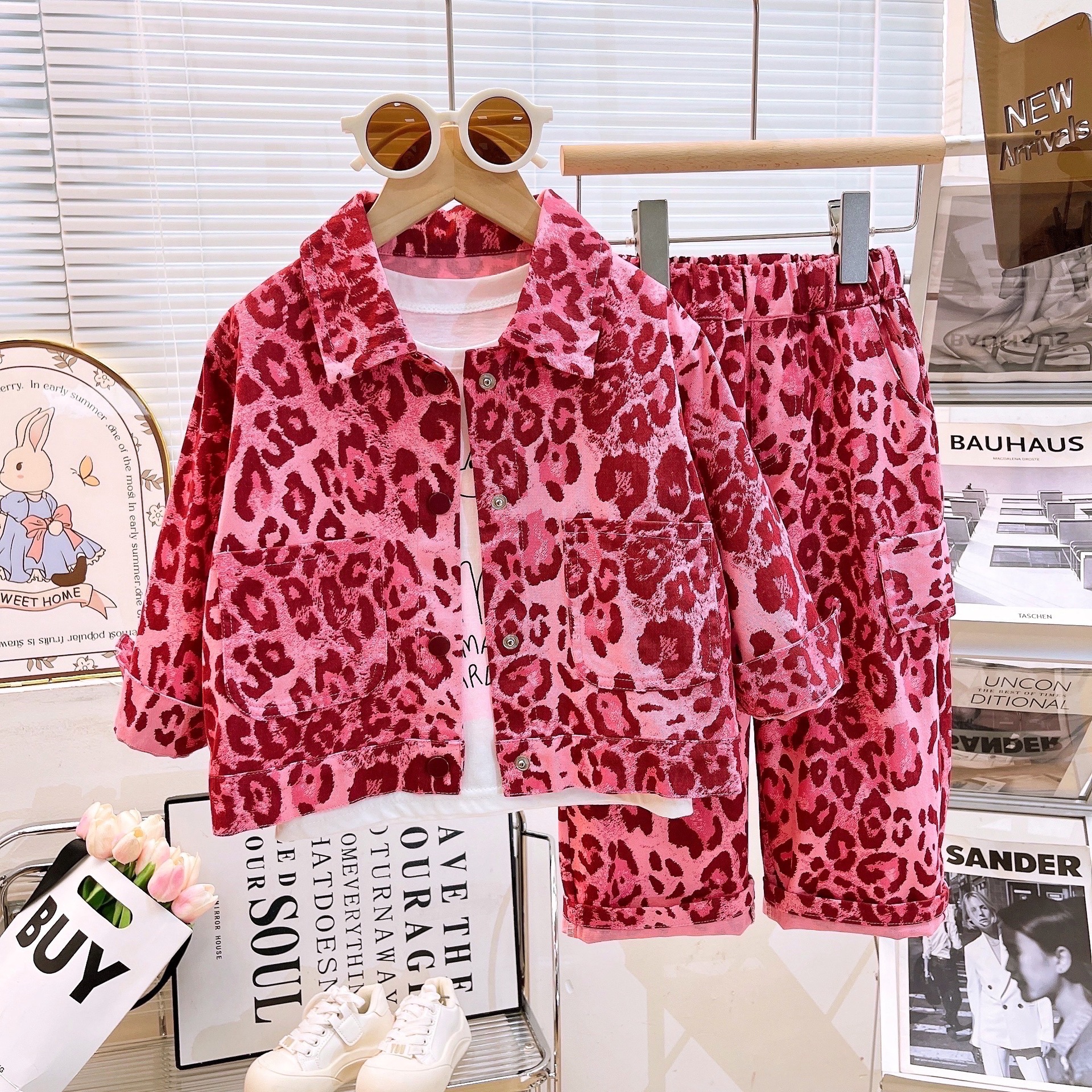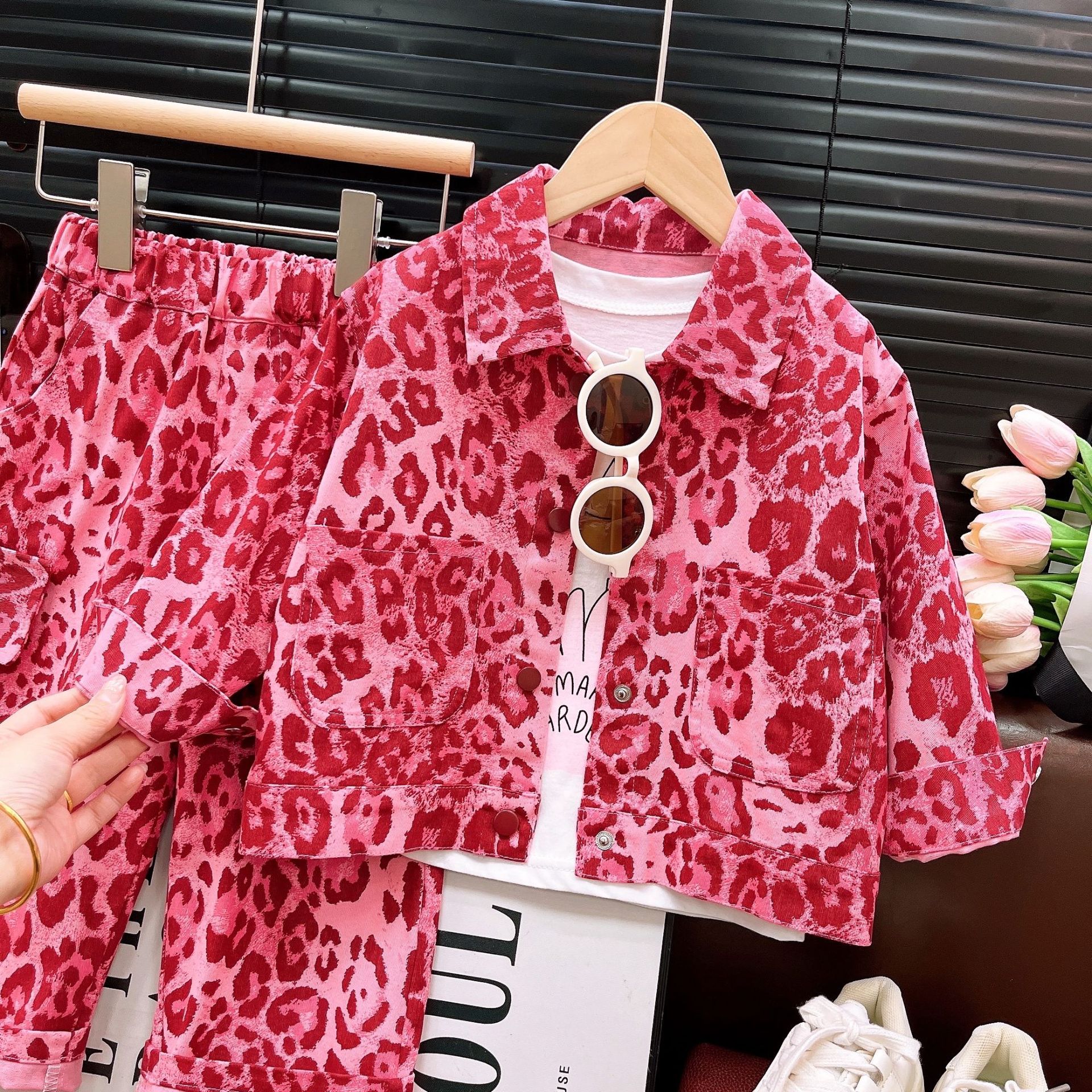 여아 2026 가을 신상 아동복 여아 패션 핑크 레오파드 프린트 세트 긴팔 자켓과 긴 바지 투피스 세트
