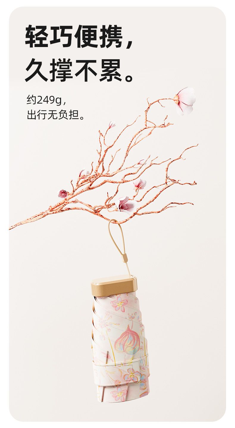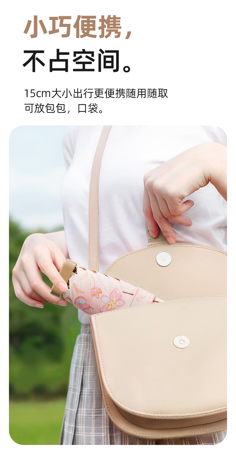 5. 超轻随行!14CM小巧+轻盈重量,拎透明包也能装下,防晒伞不再是负担,逛街通勤随时“伞”护美丽~