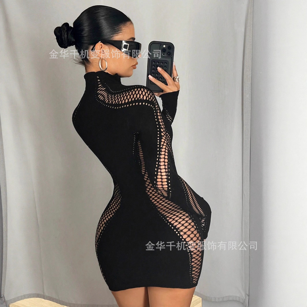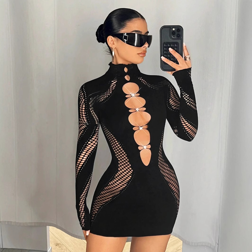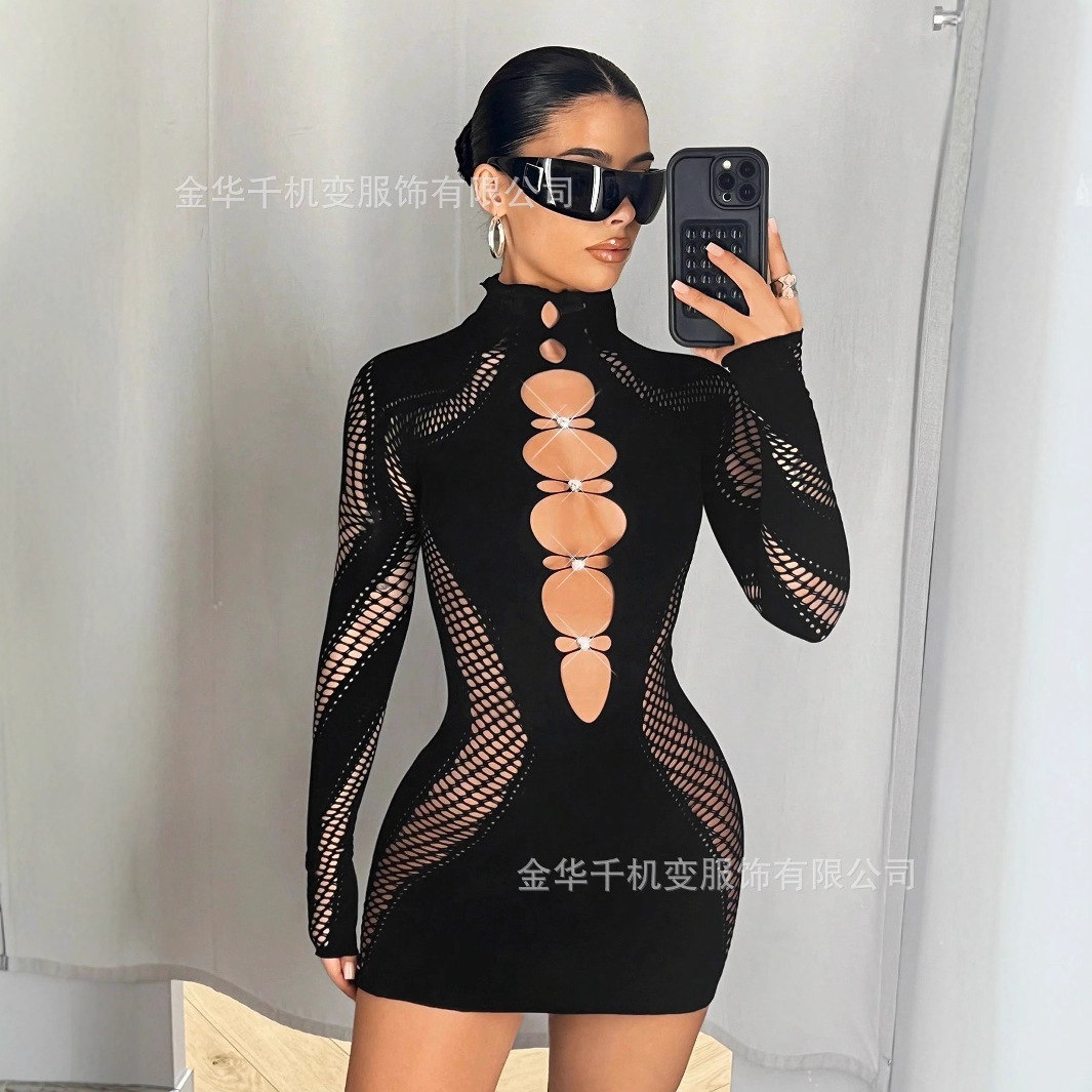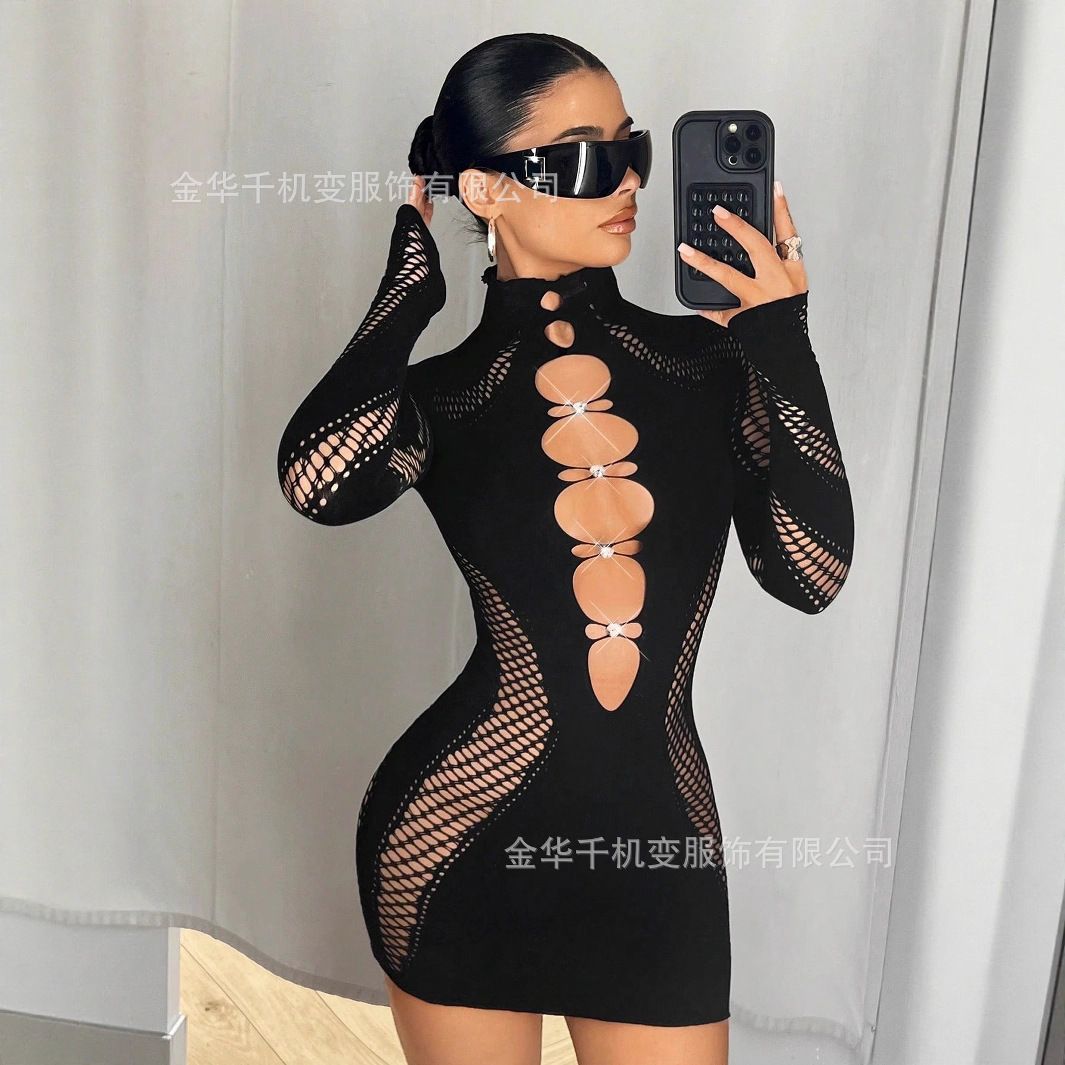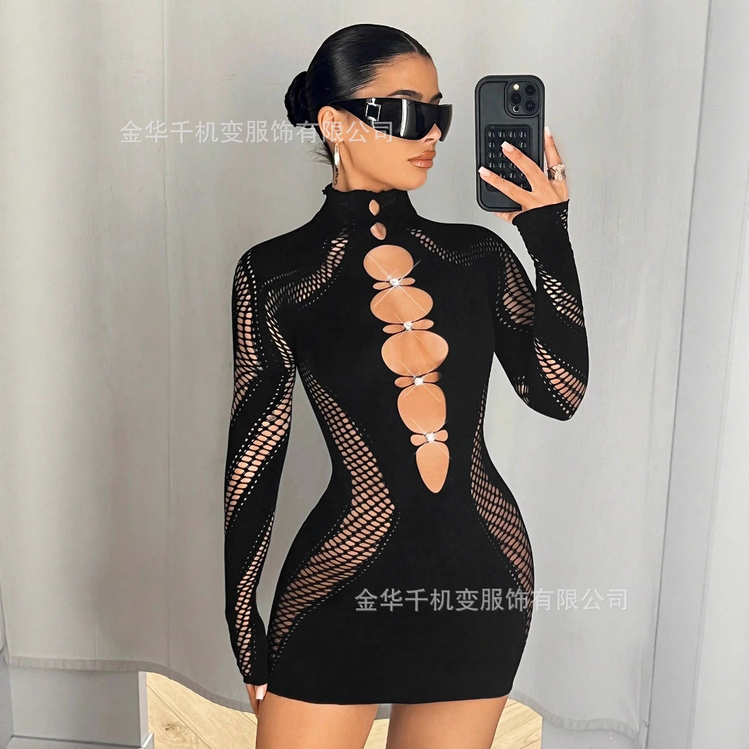 2025 가을 신상 여성 긴팔 하프넥 레이스 다이아몬드 장식 크로스보더 나일론 고탄성 니트 원피스 도매스토어 가기