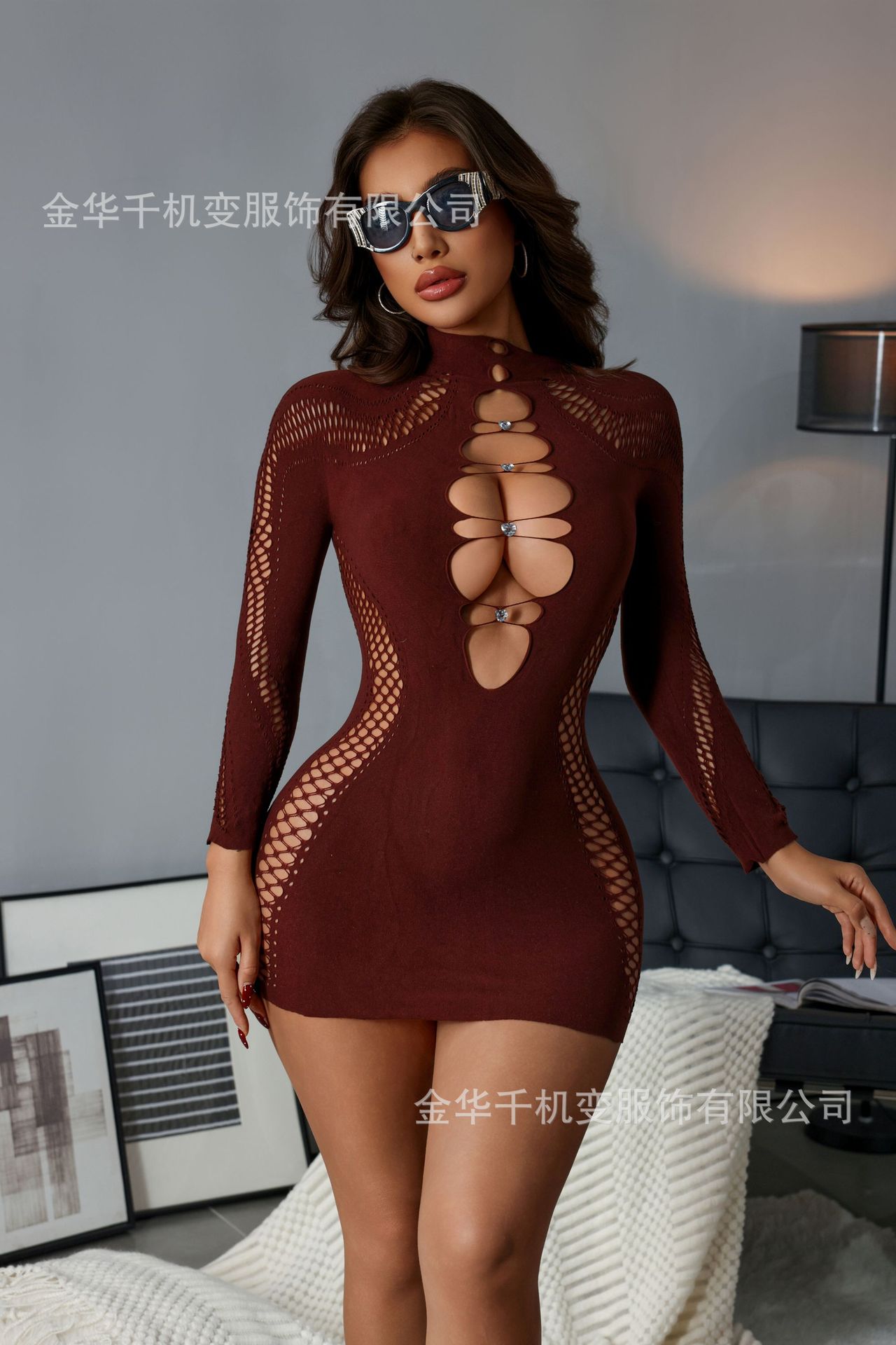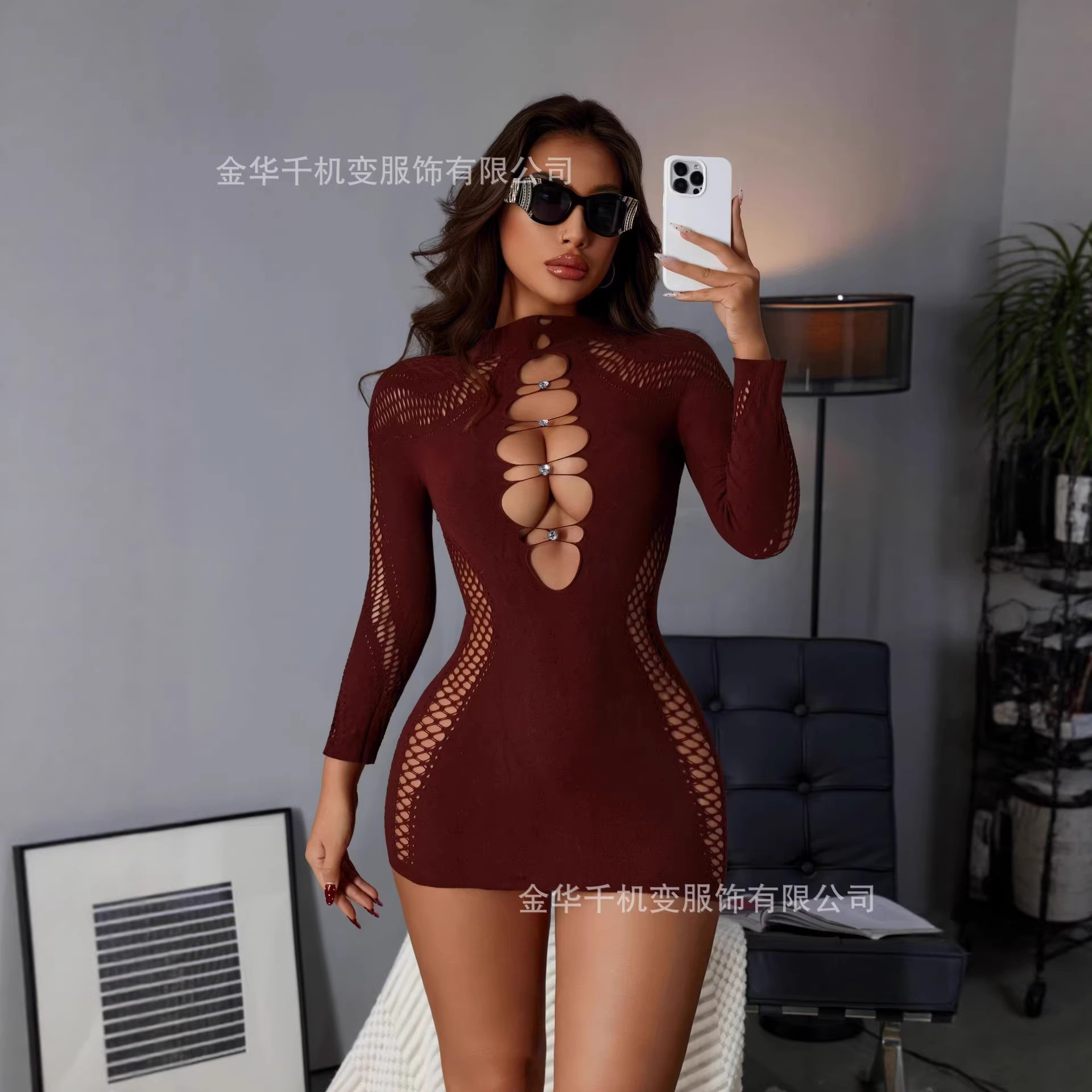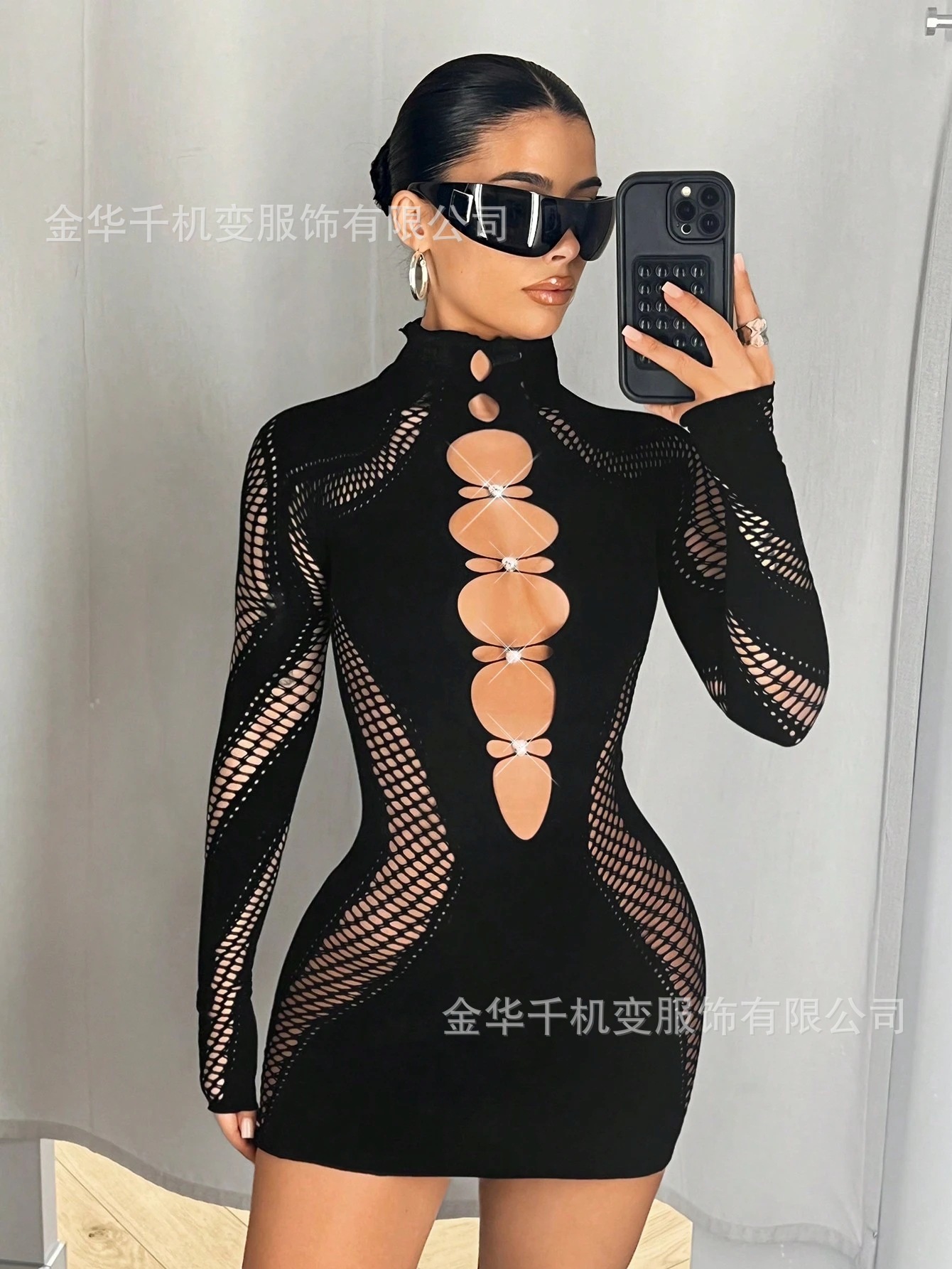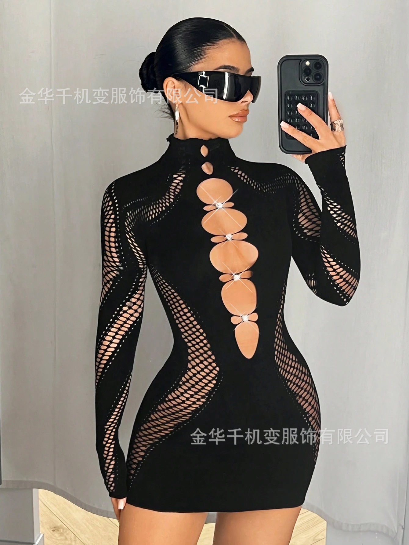 2025 가을 신상 여성 긴팔 하프넥 레이스 다이아몬드 장식 크로스보더 나일론 고탄성 니트 원피스 도매스토어 가기