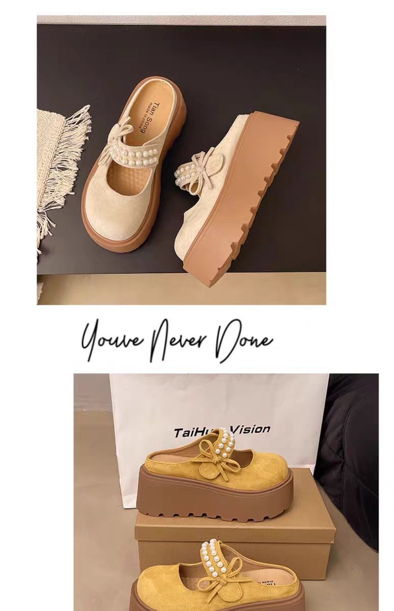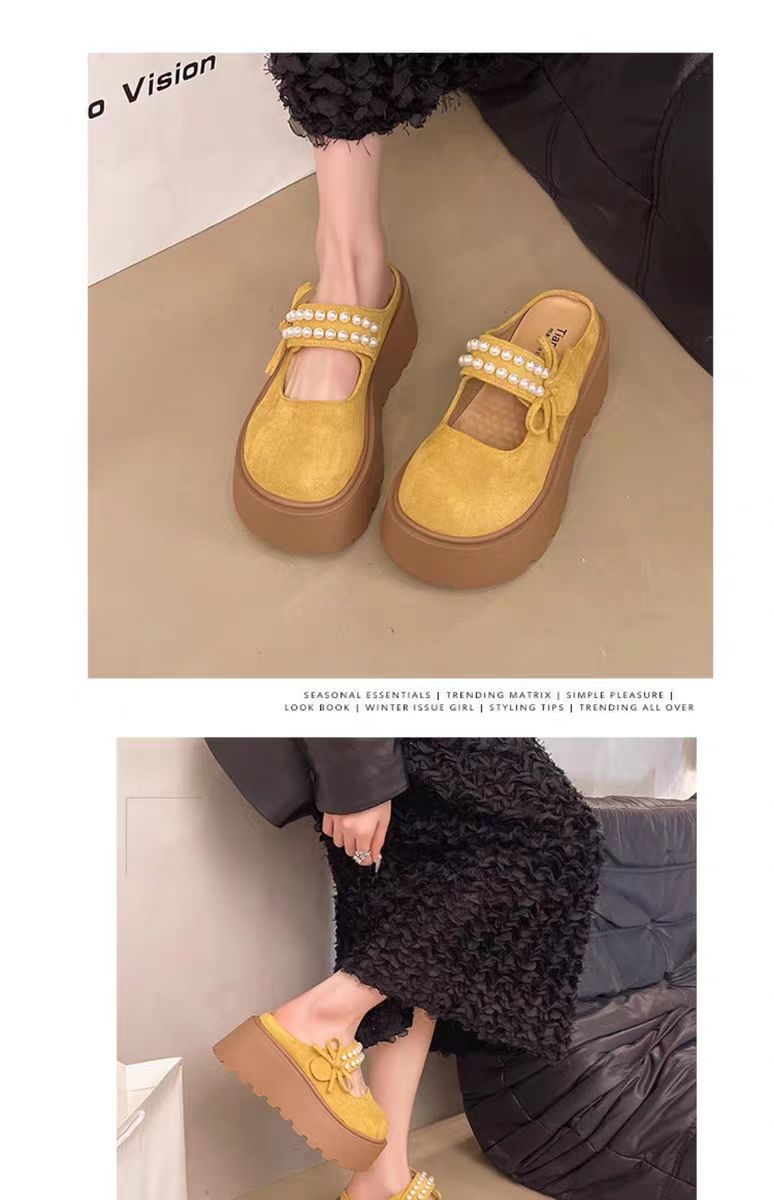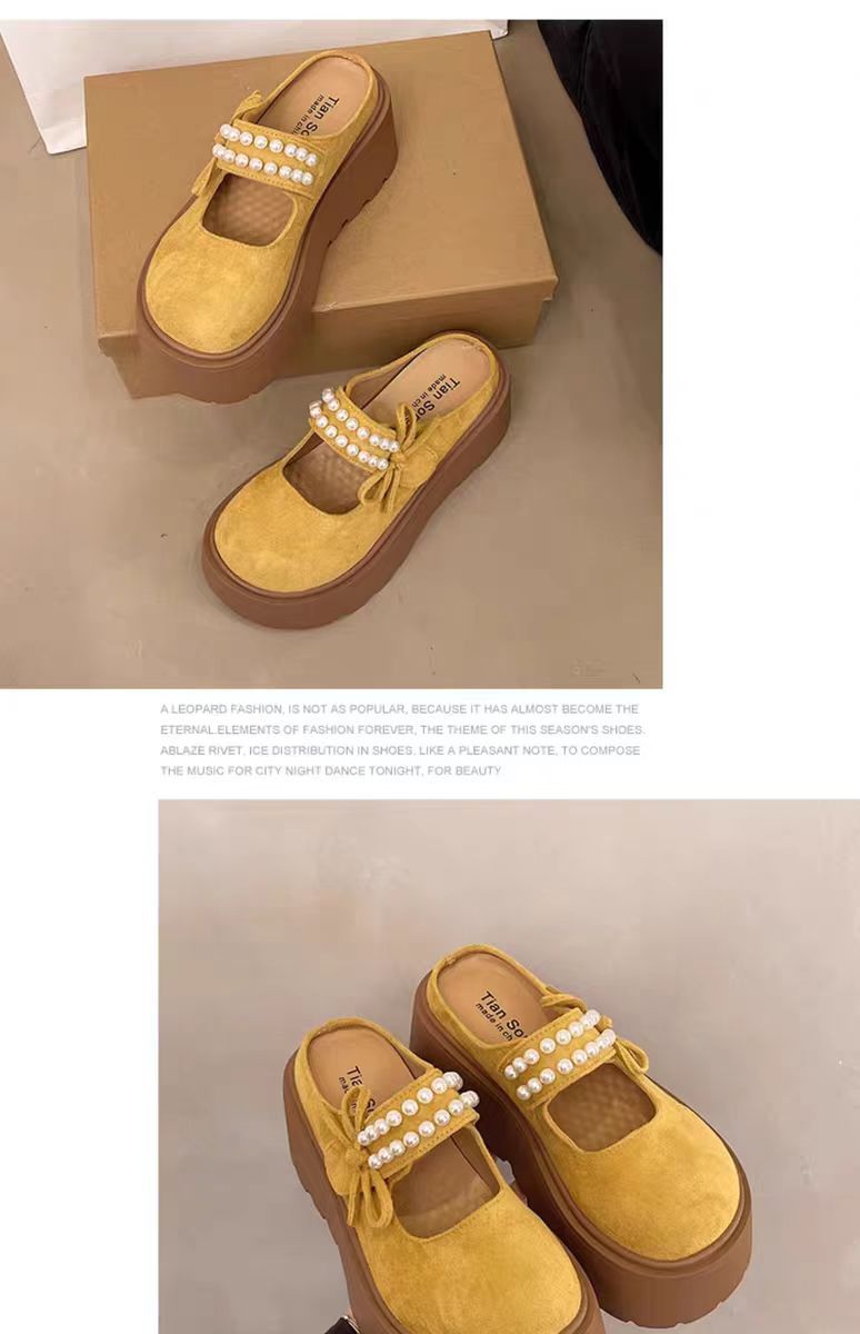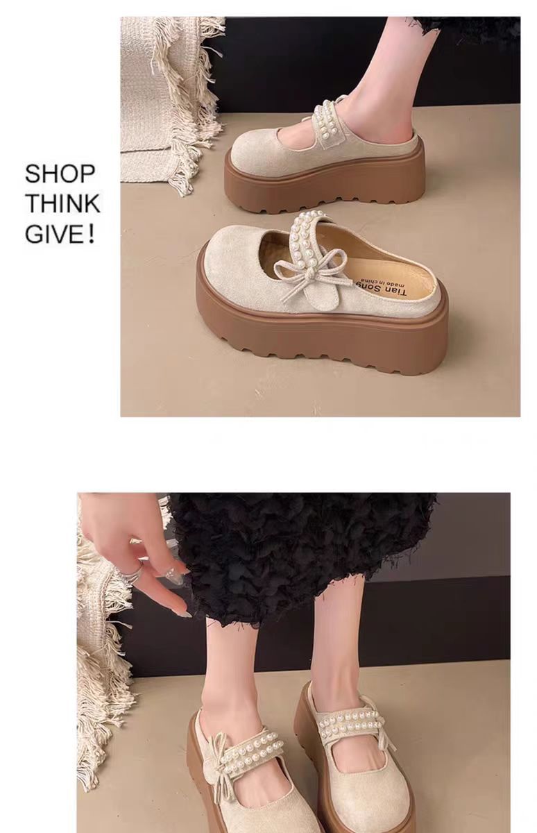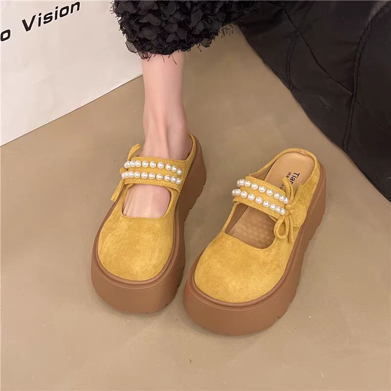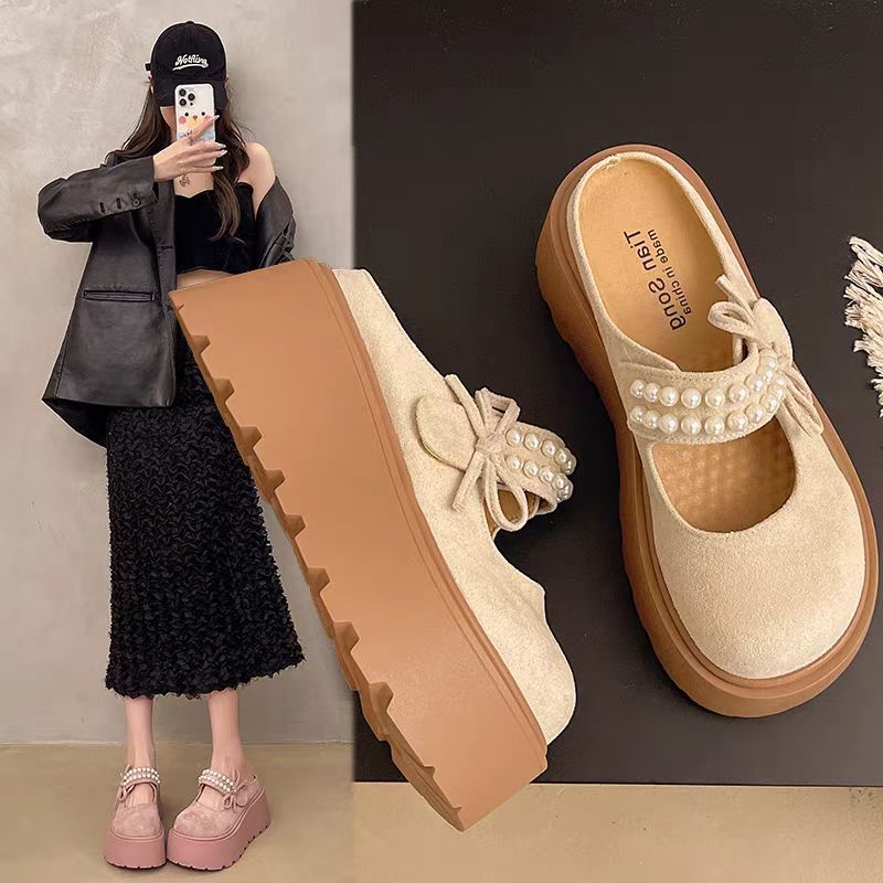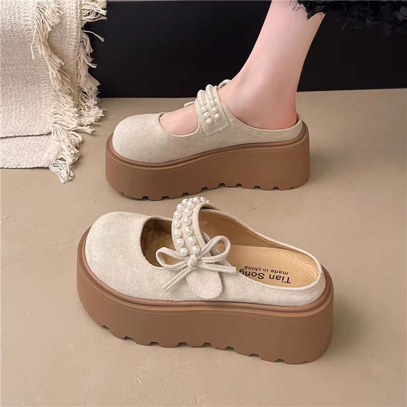 두꺼운 밑창의 키높이 버켄스탁 슬리퍼 여성용 여름 외출용 2026년 신상 레이지 스타일 앞굽이 덮힌 반슬리퍼 진주 장식 메리제인 샌들 슬리퍼스토어 가기