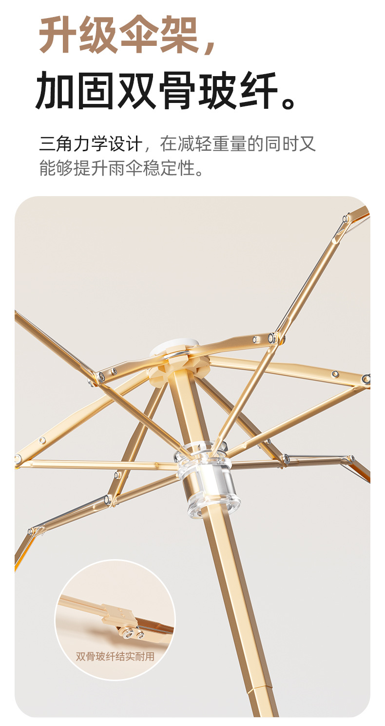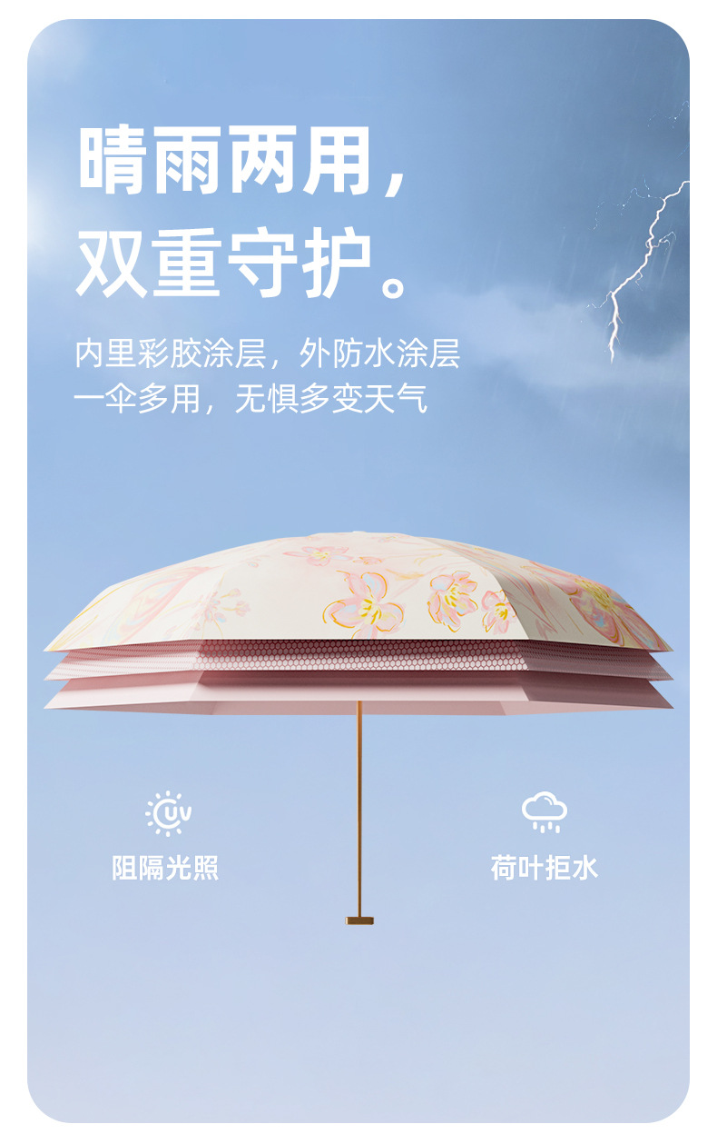 3. 晴雨全能!内彩胶防晒、外防水涂层,阻隔光照+荷叶拒水,一把伞扛住多变天气,出行少带累赘超省心!