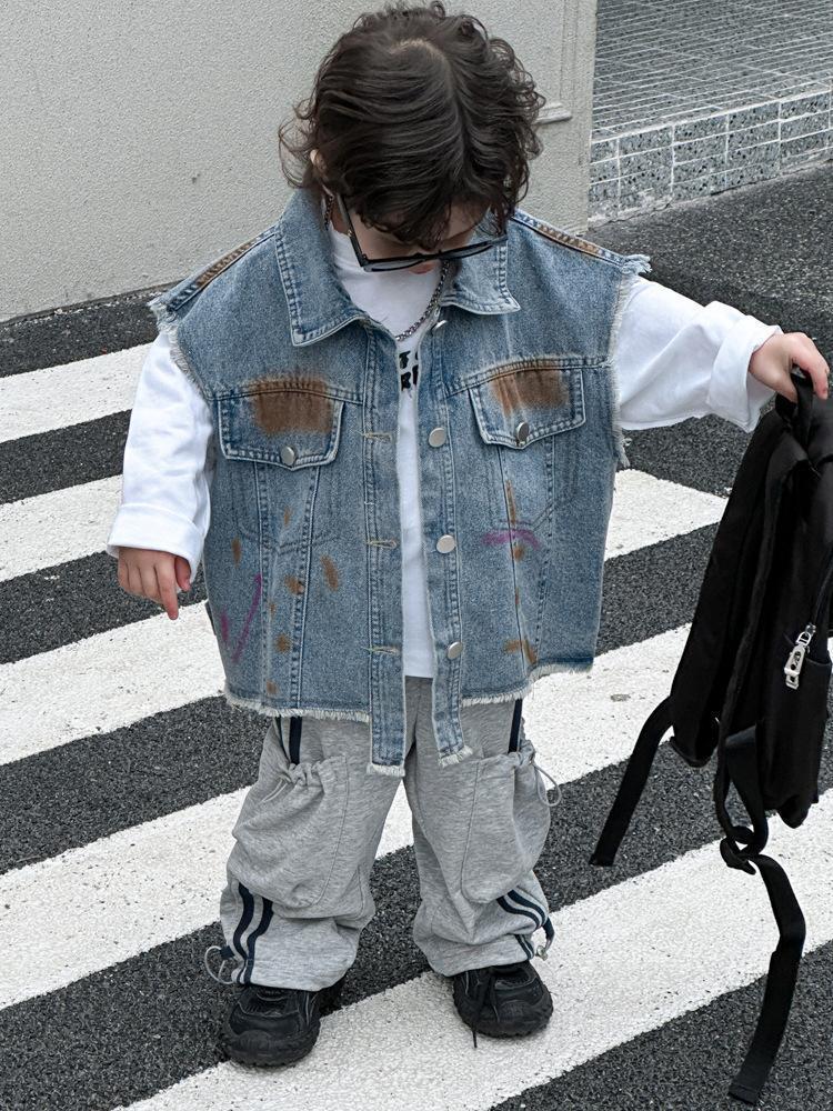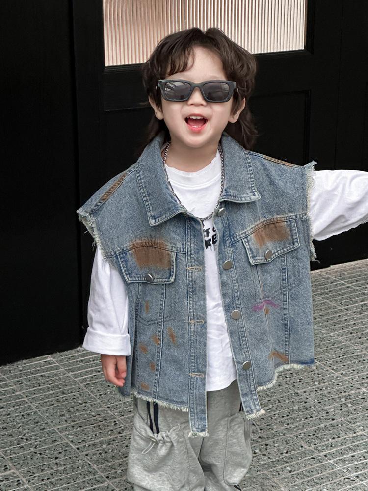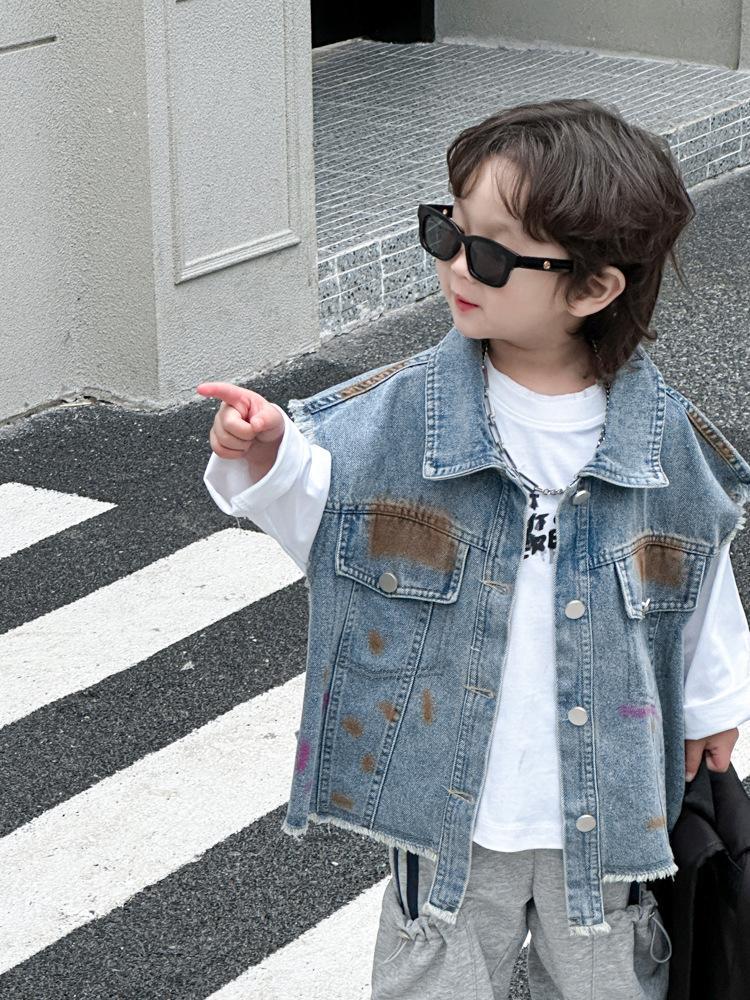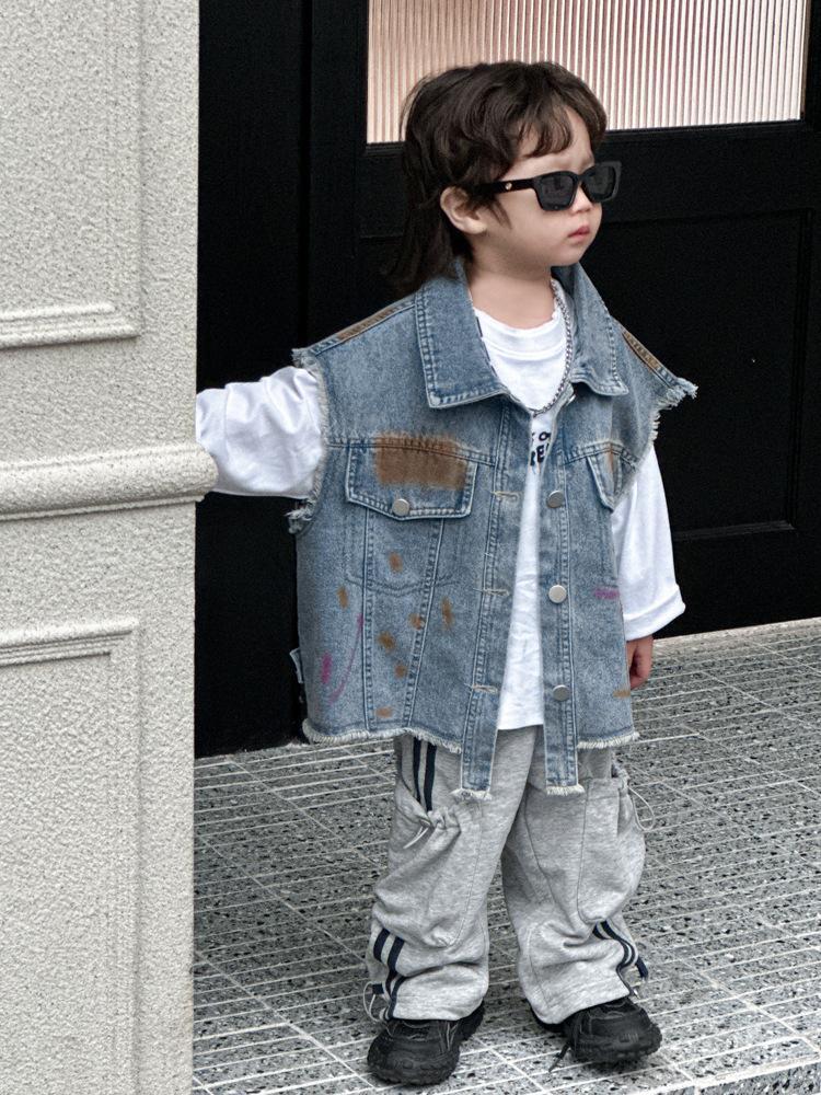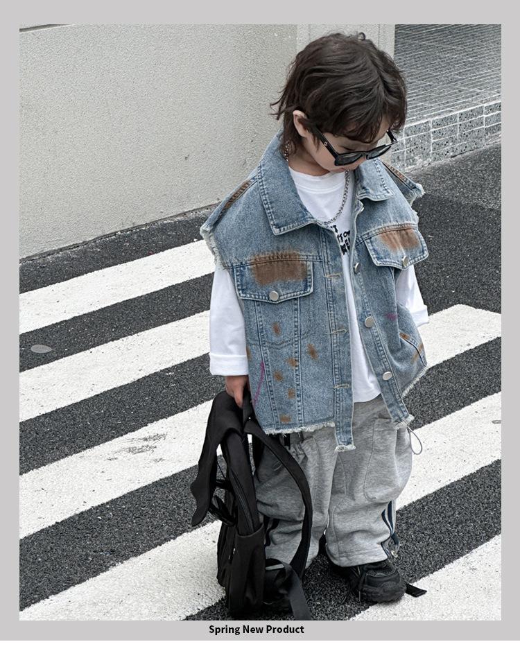 2025 봄 신작 아동 조끼 컬러 페인트 데님 조끼 소년 봄 옷 한국 스타일 아동복스토어 가기