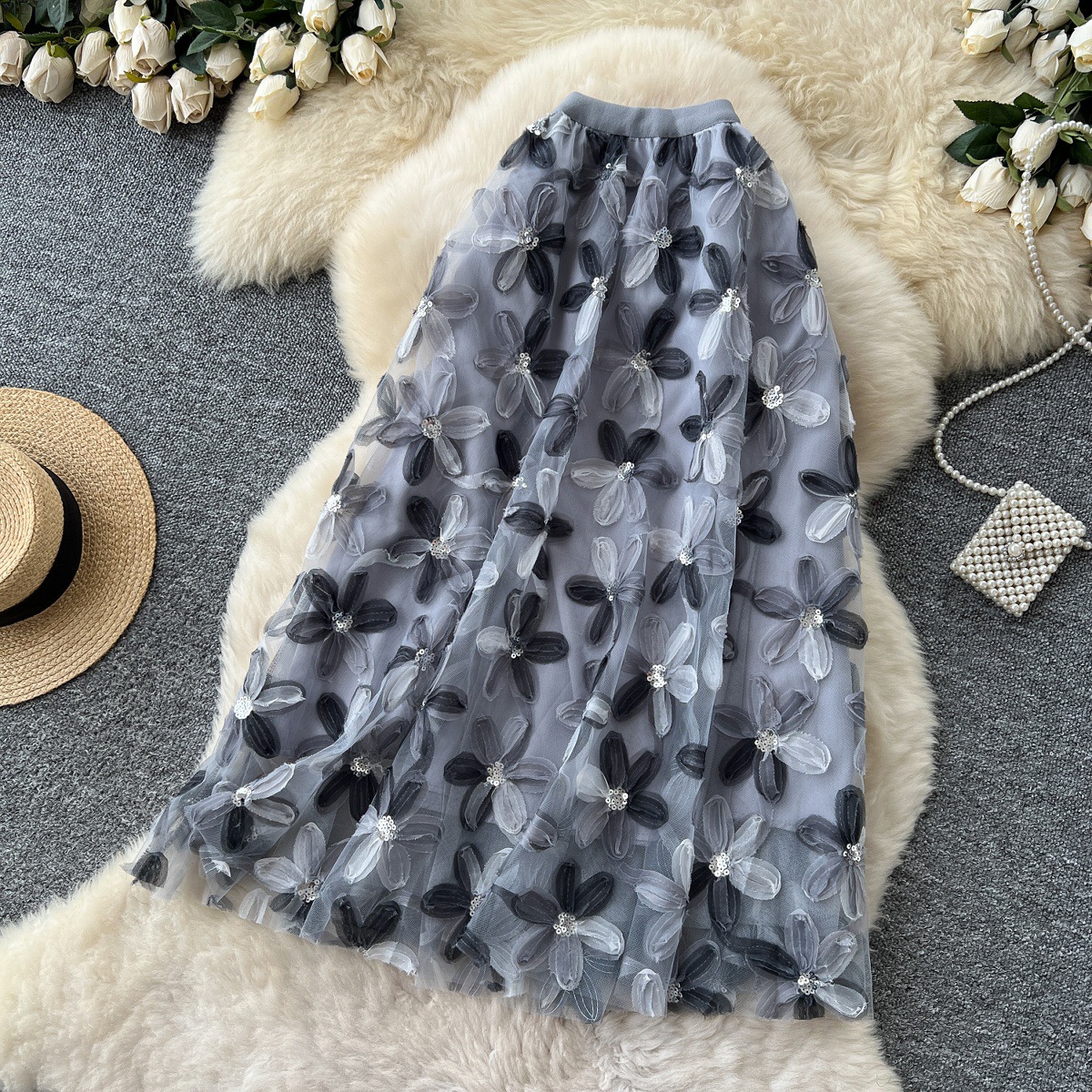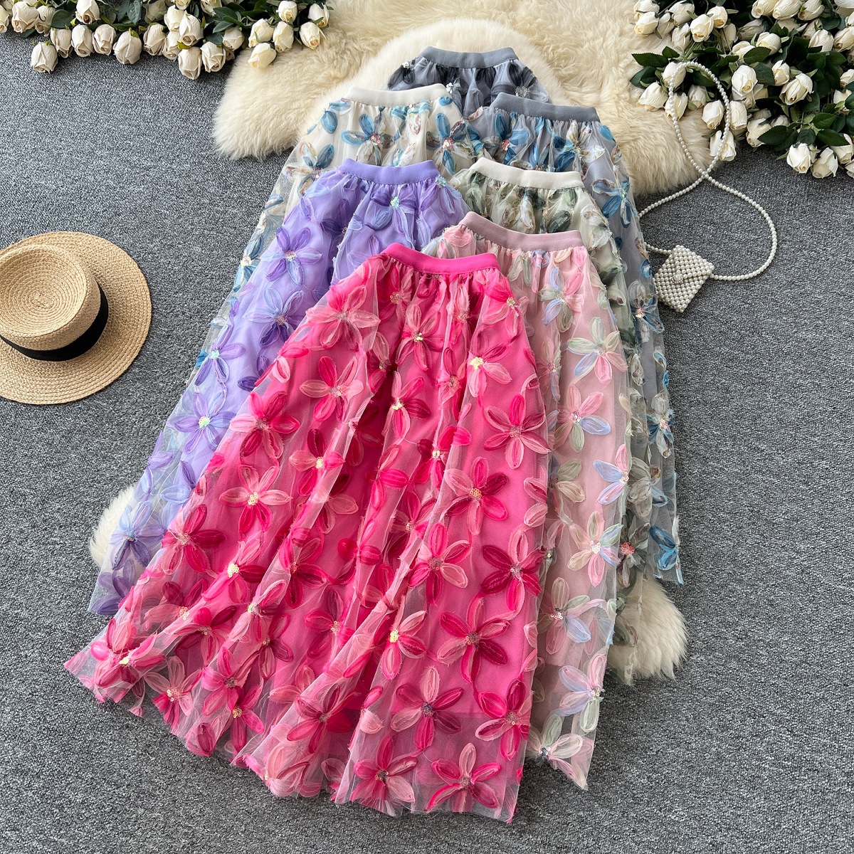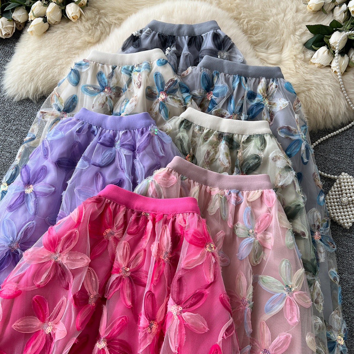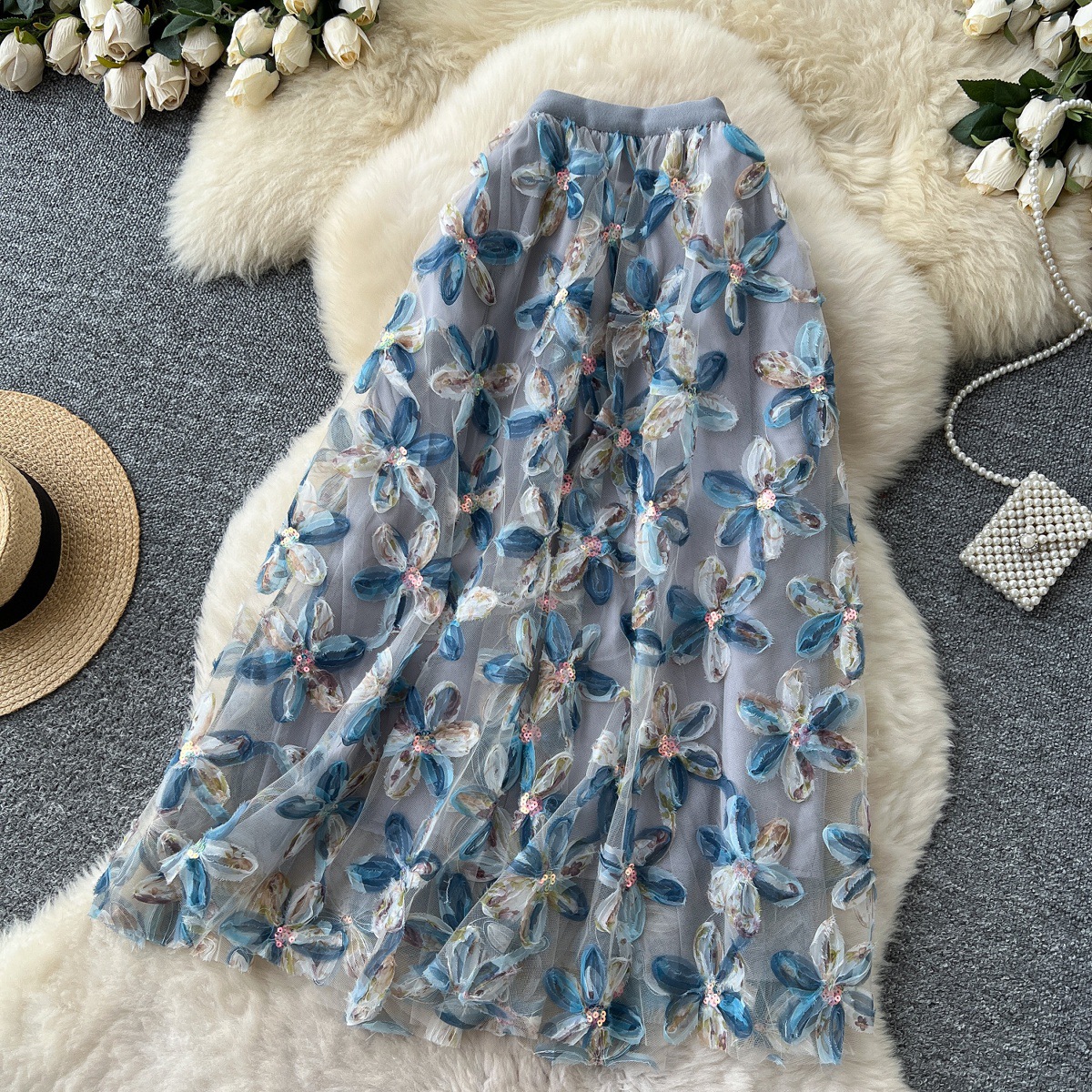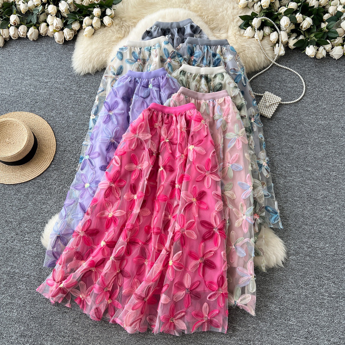여름 여성을 위한 프렌치 로맨틱 분위기의 메쉬 스커트 신축성 있는 허리 입체 꽃 A라인 아름다운 롱 스커트