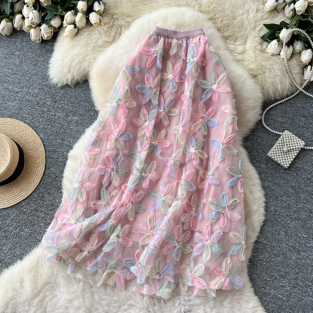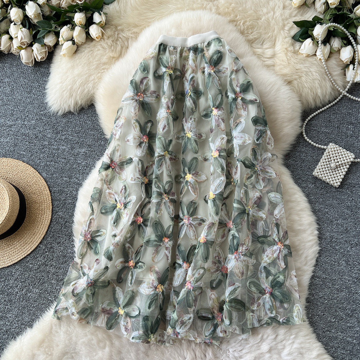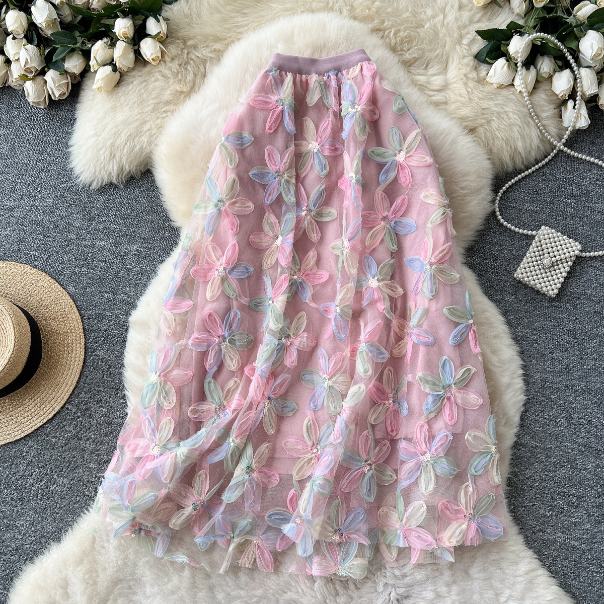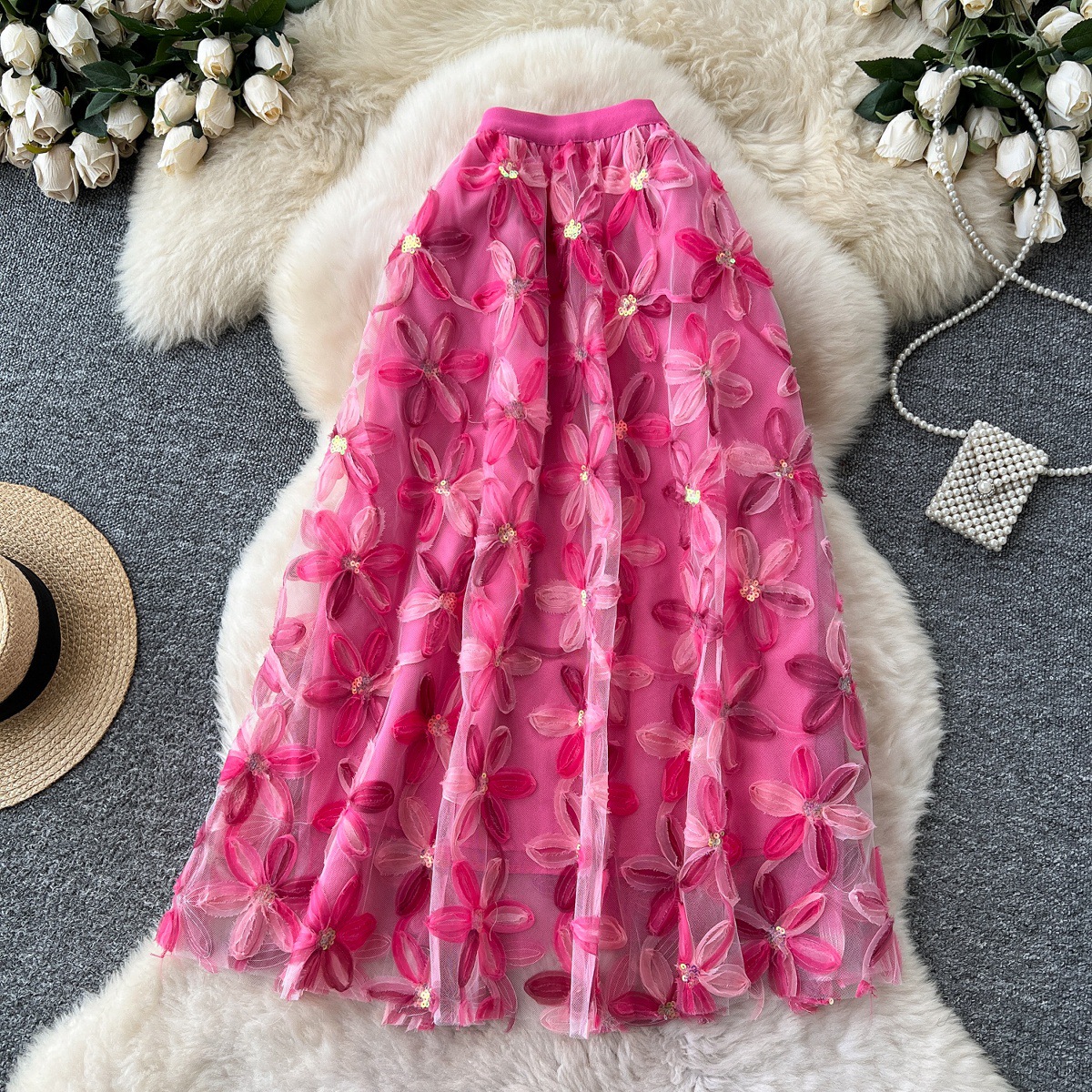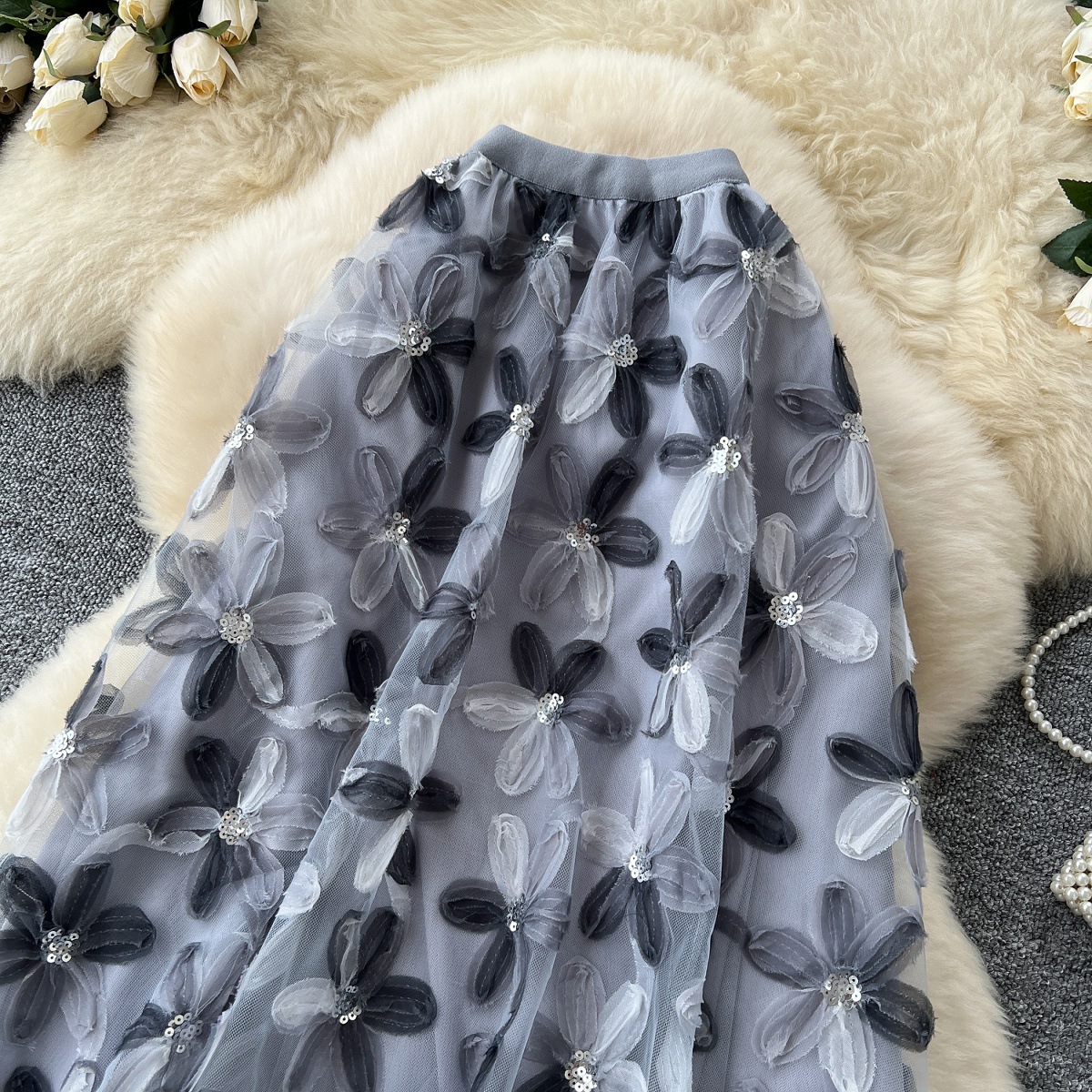 여름 여성을 위한 프렌치 로맨틱 분위기의 메쉬 스커트 신축성 있는 허리 입체 꽃 A라인 아름다운 롱 스커트