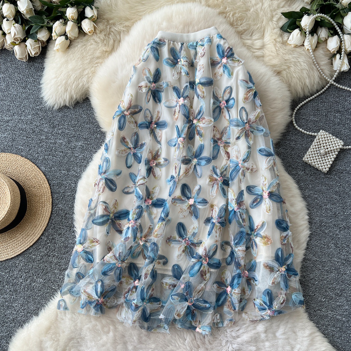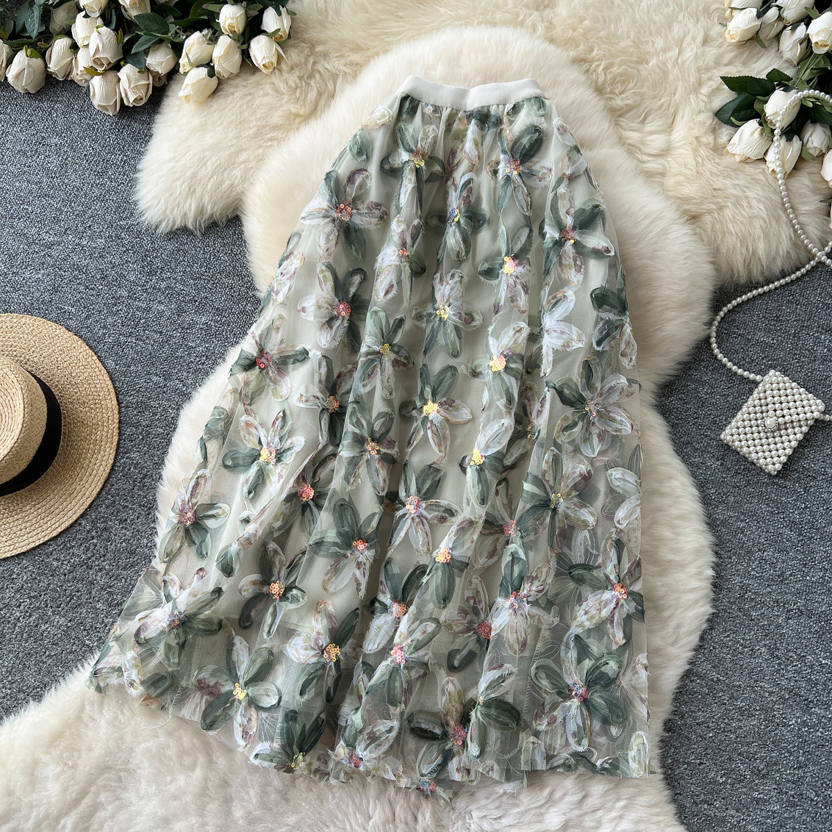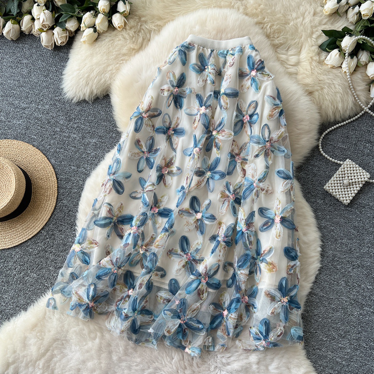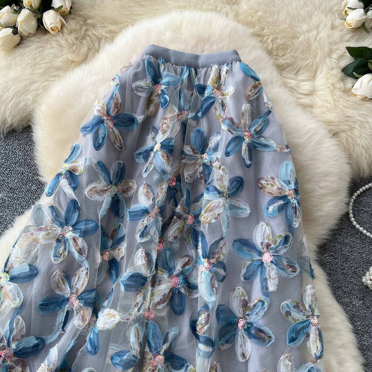 여름 여성을 위한 프렌치 로맨틱 분위기의 메쉬 스커트 신축성 있는 허리 입체 꽃 A라인 아름다운 롱 스커트