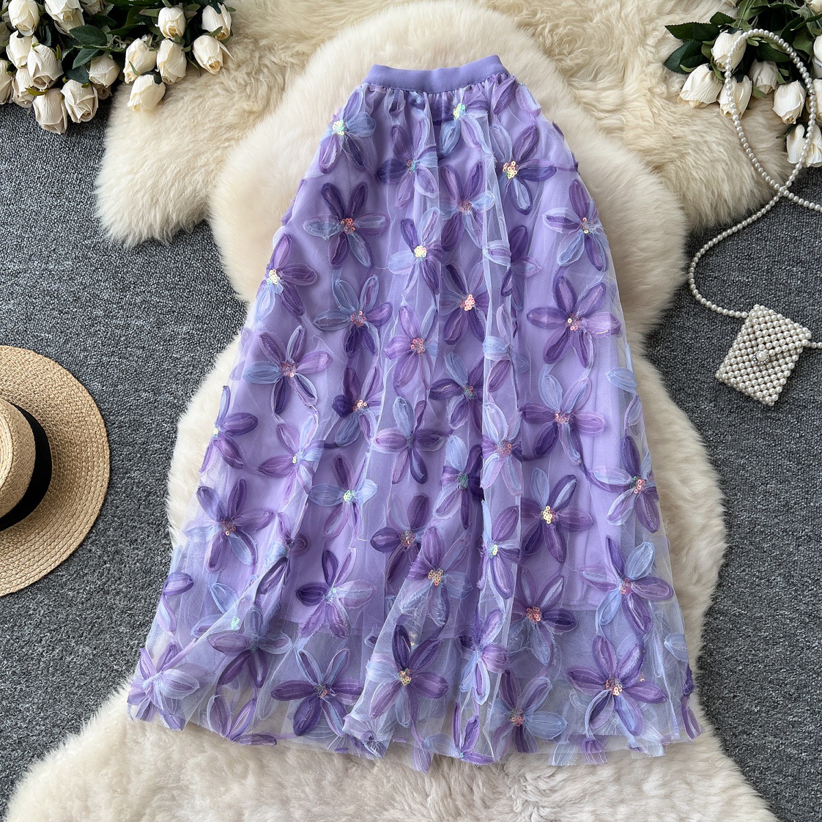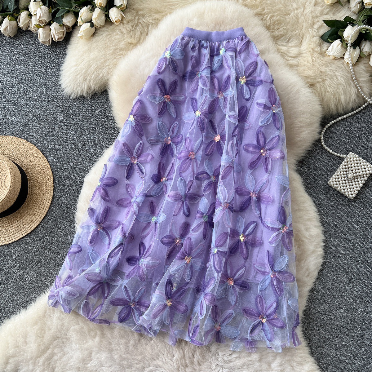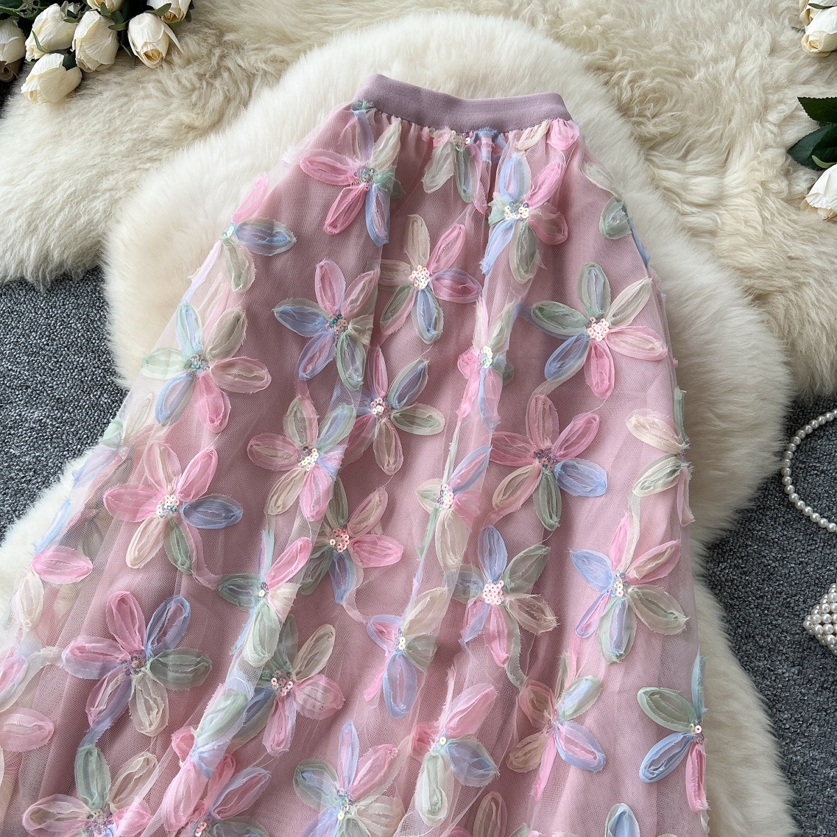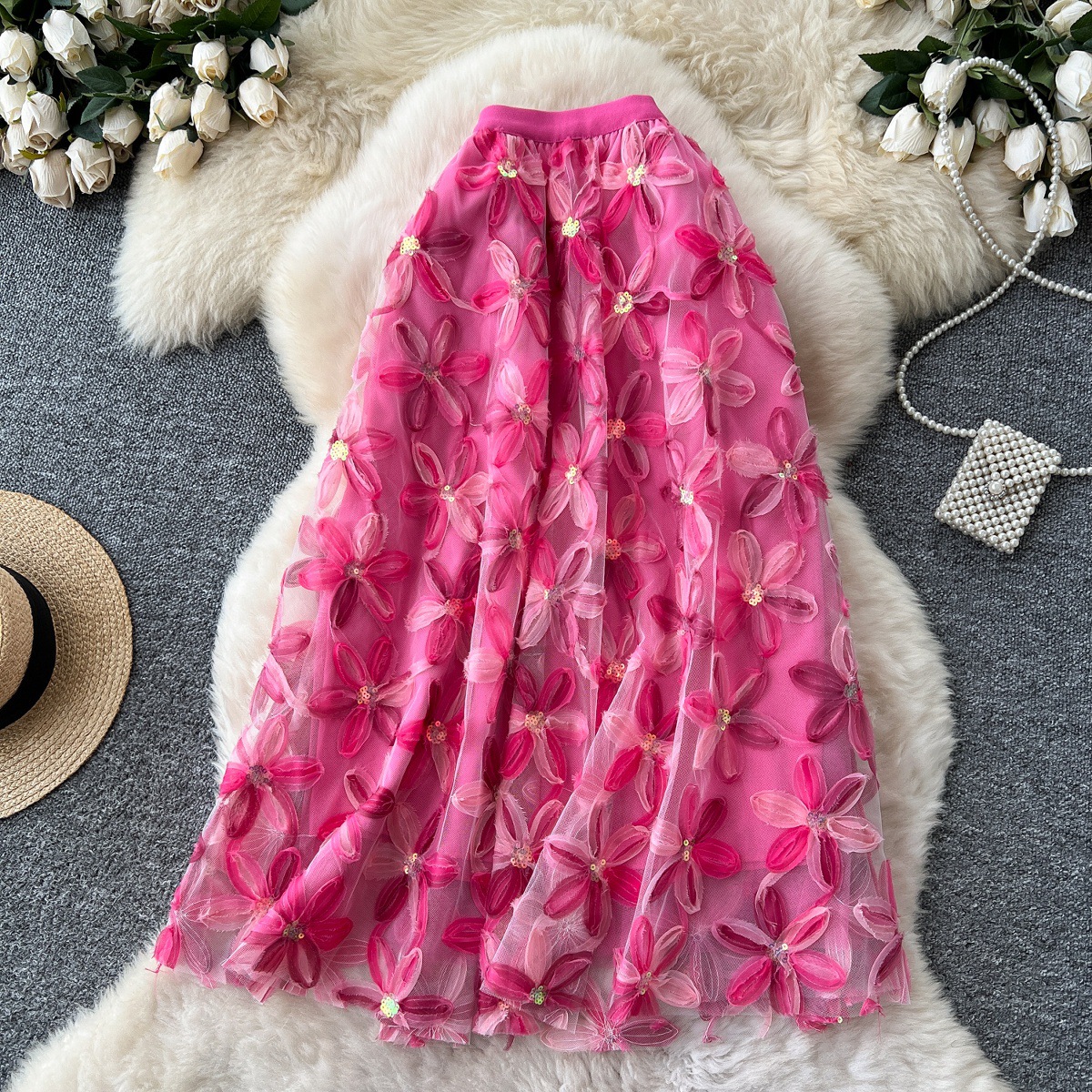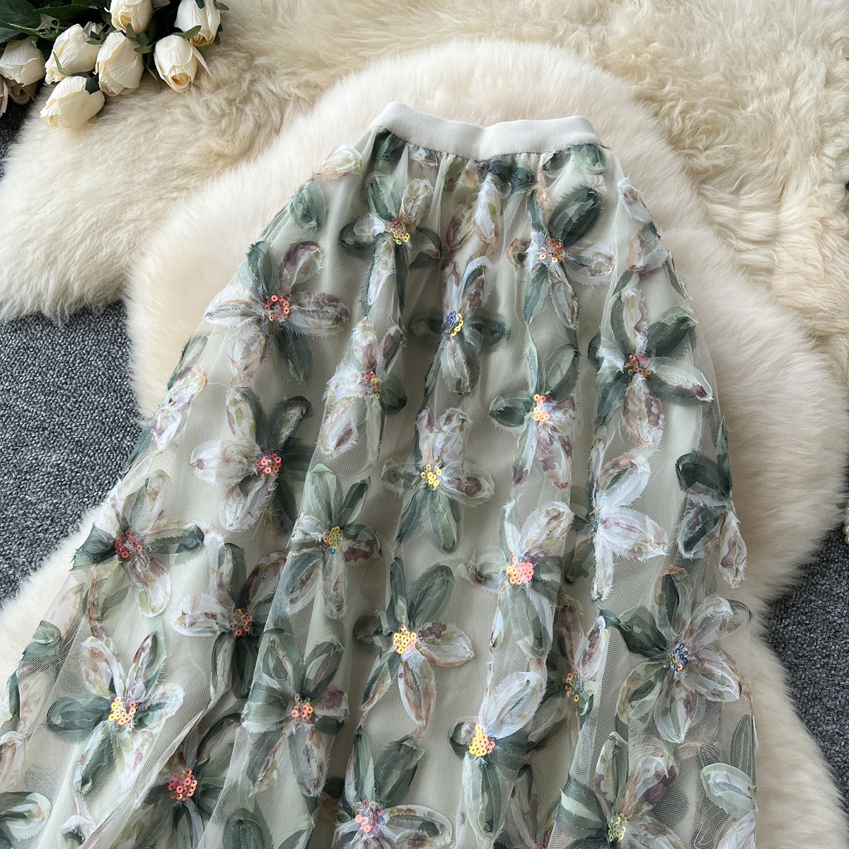 여름 여성을 위한 프렌치 로맨틱 분위기의 메쉬 스커트 신축성 있는 허리 입체 꽃 A라인 아름다운 롱 스커트