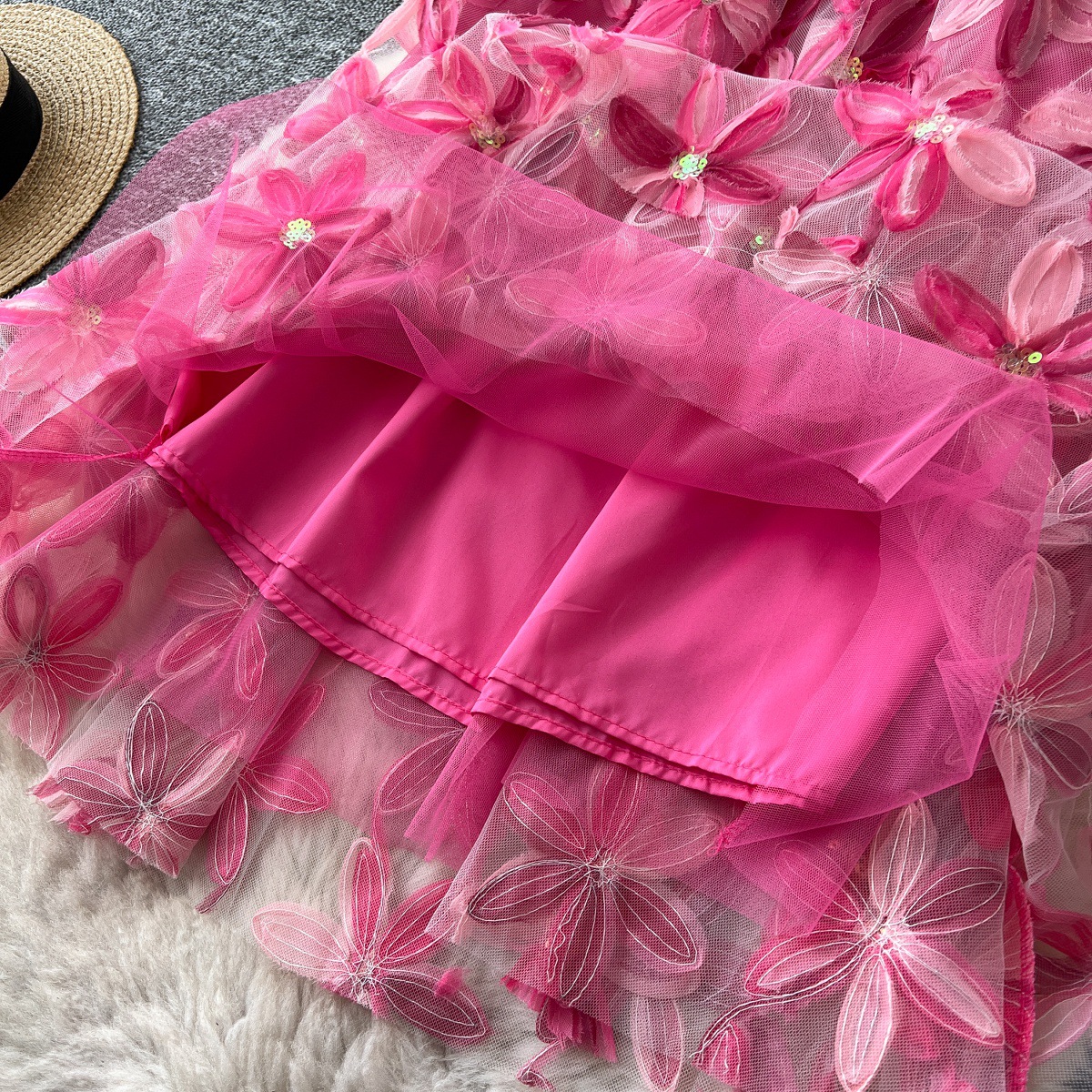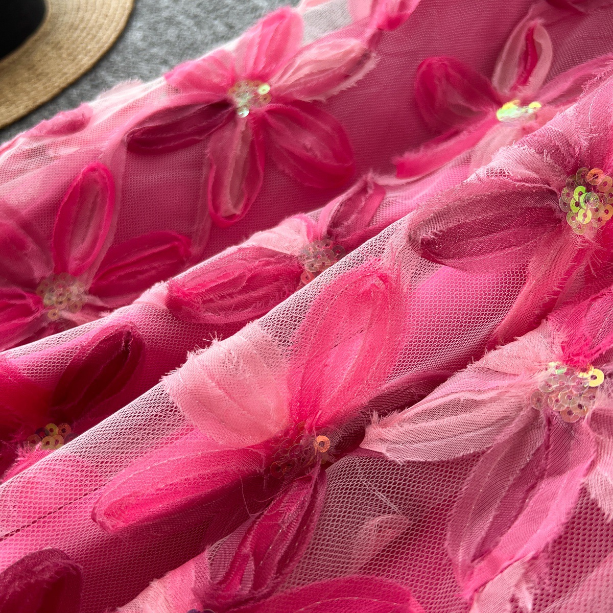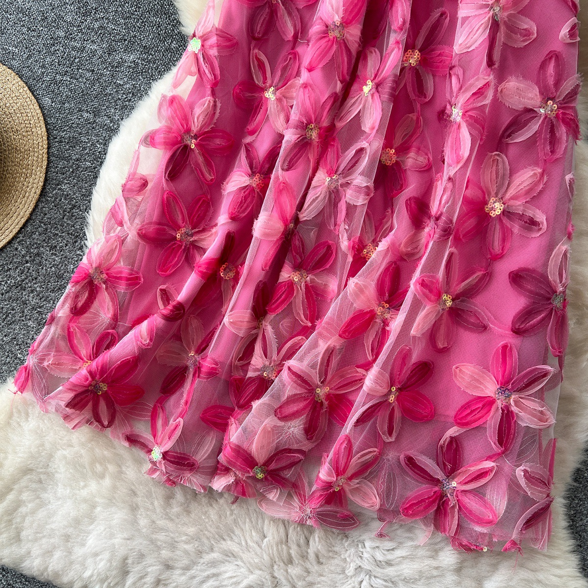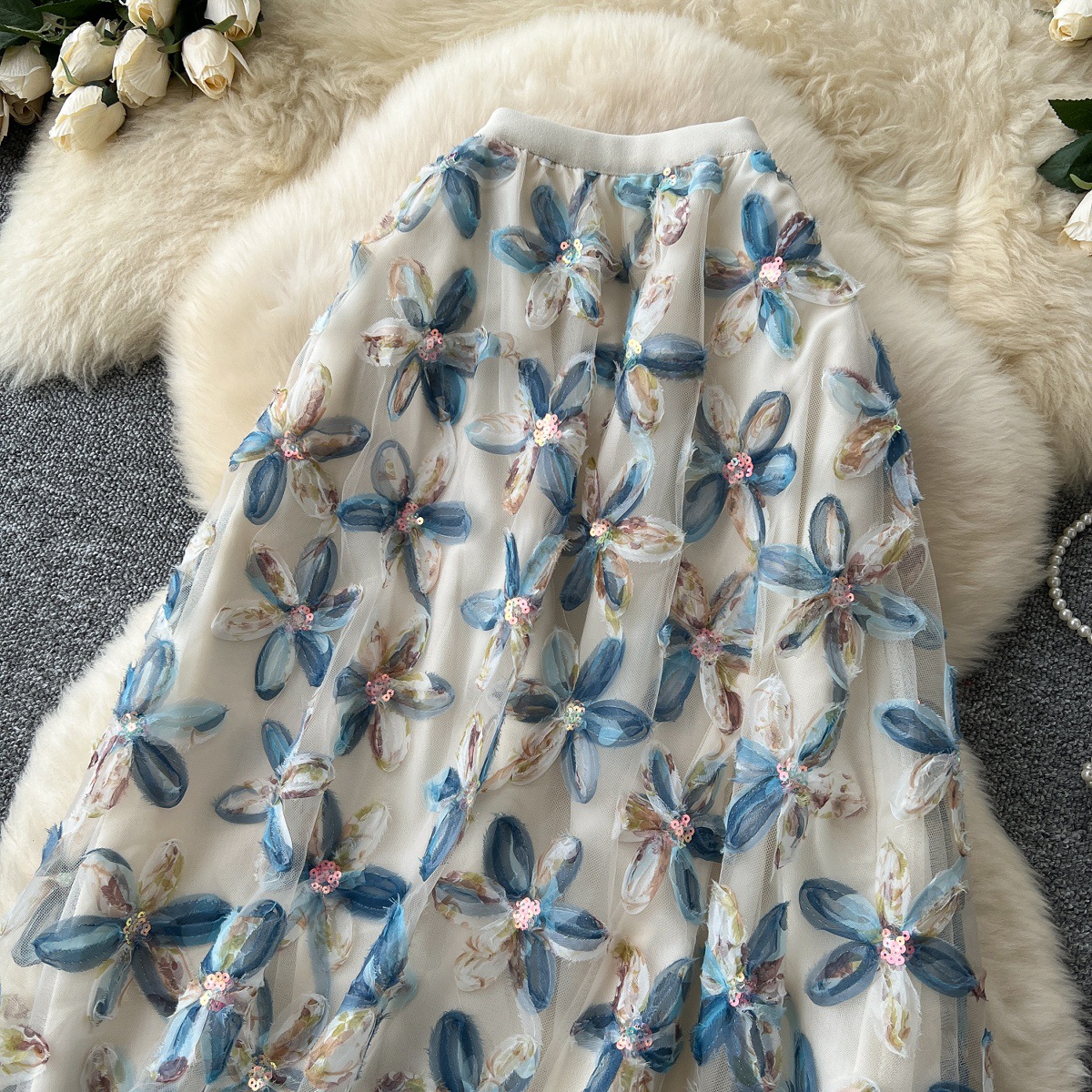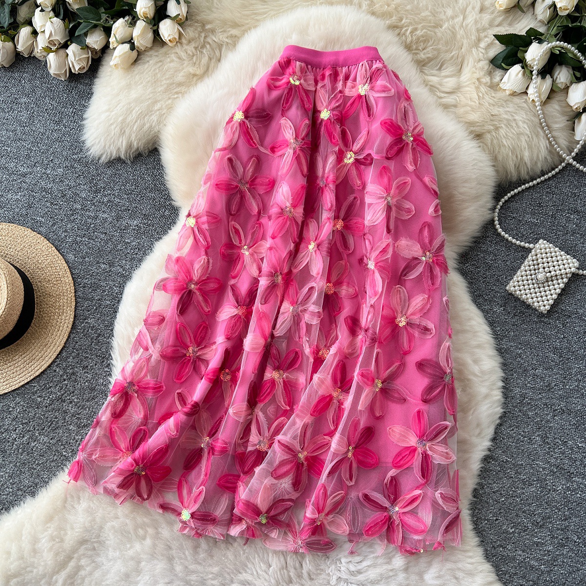 여름 여성을 위한 프렌치 로맨틱 분위기의 메쉬 스커트 신축성 있는 허리 입체 꽃 A라인 아름다운 롱 스커트