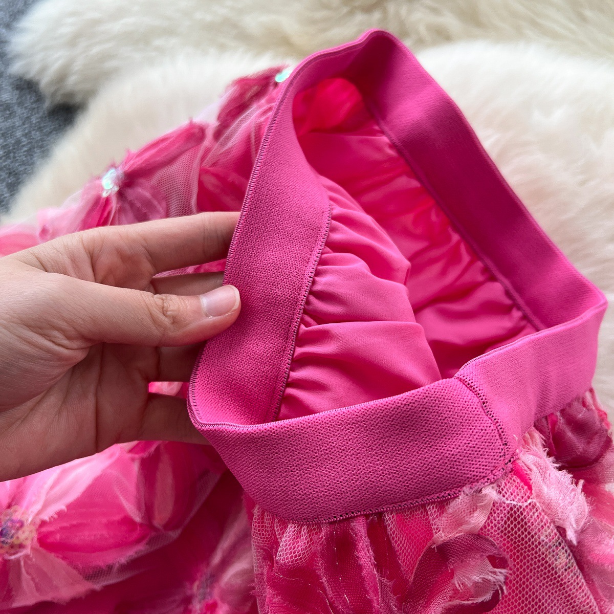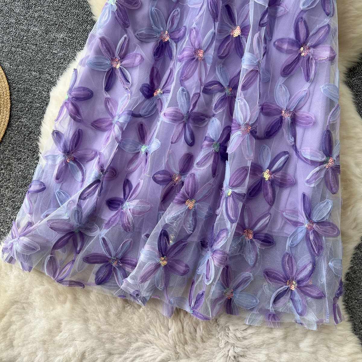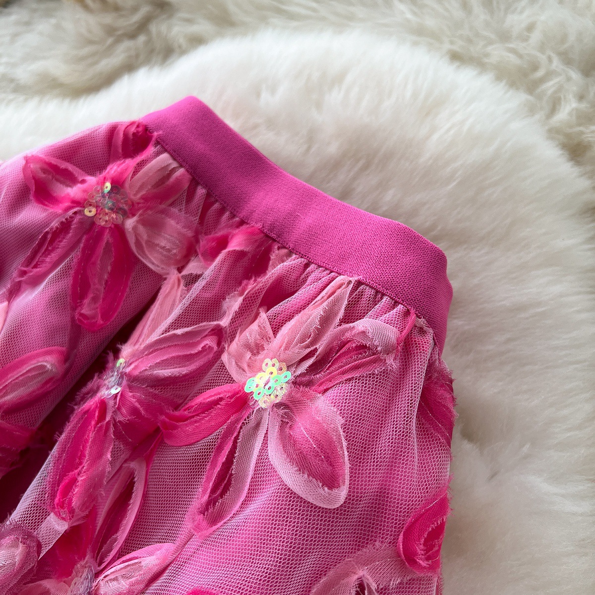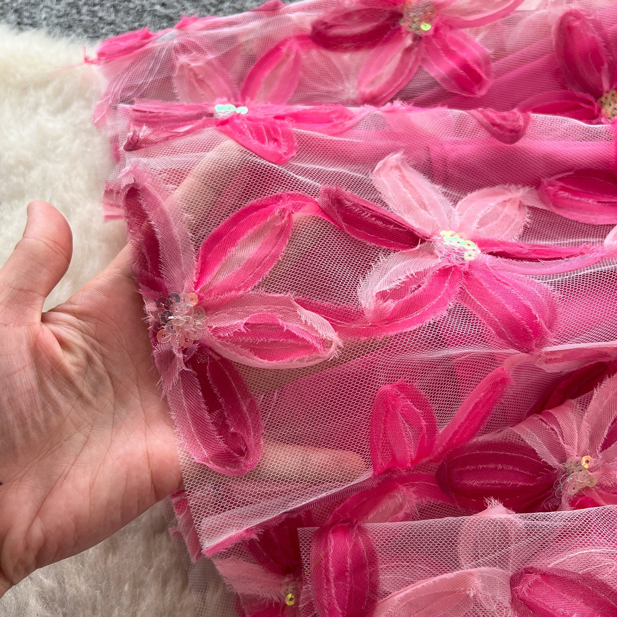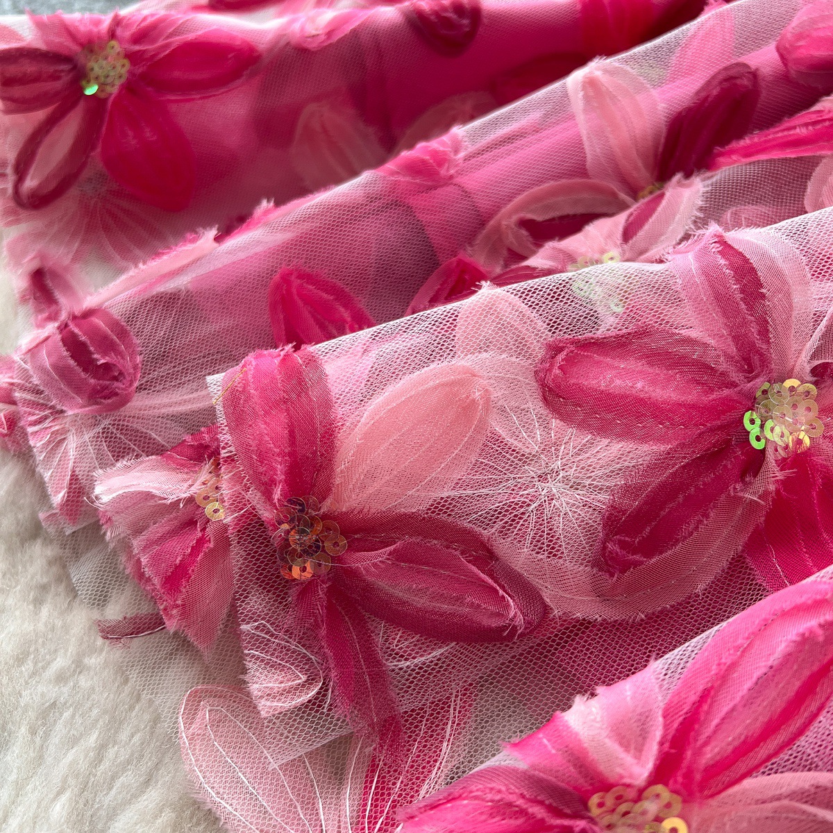 여름 여성을 위한 프렌치 로맨틱 분위기의 메쉬 스커트 신축성 있는 허리 입체 꽃 A라인 아름다운 롱 스커트