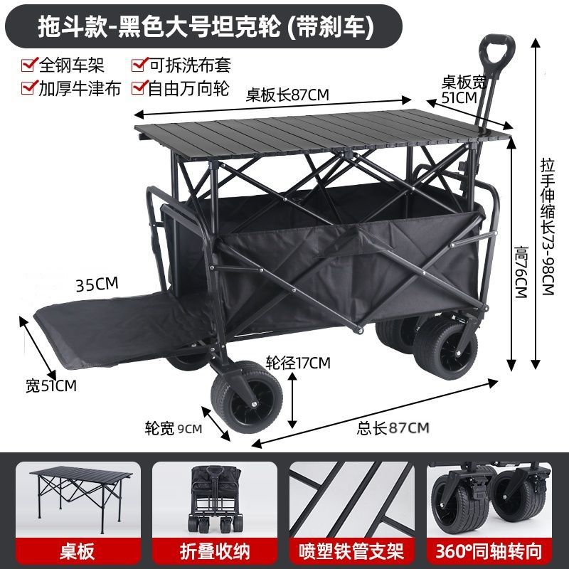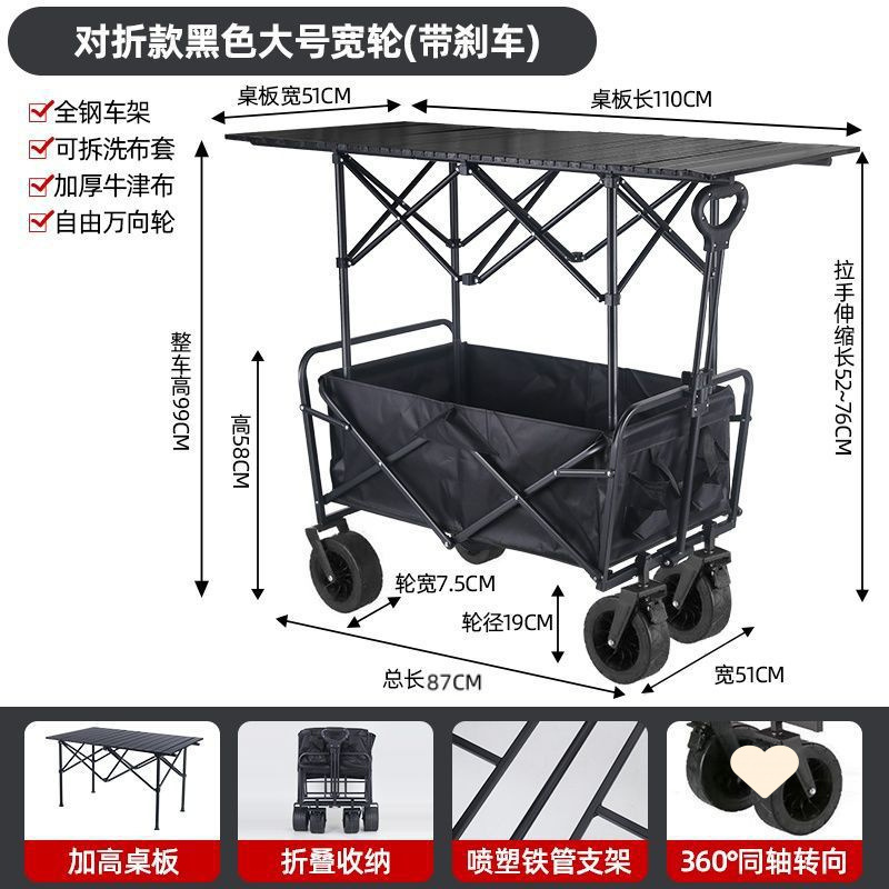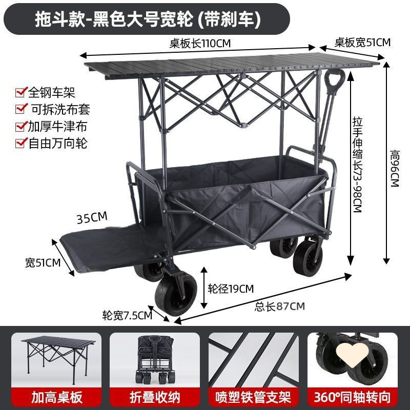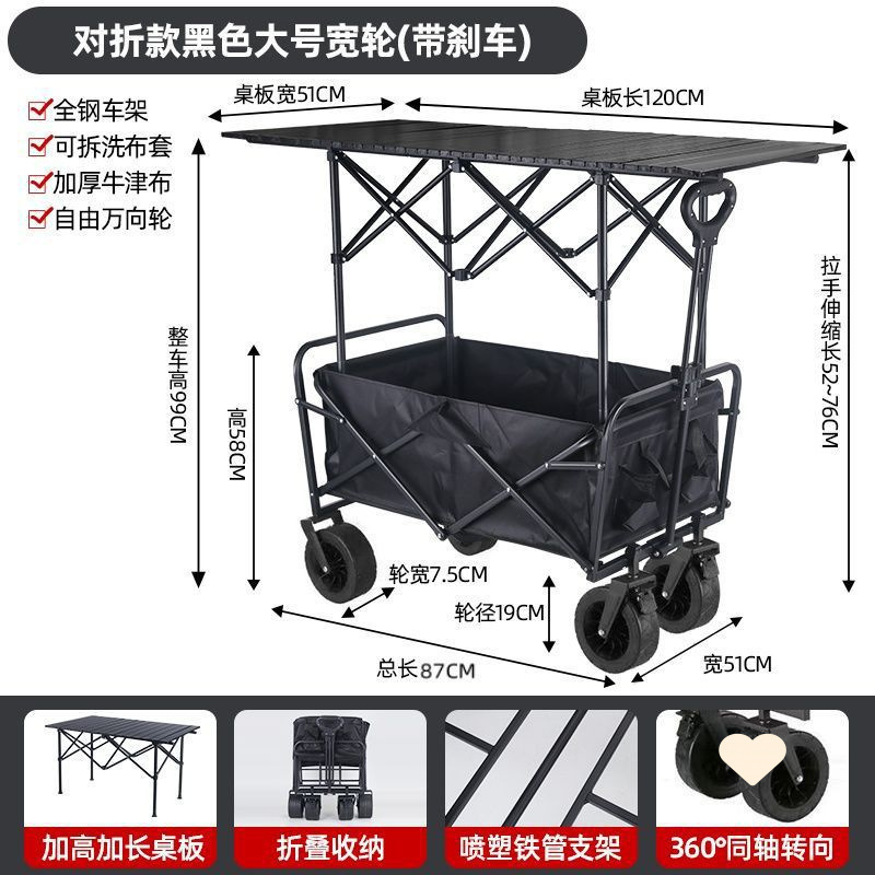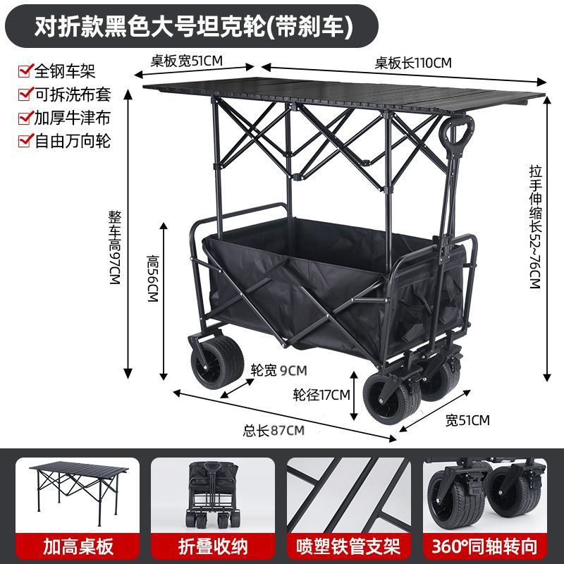 • 야외 캠핑카 + 확장 및 높이 조절 접이식 테이블 - 검정색/오프로드 휠/ 8inch 더블 브레이크 범용 휠