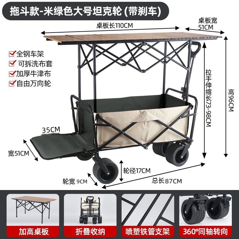• 야외 캠핑카 + 스톨 접이식 테이블 - 리어 플립 카키/오프로드 휠/더블 브레이크 유니버설 휠 8inch