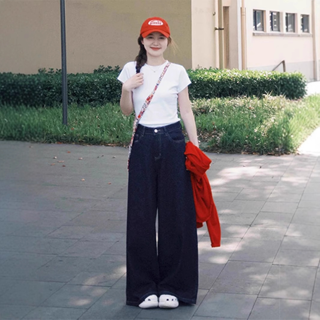 하이웨이스트 루즈 와이드 레그 다크블루 175시즌 여성용 하이진 여름 드레이프 바닥기장 팬츠 레트로 엑스트라롱 180스토어 가기