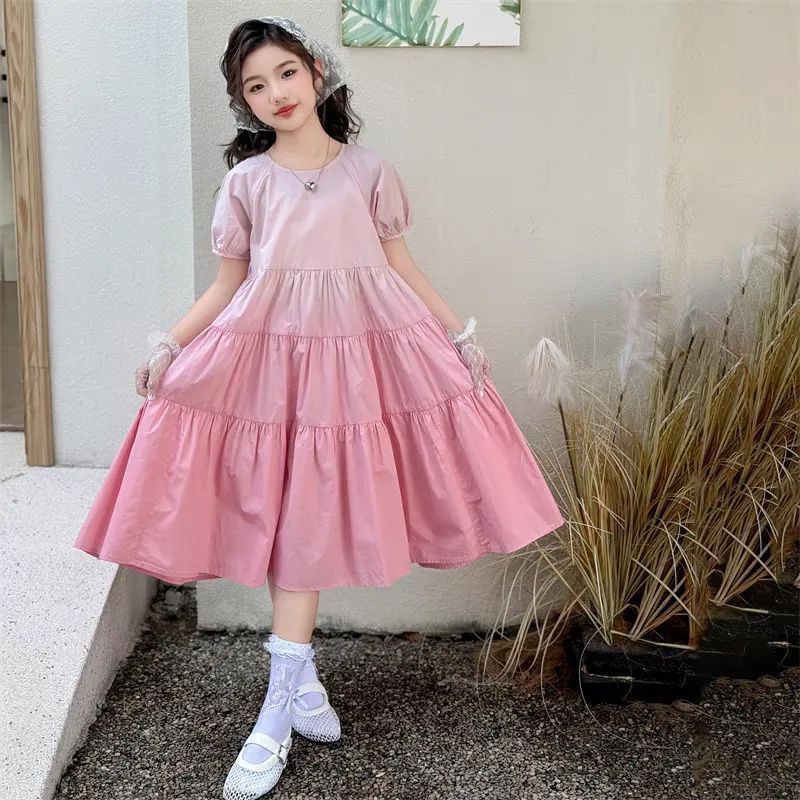 여자 여름 컬러 블록 그라데이션 드레스 2025 새로운 중대형 어린이 한국 스타일 롱 스커트 퍼프 슬리브 공주 드레스 Dropshipping