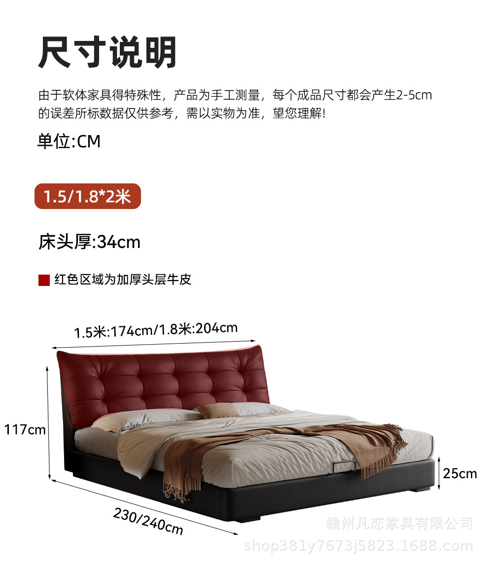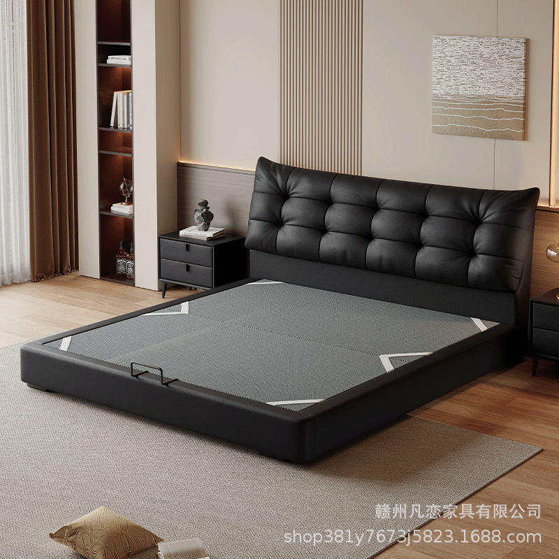 2025 새로운 스타일 이탈리아 심플한 1층 소가죽 침대, 작은 아파트 더블 침실 수납 하이박스 웨딩 침대