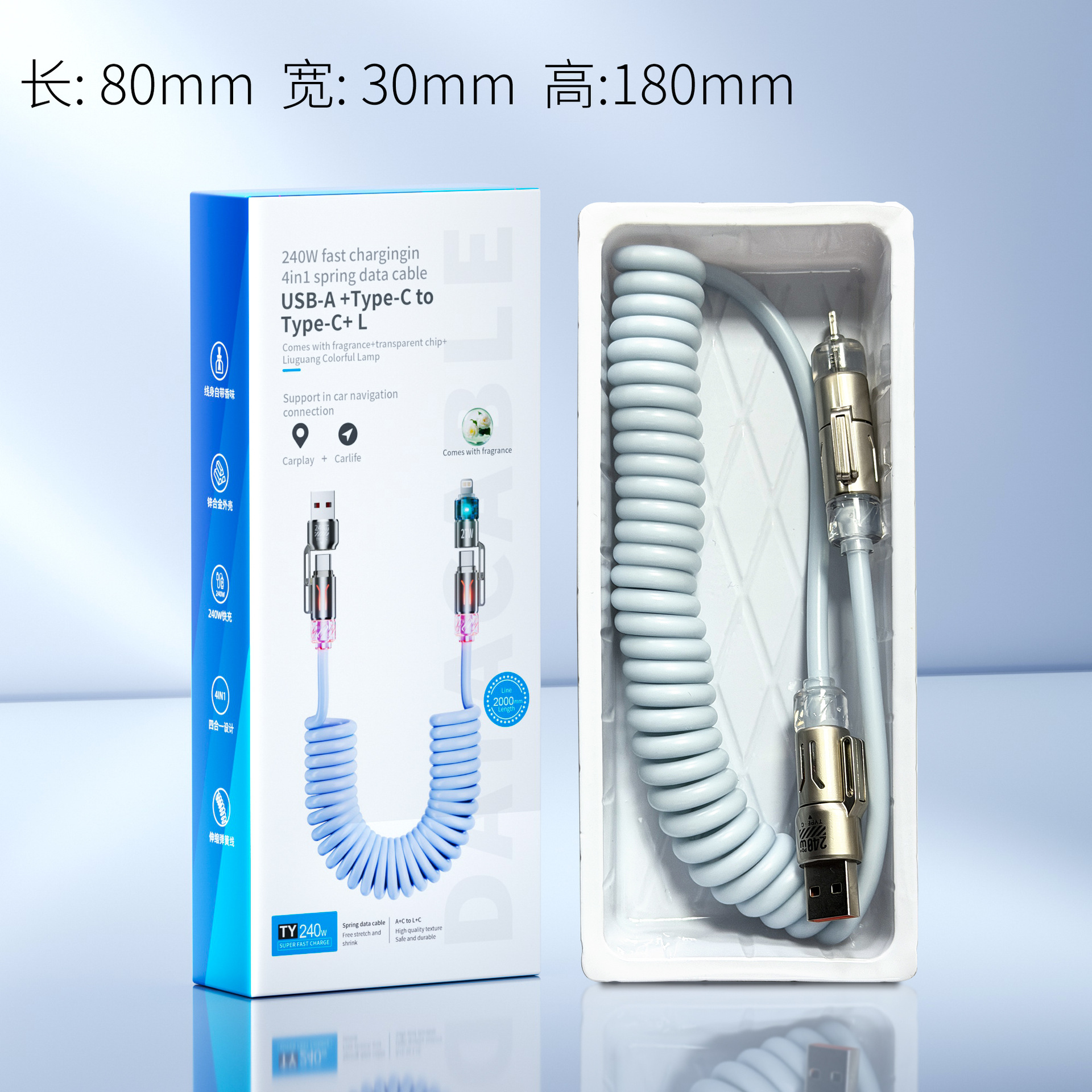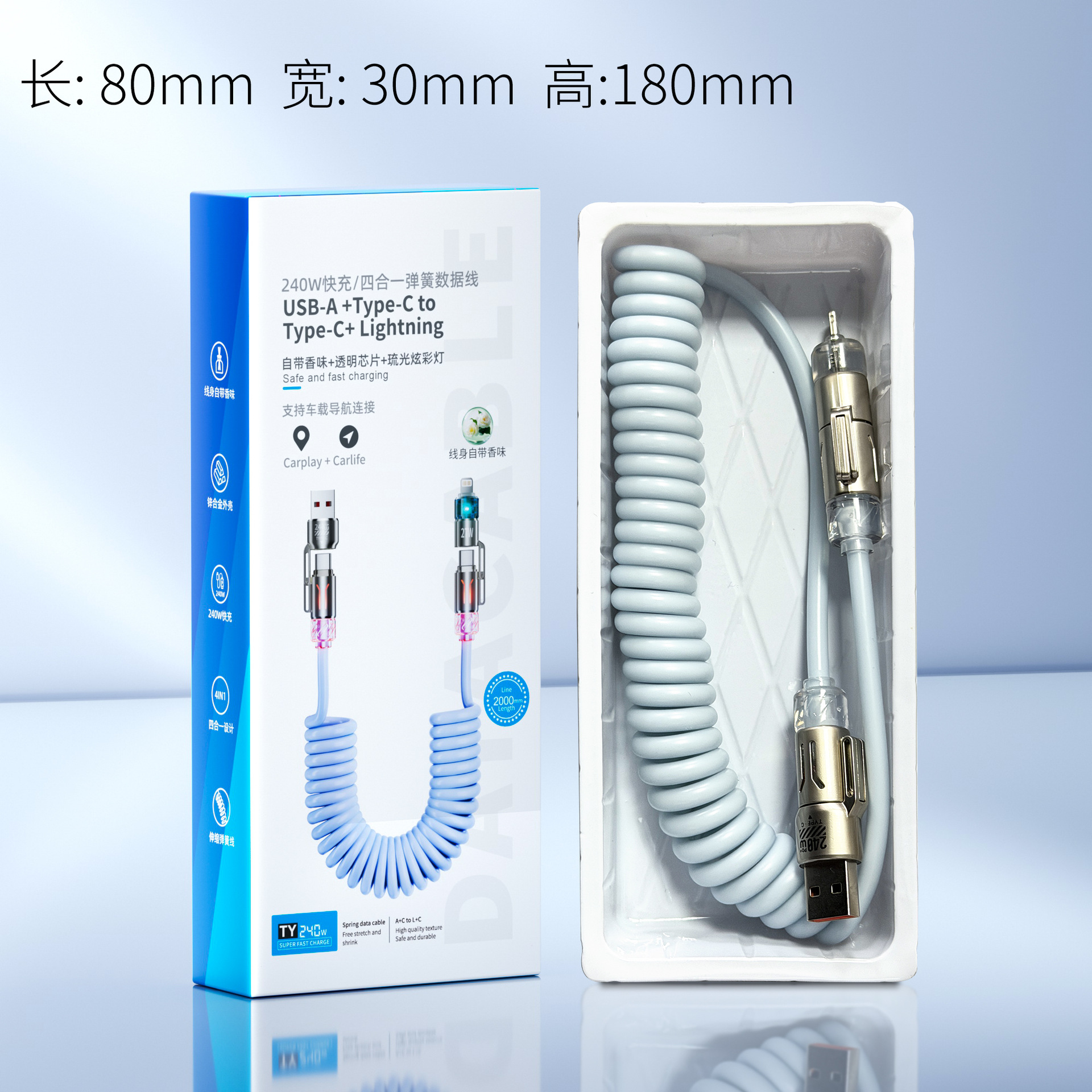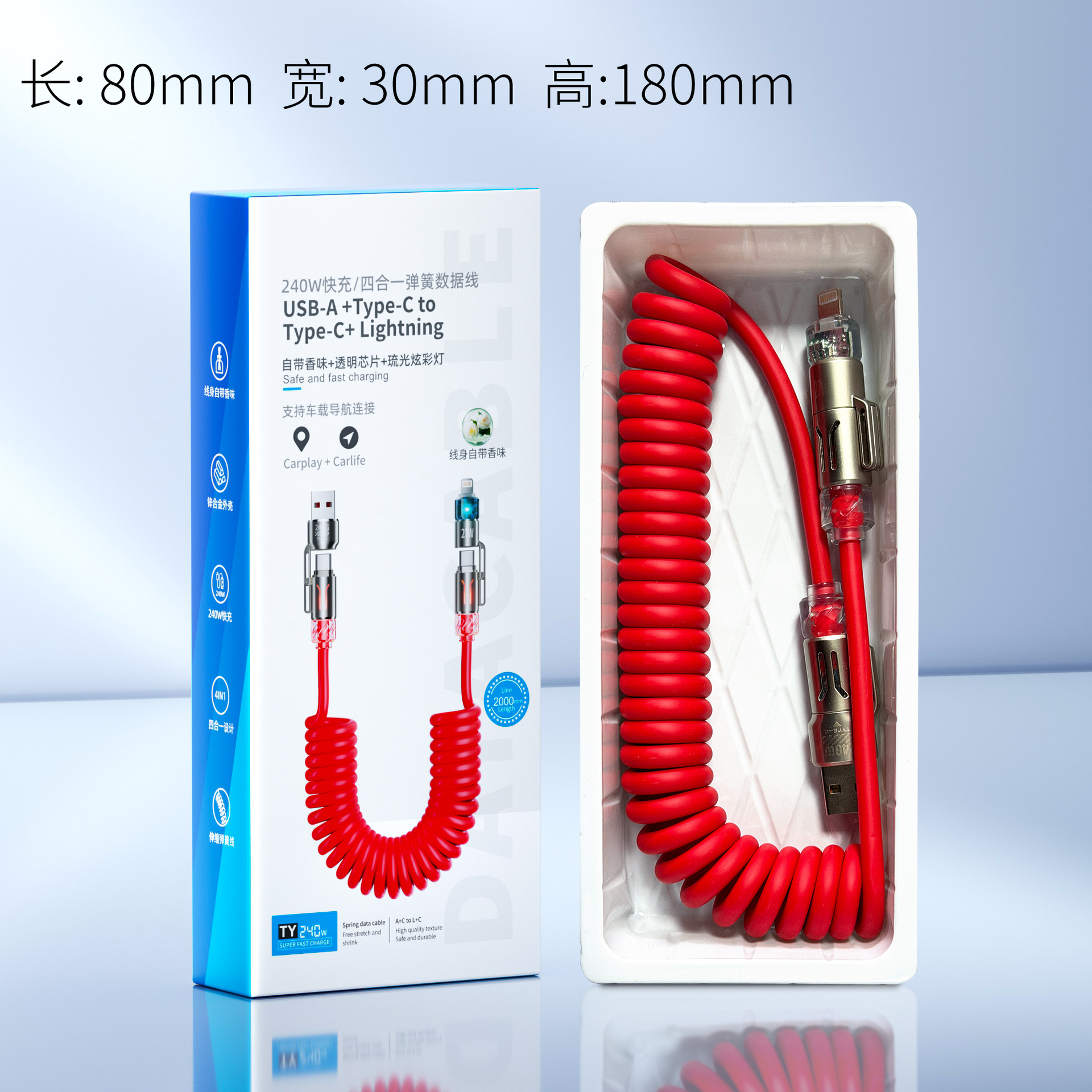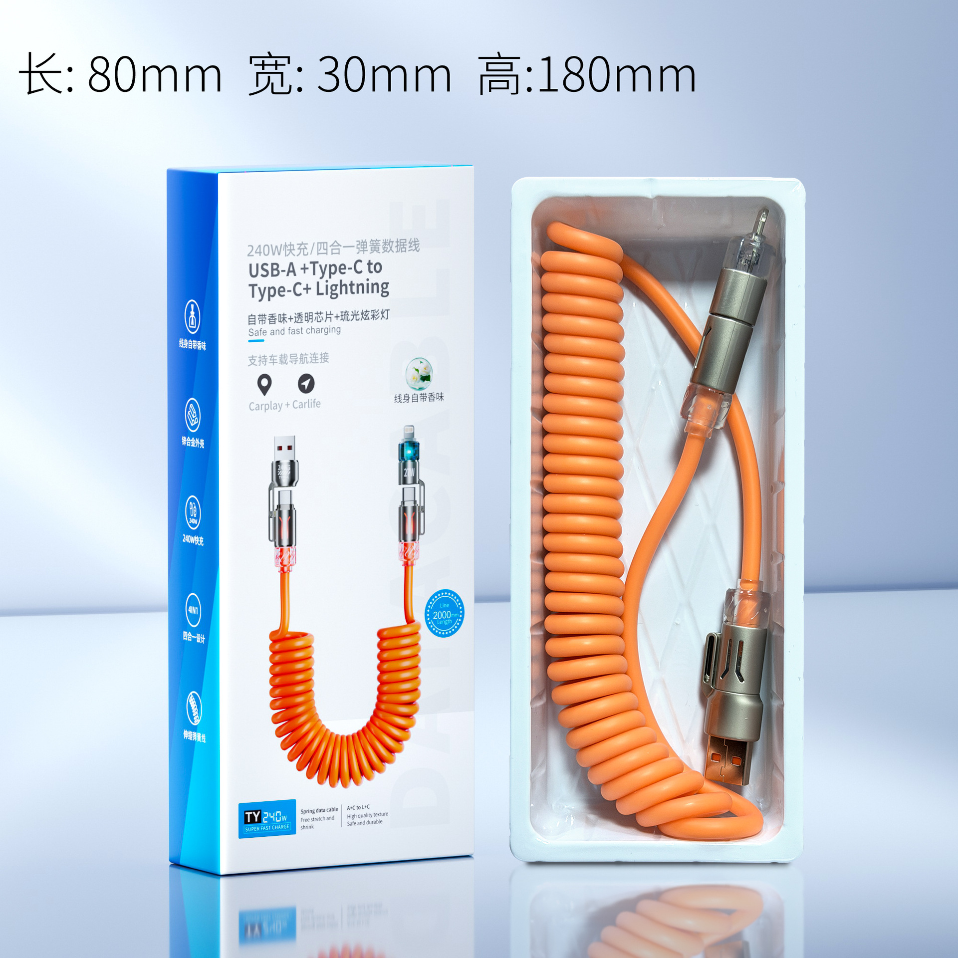适用于T2 T2-2 香薰弹簧数据线 数据线 充电线 车载 拉长 可伸缩 花香 香味发光 四合一 二拖二 超级快充 安卓数据线 240w 65w 66w 100w 120w 150w 双typec type-c Type-cto Lightning 传输数据 平板充电线 笔记本充电 百度CarLife/carplay 车载导航 车载投屏