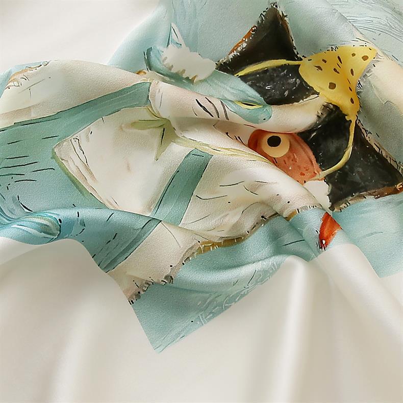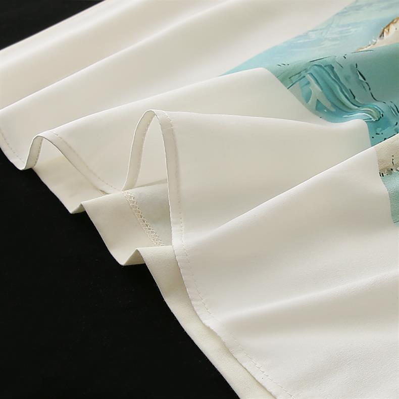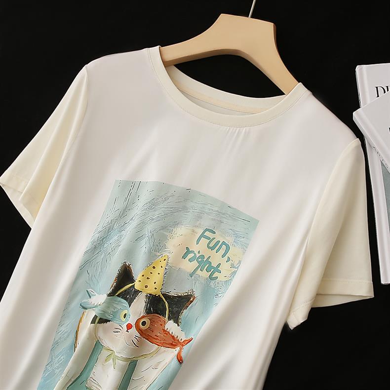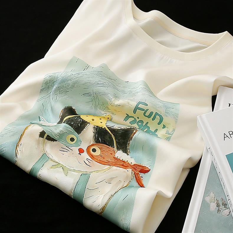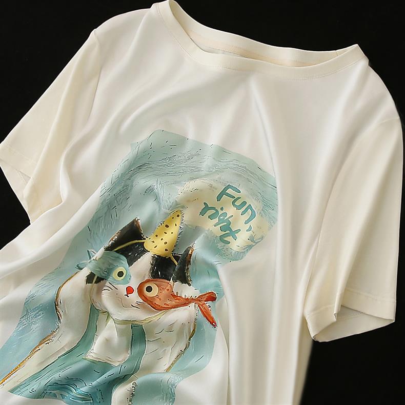몸에 좋은 느낌이에요! 멀버리 실크 + 면 스플라이싱 = 편안하고 땀 흡수 및 통기성이 뛰어난 ~ 여성용 프린트 스트레이트 라운드 넥 반팔 티셔츠