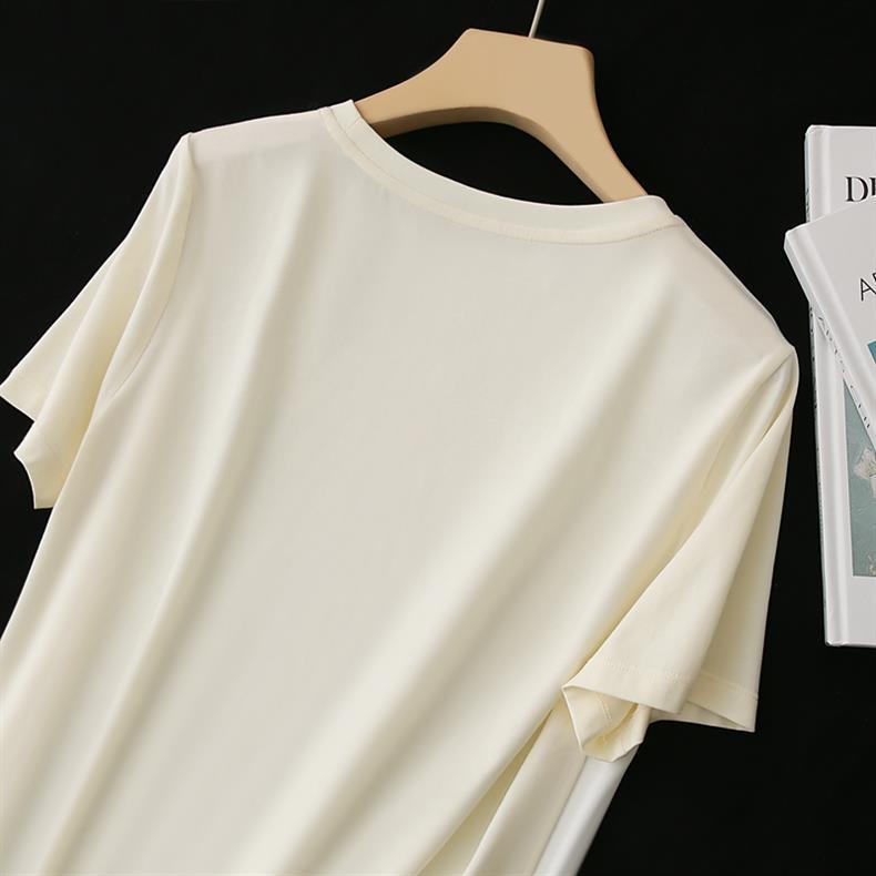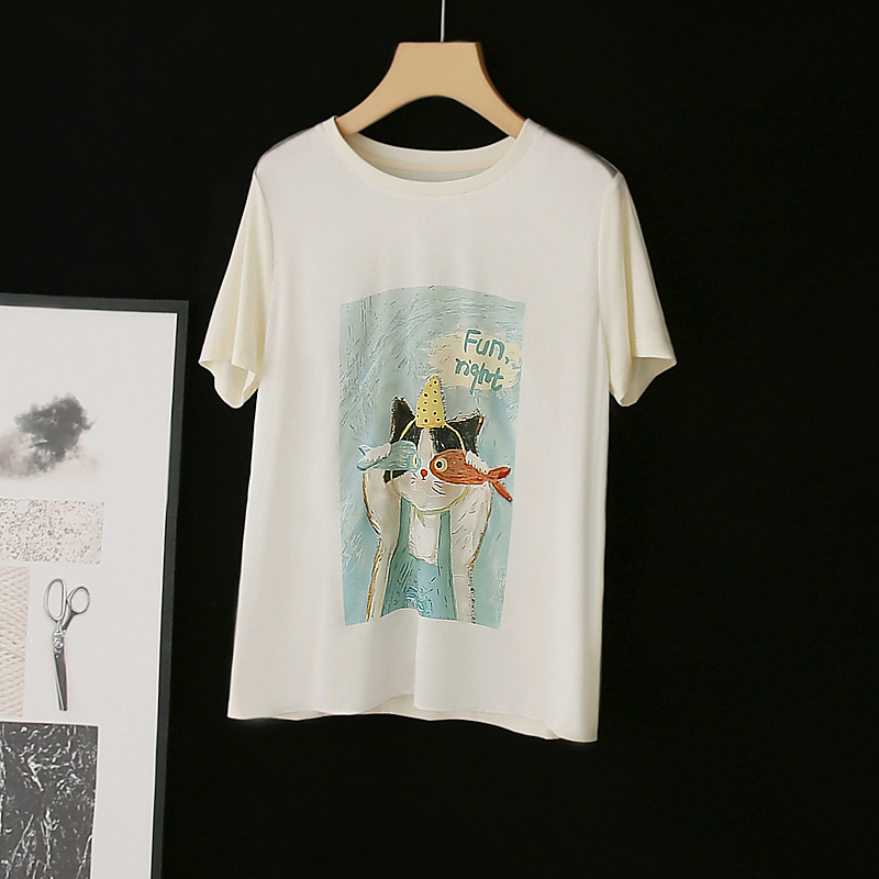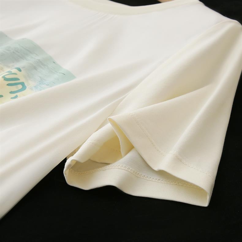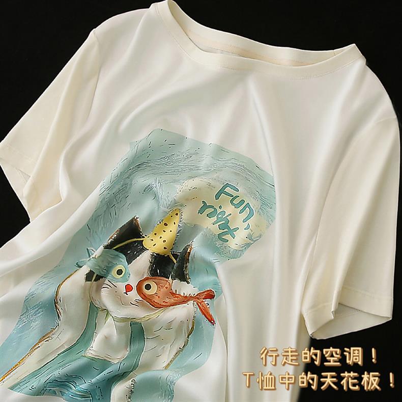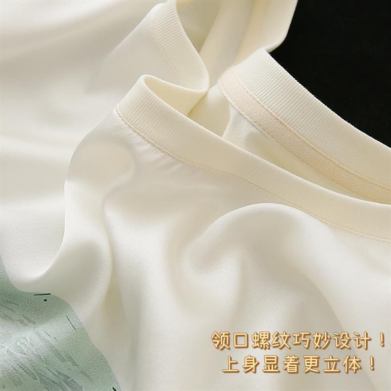 몸에 좋은 느낌이에요! 멀버리 실크 + 면 스플라이싱 = 편안하고 땀 흡수 및 통기성이 뛰어난 ~ 여성용 프린트 스트레이트 라운드 넥 반팔 티셔츠스토어 가기