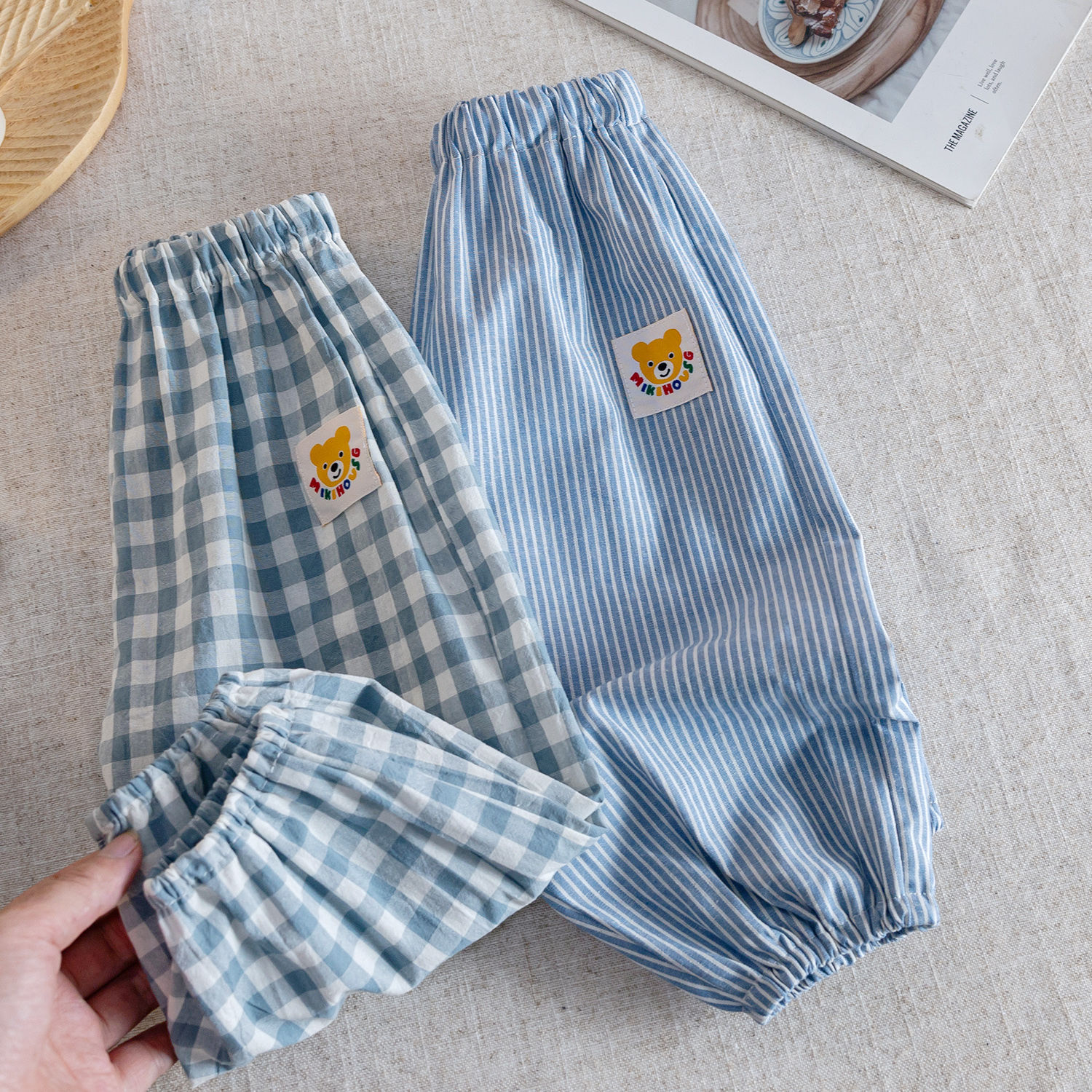 아동용 바지 여름 얇은 소년 캐주얼 바지 일본 만화 다목적 줄무늬 격자 무늬 모기 방지 바지 아기 바지스토어 가기