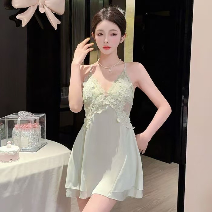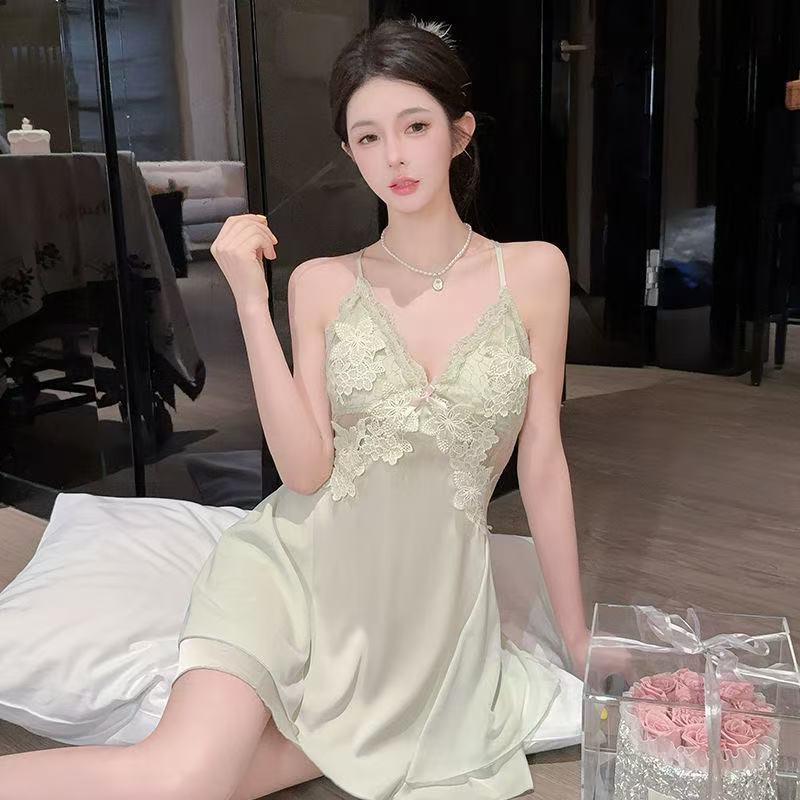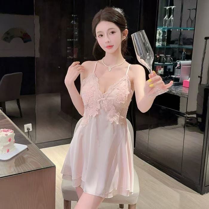 여성을위한 섹시한 잠옷 2025 여름 얇은 가슴 패드 달콤한 얼음 실크 아름다운 뒤 레이스 서스펜더 잠옷