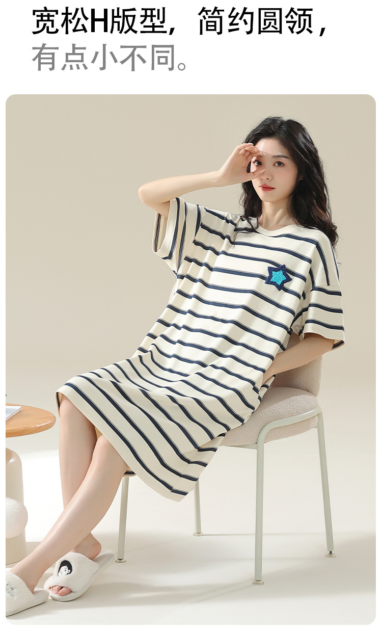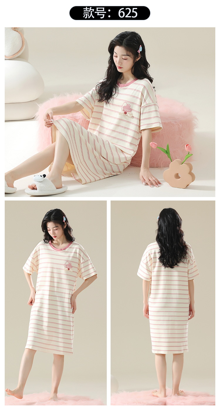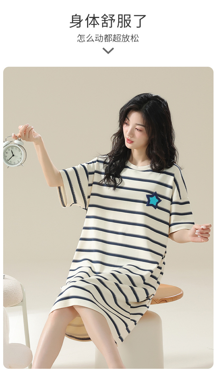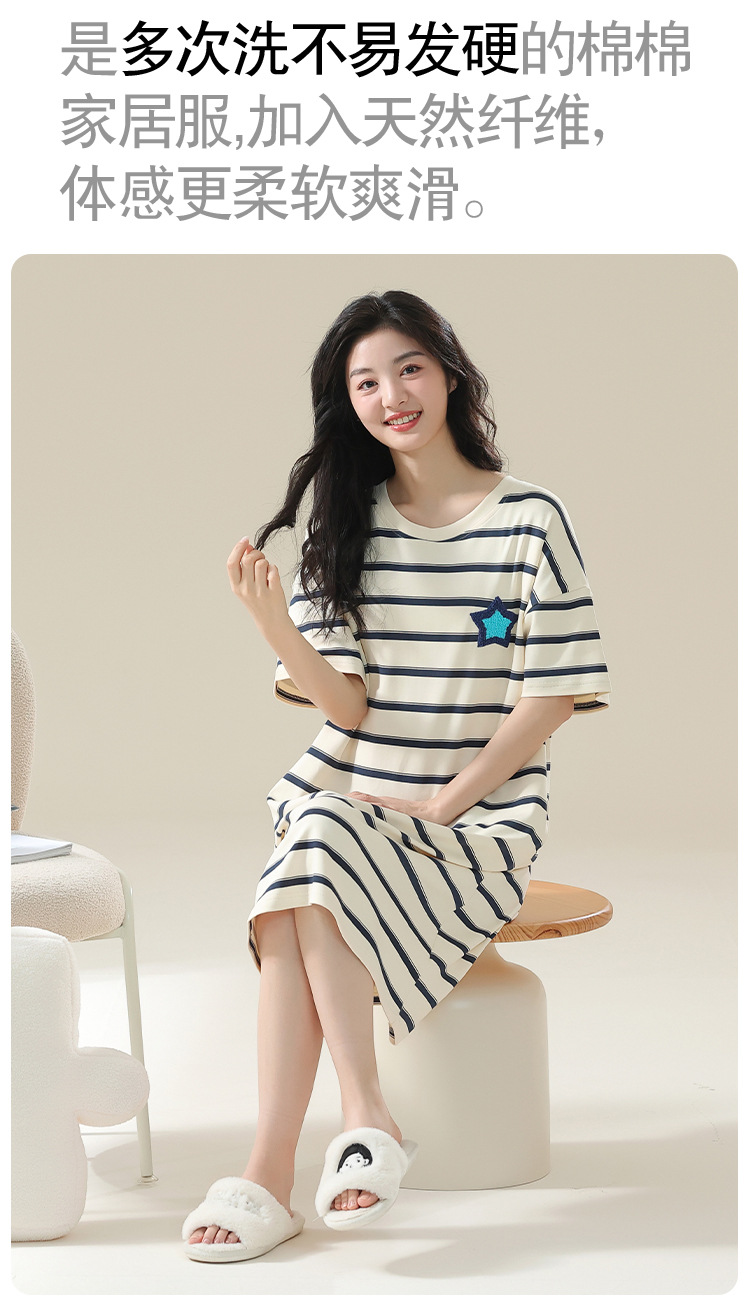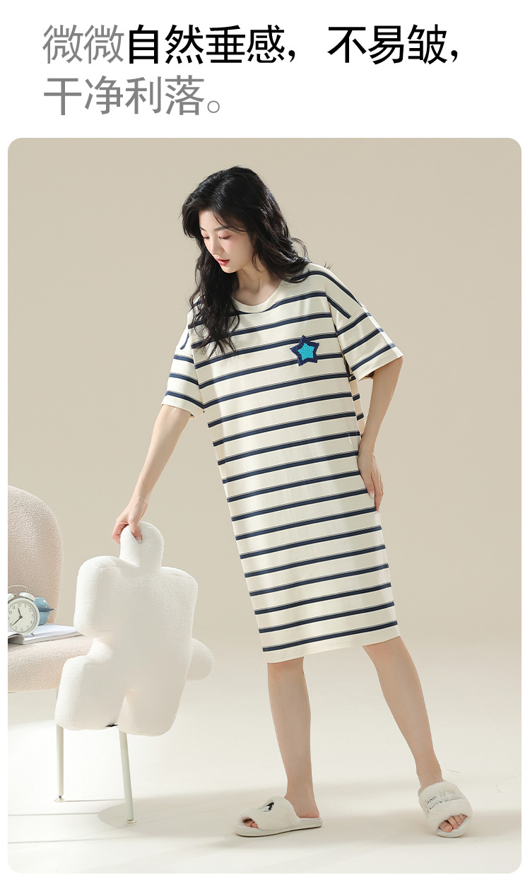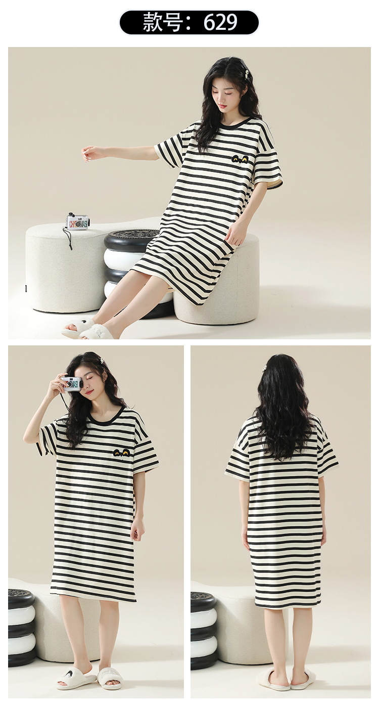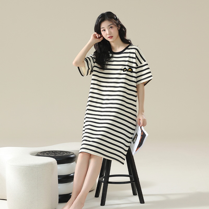 7A 항균 코튼 잠옷 여름 여성 반팔 얇은 드레스 스트라이프 웨어러블 중간 길이 플러스 사이즈 잠옷스토어 가기