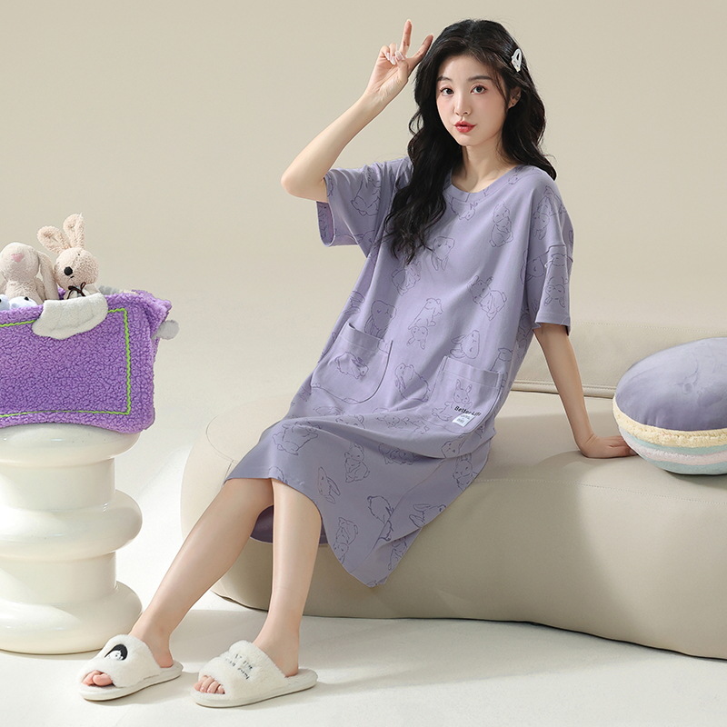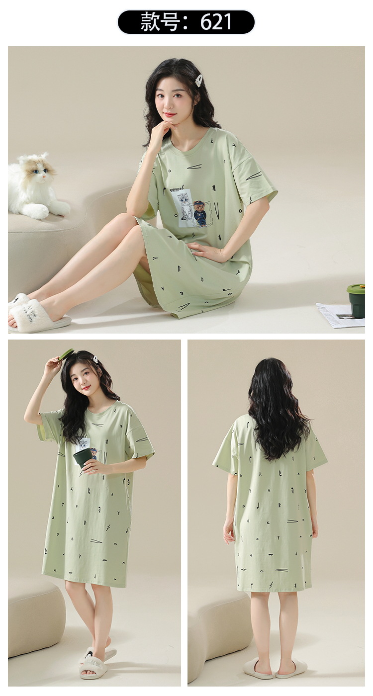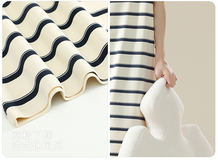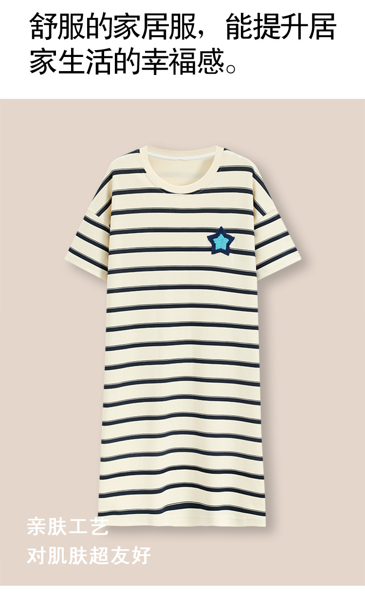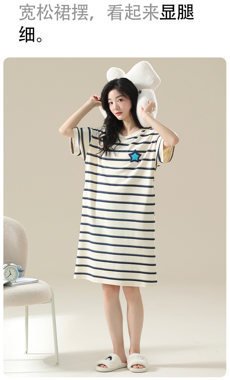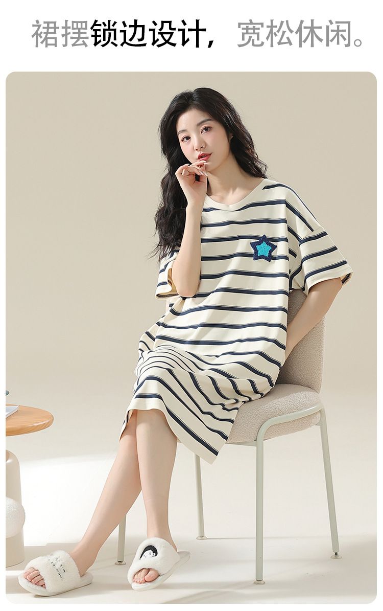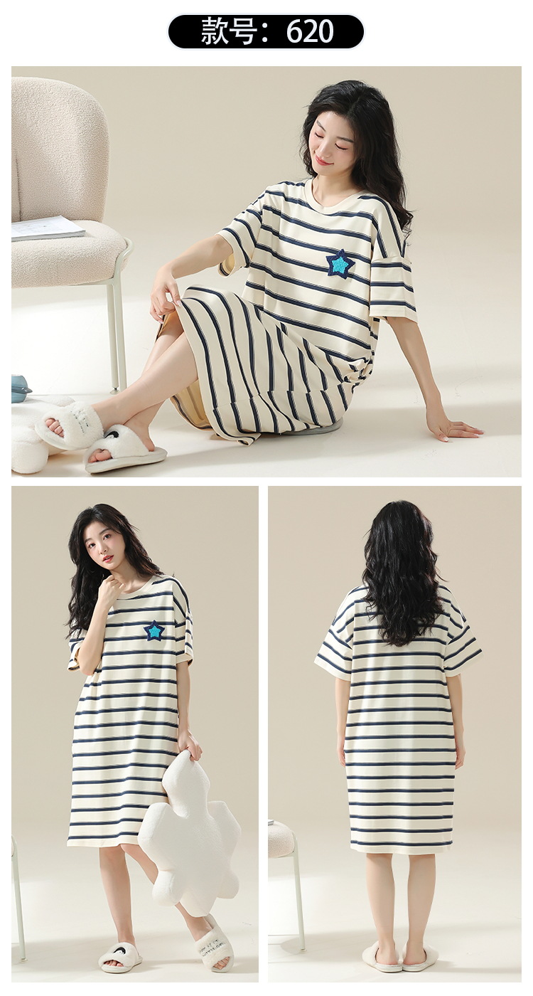 7A 항균 코튼 잠옷 여름 여성 반팔 얇은 드레스 스트라이프 웨어러블 중간 길이 플러스 사이즈 잠옷스토어 가기