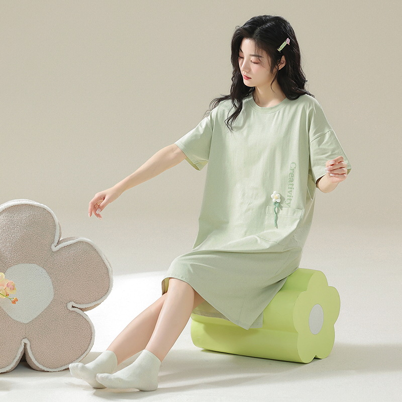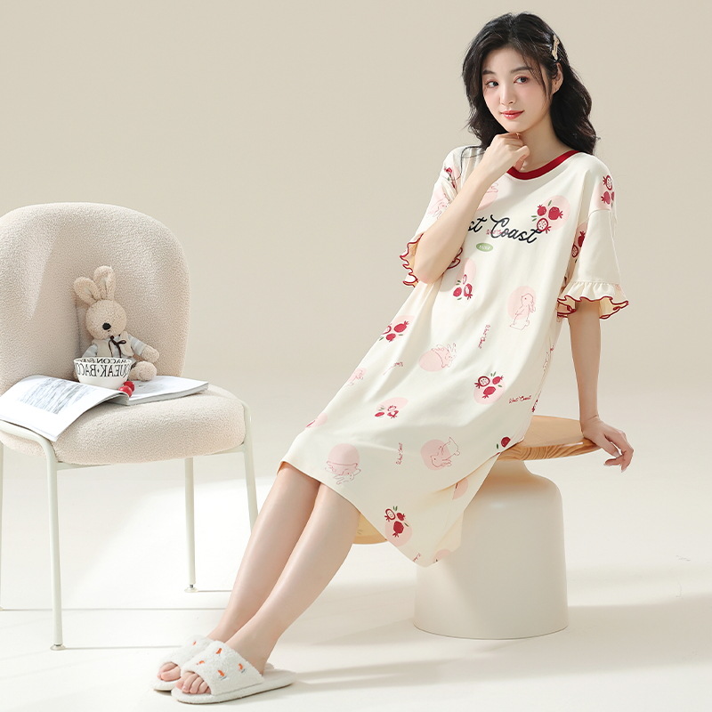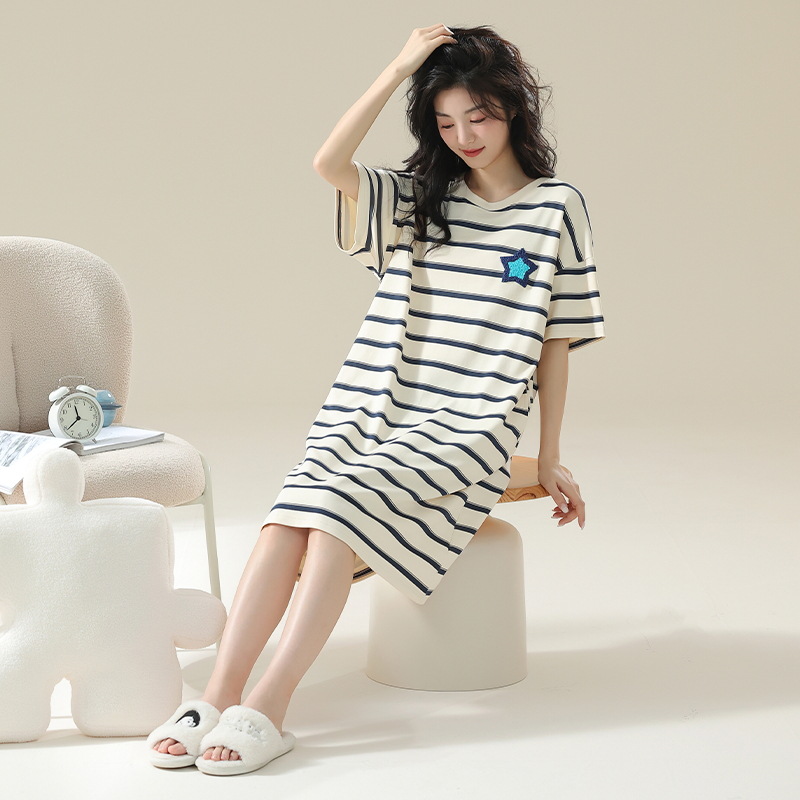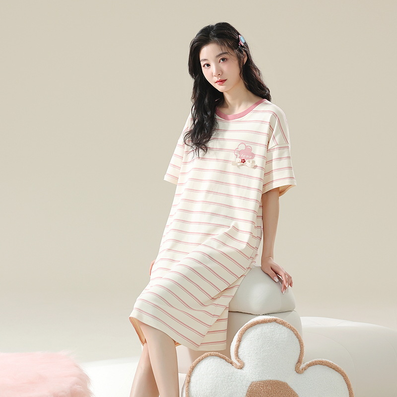 7A 항균 코튼 잠옷 여름 여성 반팔 얇은 드레스 스트라이프 웨어러블 중간 길이 플러스 사이즈 잠옷