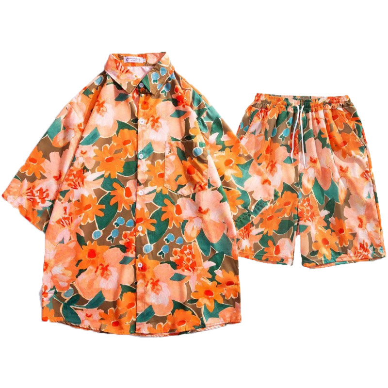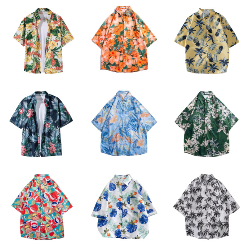 하와이 부모-자식 꽃무늬 셔츠 반팔 소년 소녀 느슨한 복고풍 녹색 해변 어머니-자식 복장 홍콩 스타일 복고풍스토어 가기