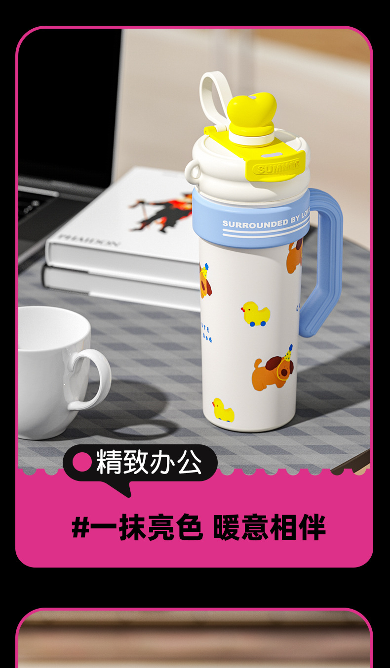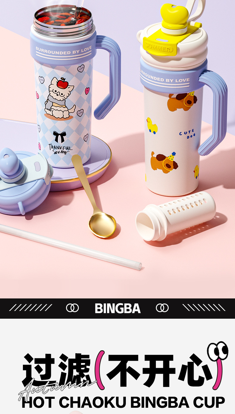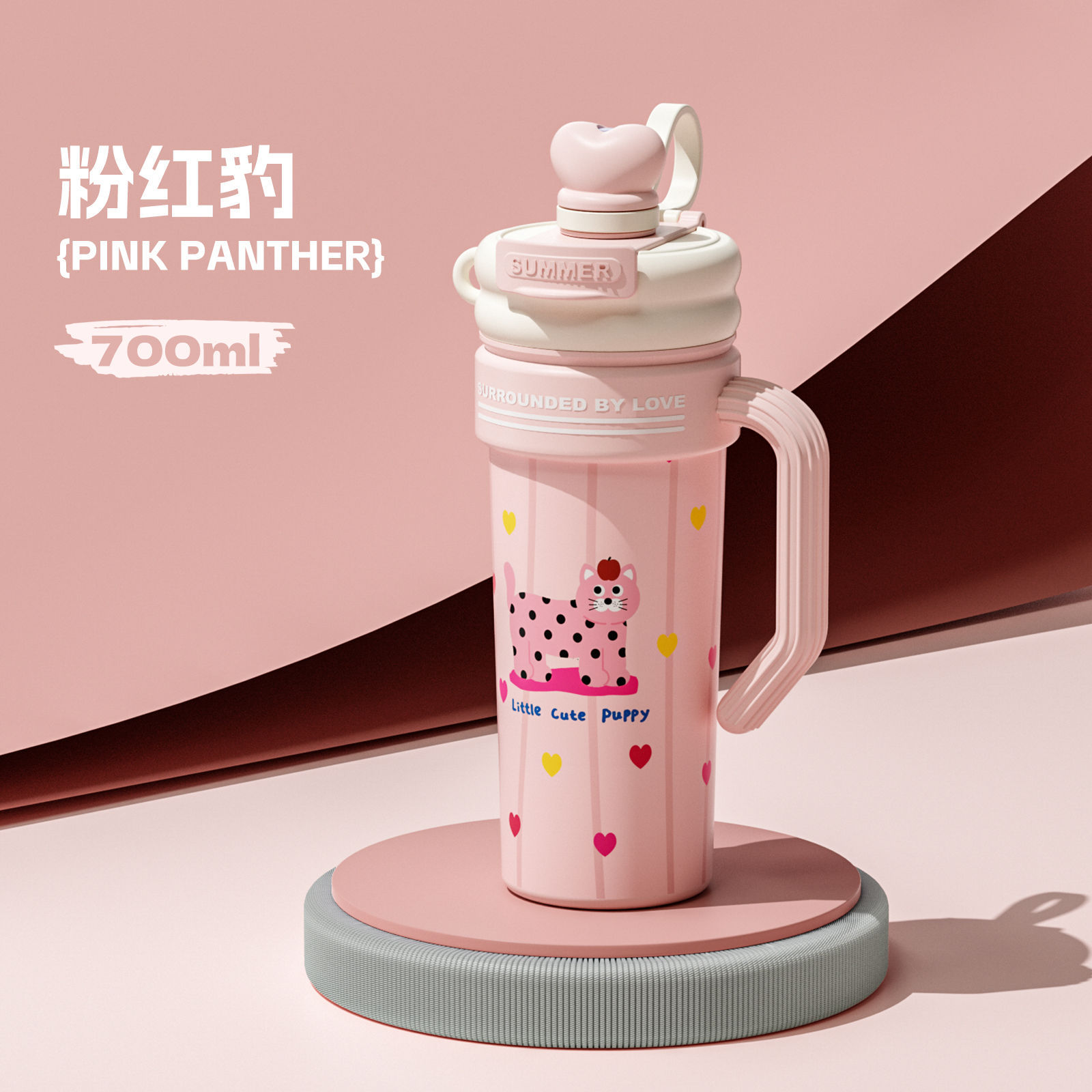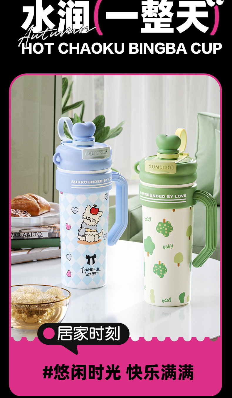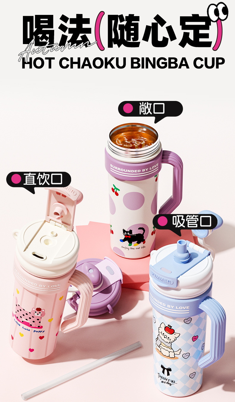 여성용 멋진 만화 더블 빨대 보온병 컵, 대용량 워터 컵, 자동차 휴대용 아이스 컵