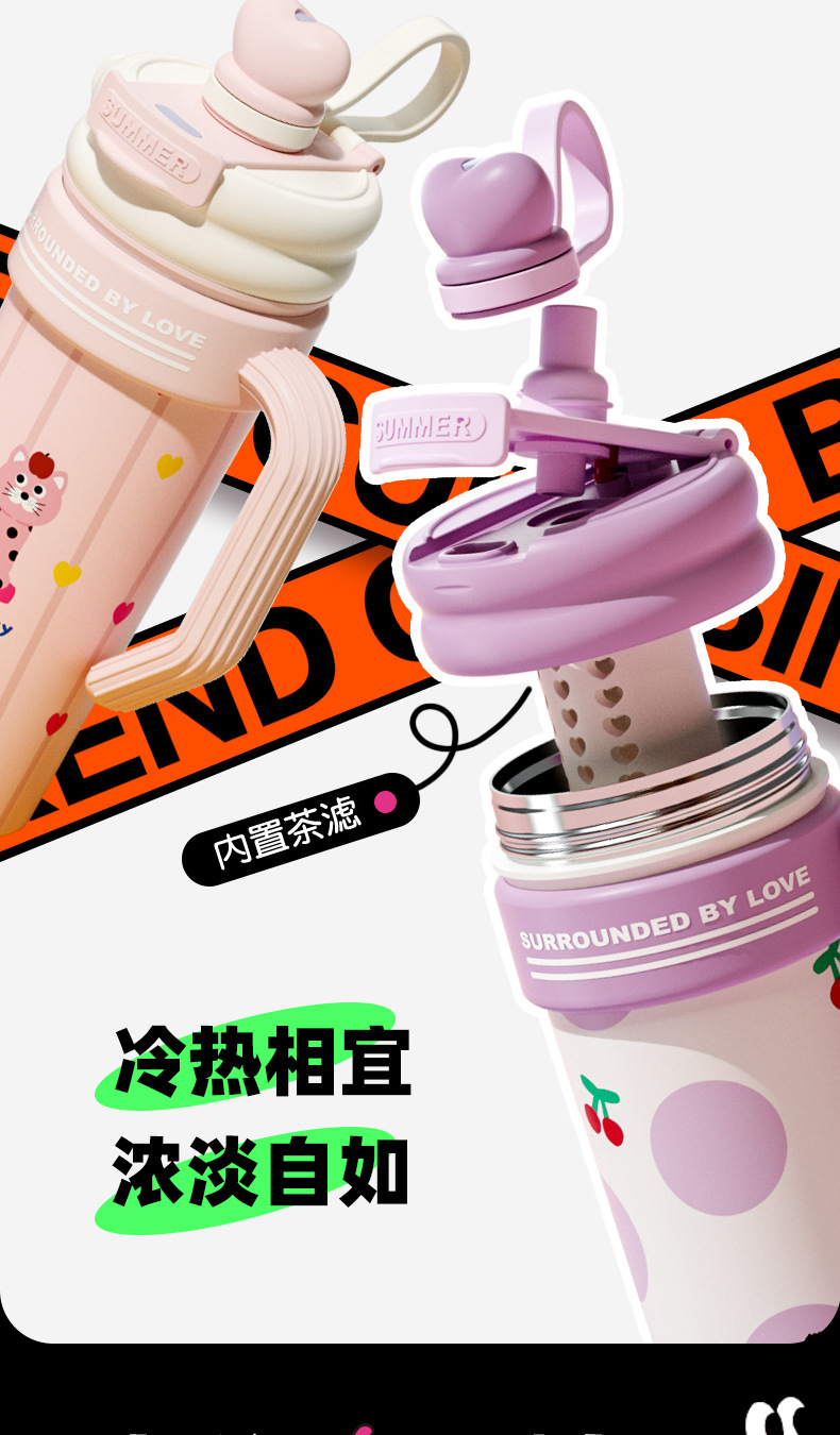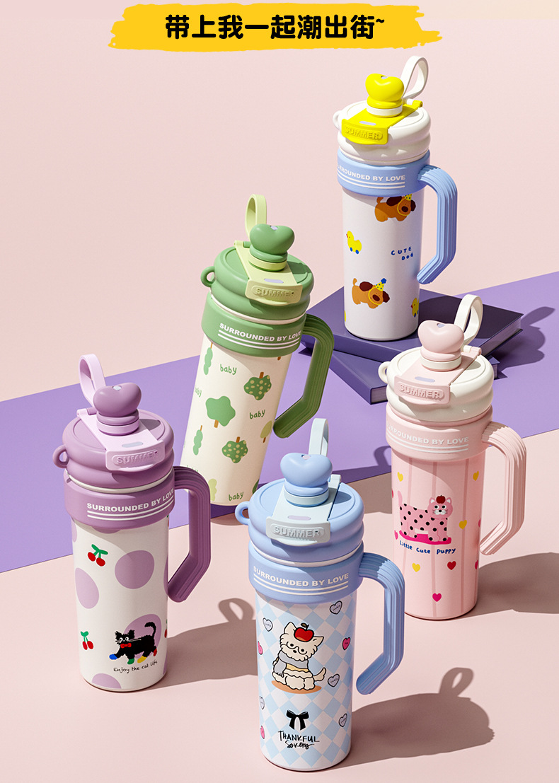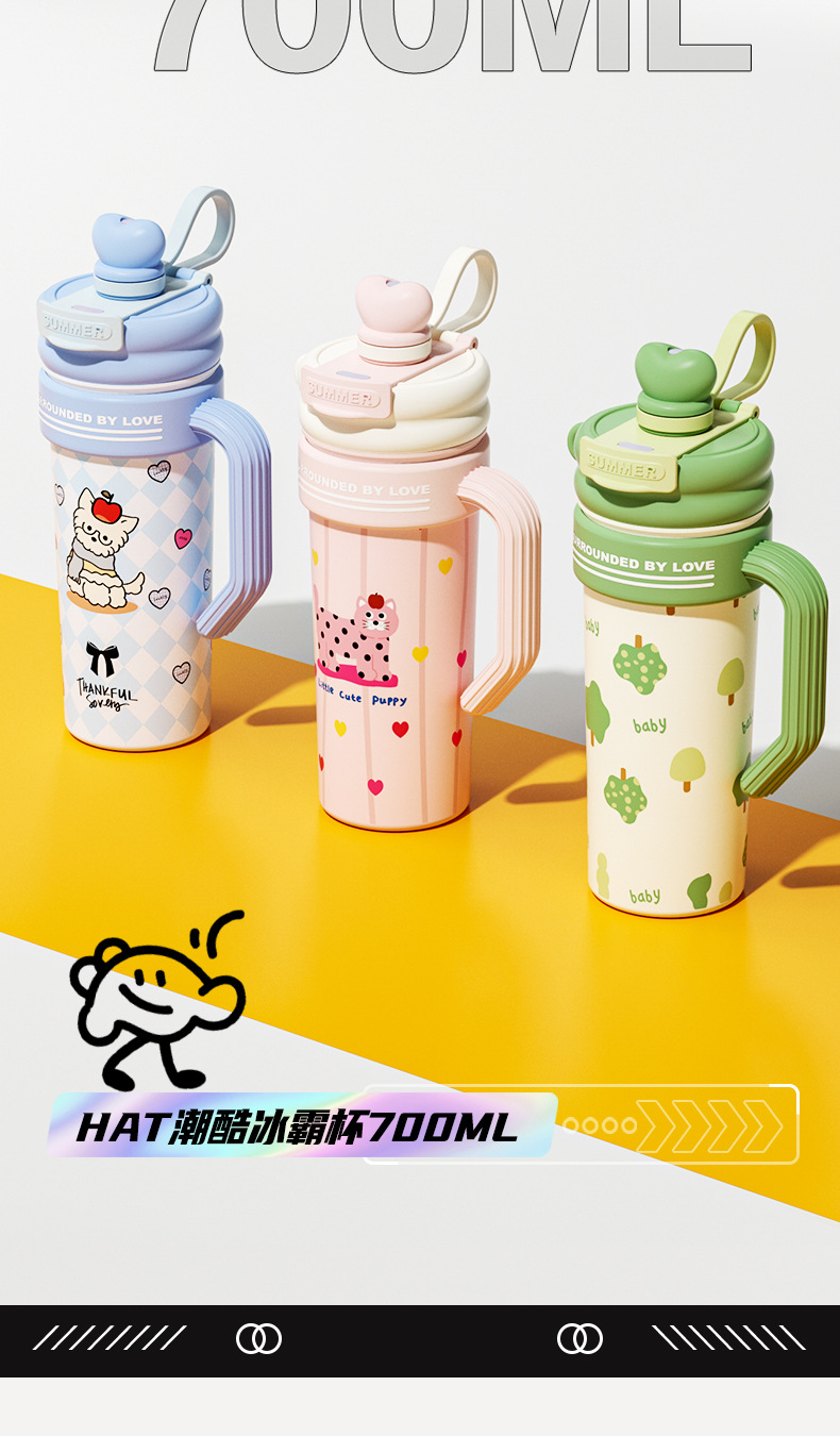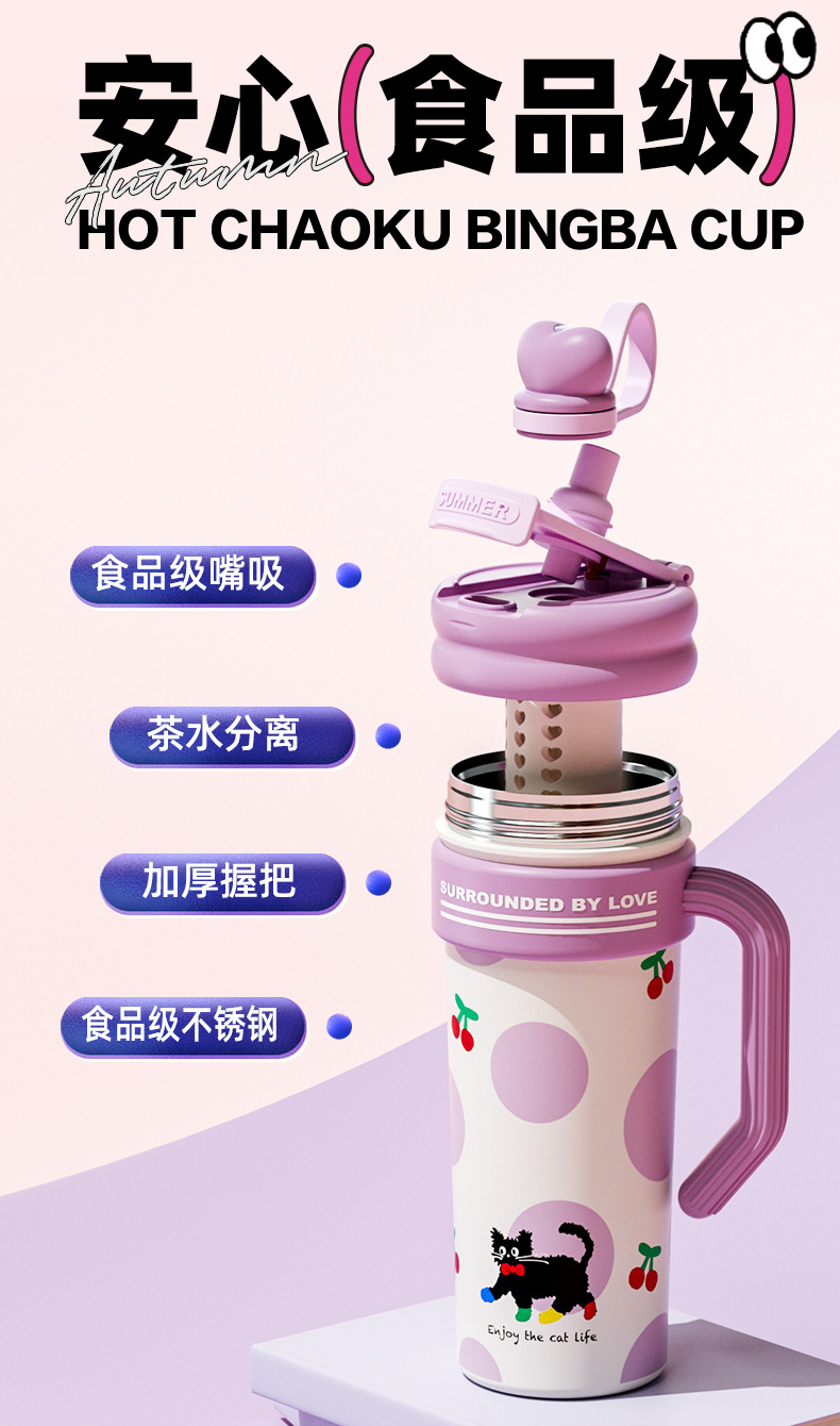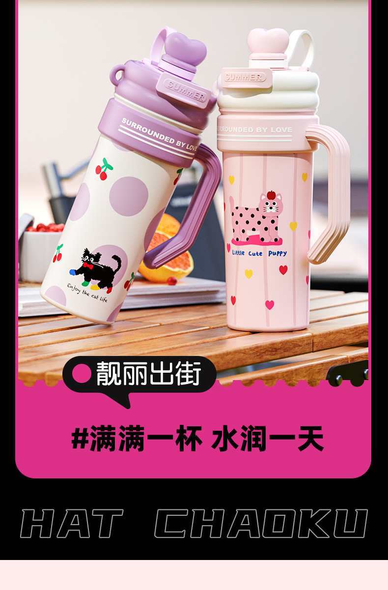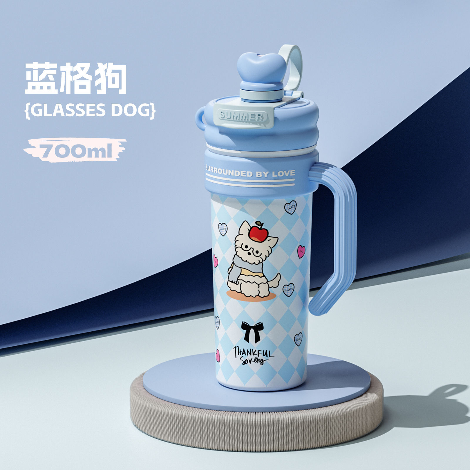 여성용 멋진 만화 더블 빨대 보온병 컵, 대용량 워터 컵, 자동차 휴대용 아이스 컵
