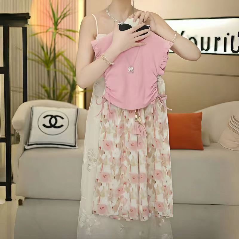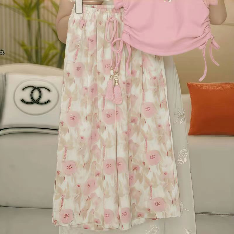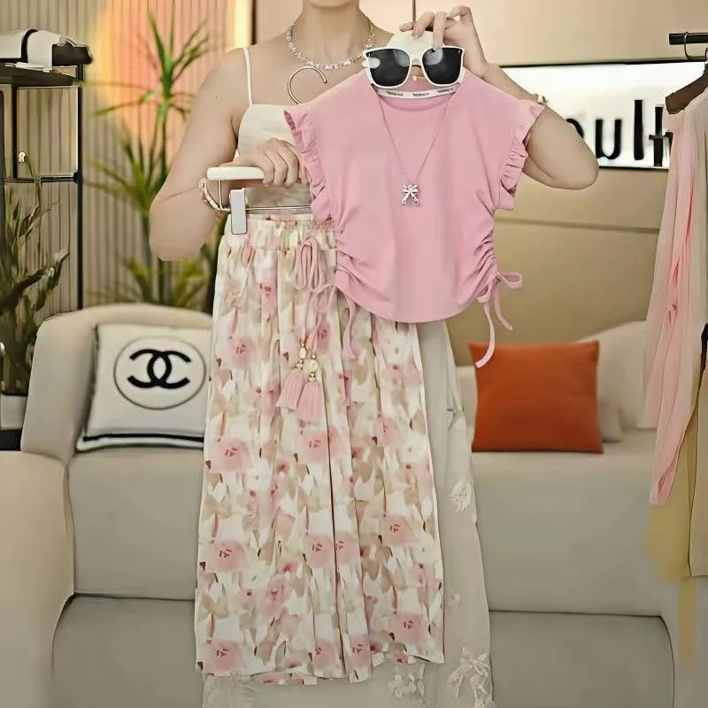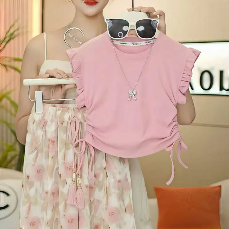 여아 여름 정장 2025 새로운 스타일 작은 플라잉 슬리브 와이드 팬츠 서양식 여름 정장 여아 허리 티셔츠 투피스 세트 유행스토어 가기
