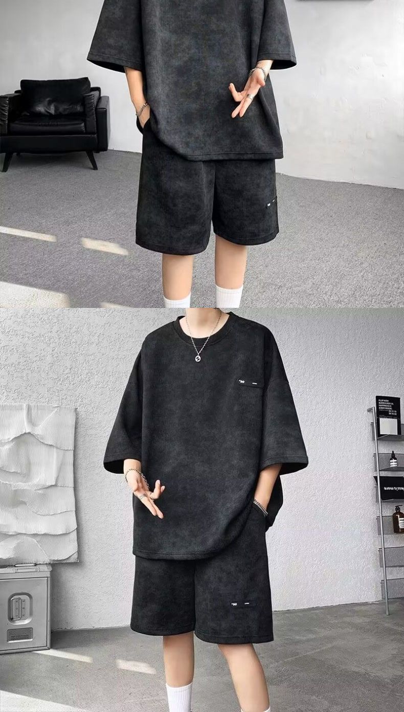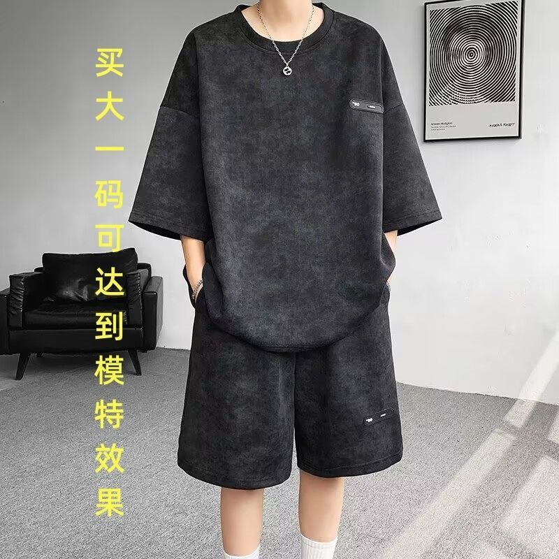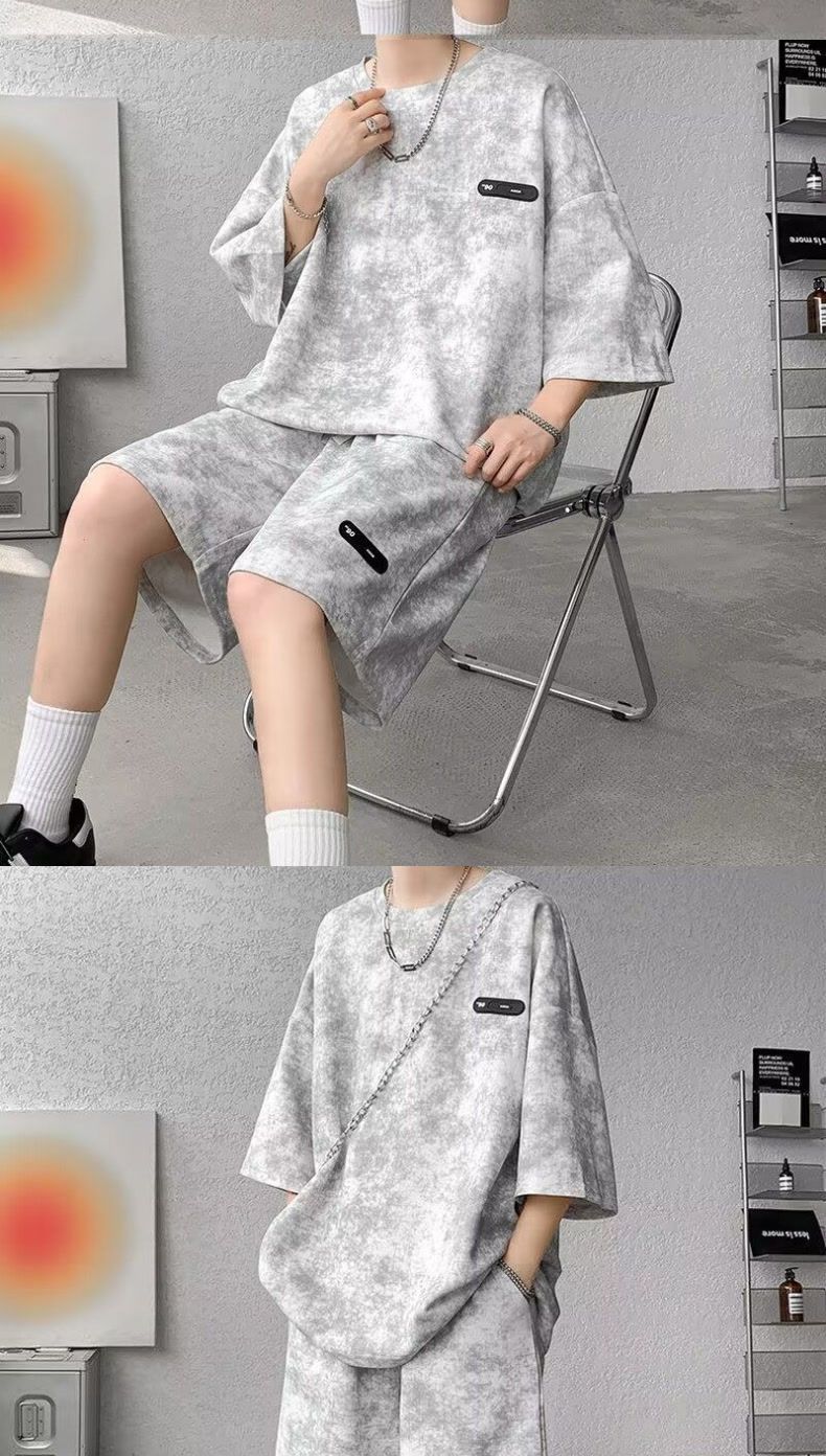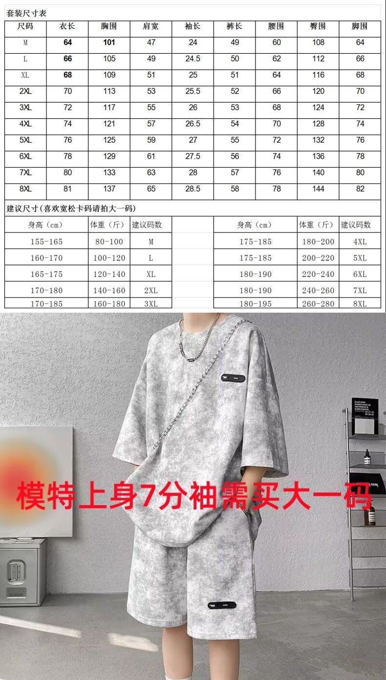 여름 정장 남성 틈새 디자인 타이 염색 7부 소매 티셔츠 반바지 트렌디하고 멋지고 멋진 플러스 사이즈 남성 의류 세트
