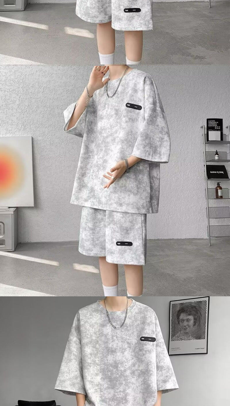 여름 정장 남성 틈새 디자인 타이 염색 7부 소매 티셔츠 반바지 트렌디하고 멋지고 멋진 플러스 사이즈 남성 의류 세트스토어 가기