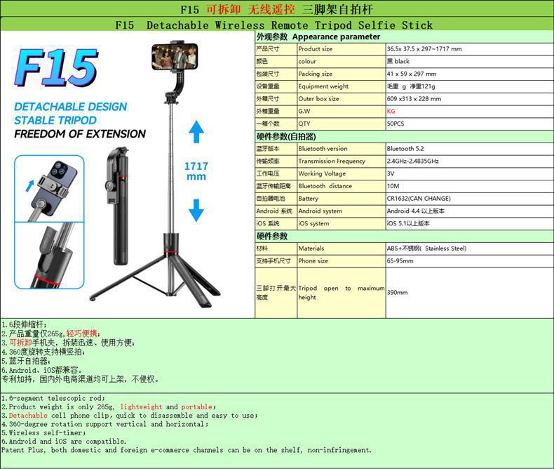 새로운 1.7m 셀카봉F15 라이브 사진 유물 블루투스 원격 제어 바닥 스탠딩 올인원 삼각대 스탠드스토어 가기