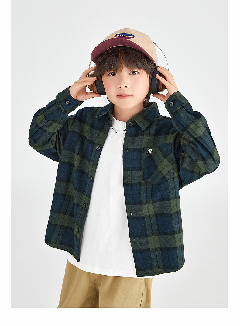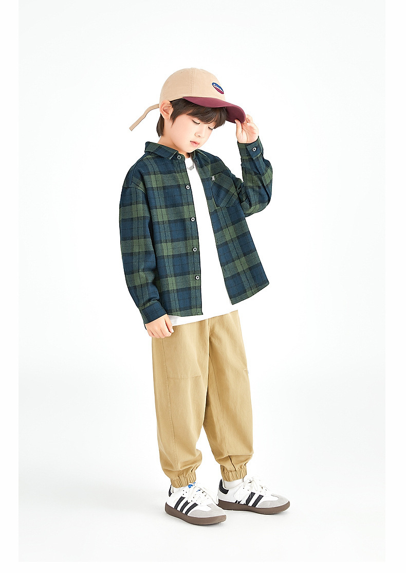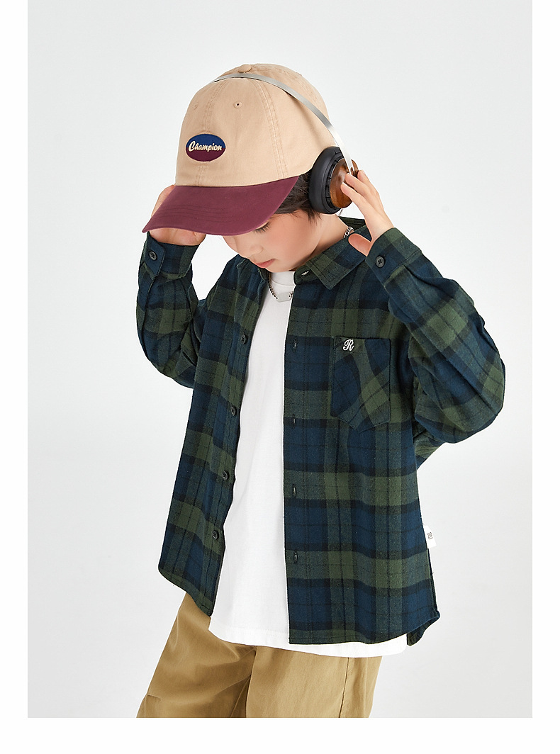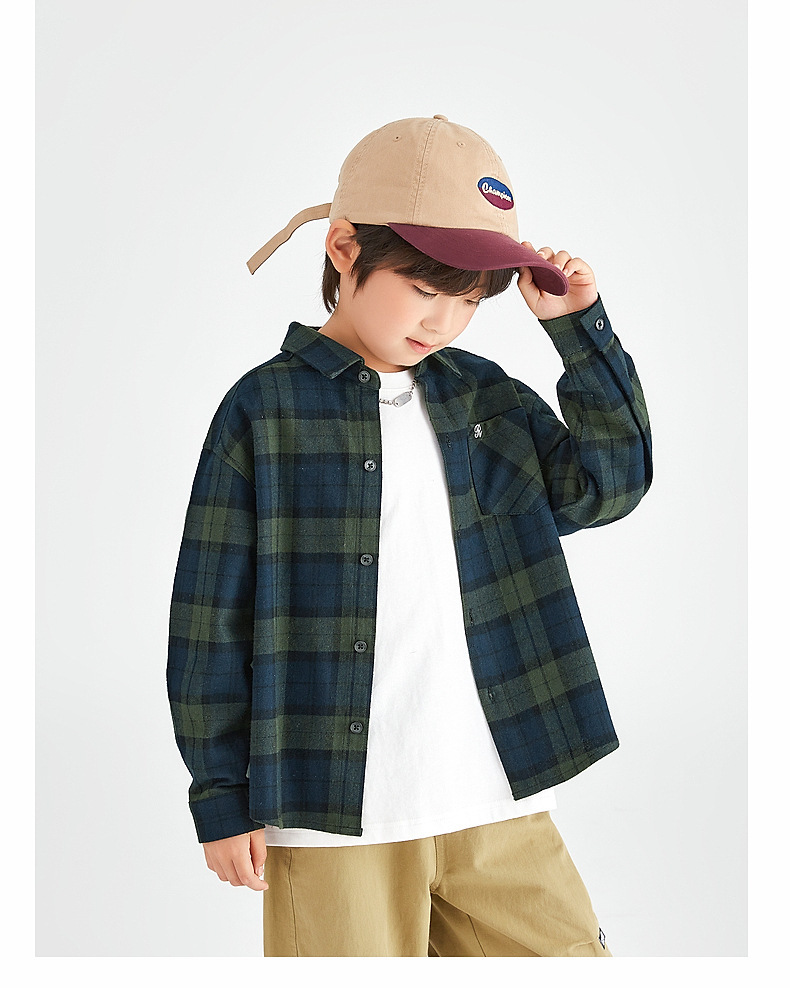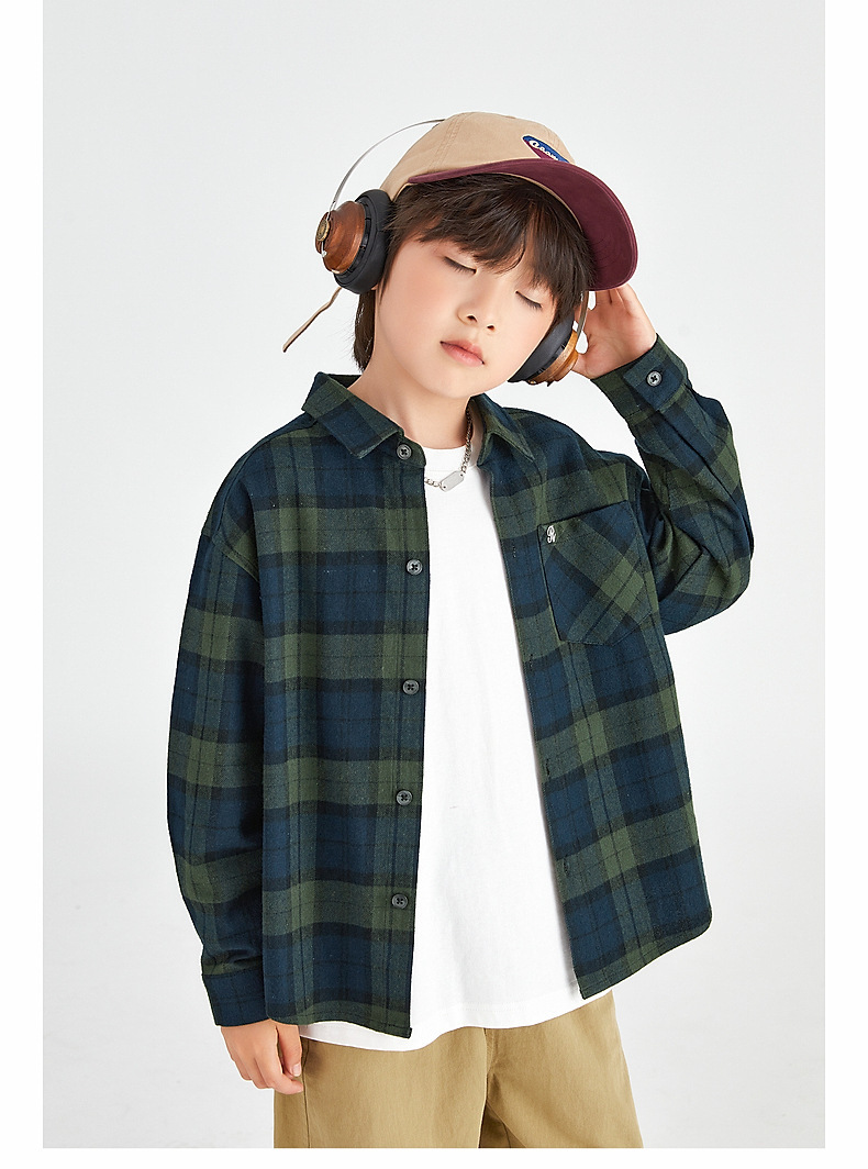 Duojia 소년 셔츠, 기모 처리된 피부 느낌, 봄과 가을 복고풍 격자 무늬 탑, 중대형 어린이 순면 재킷