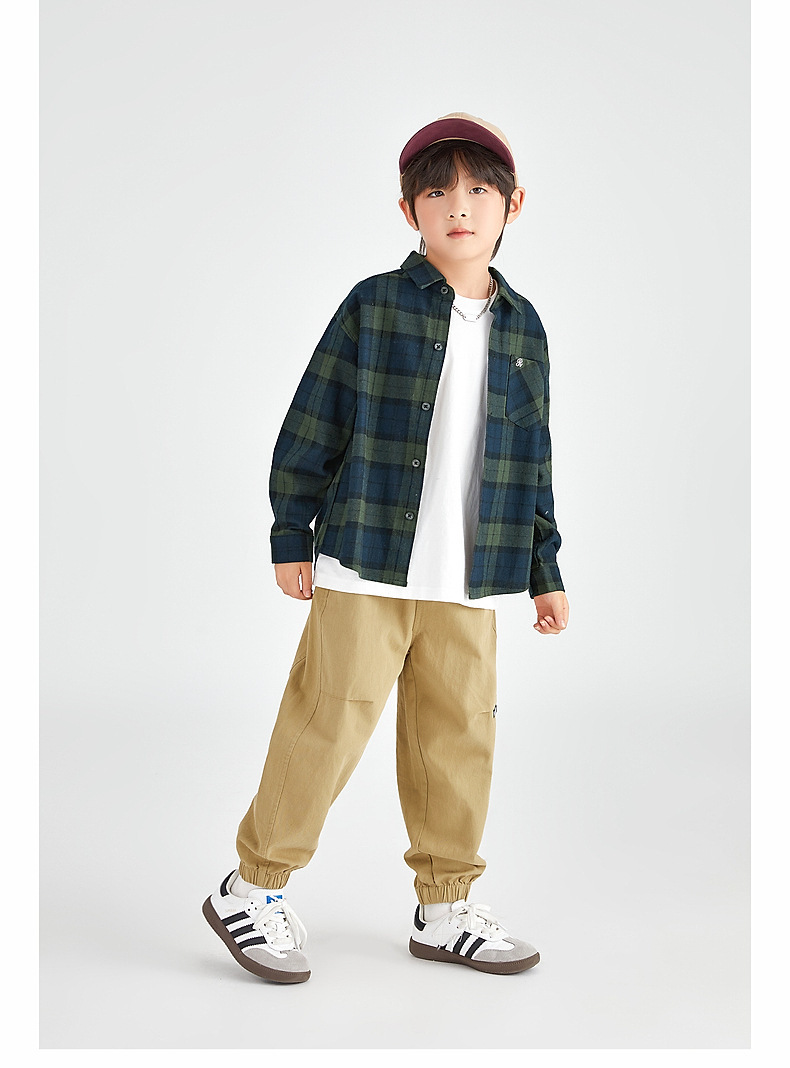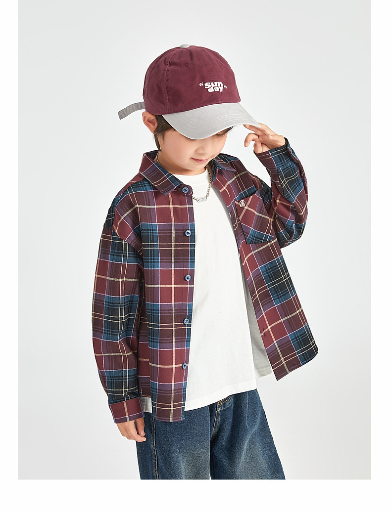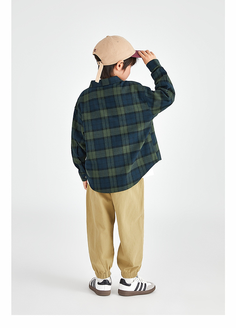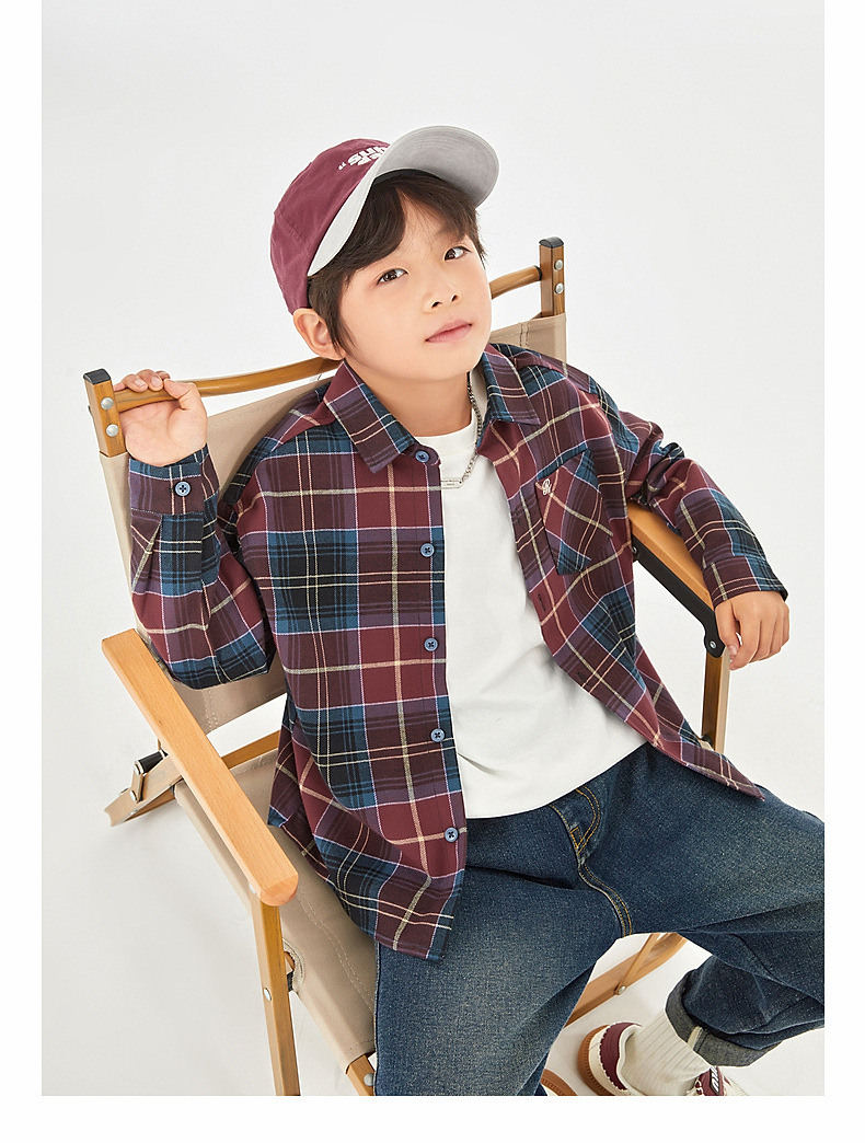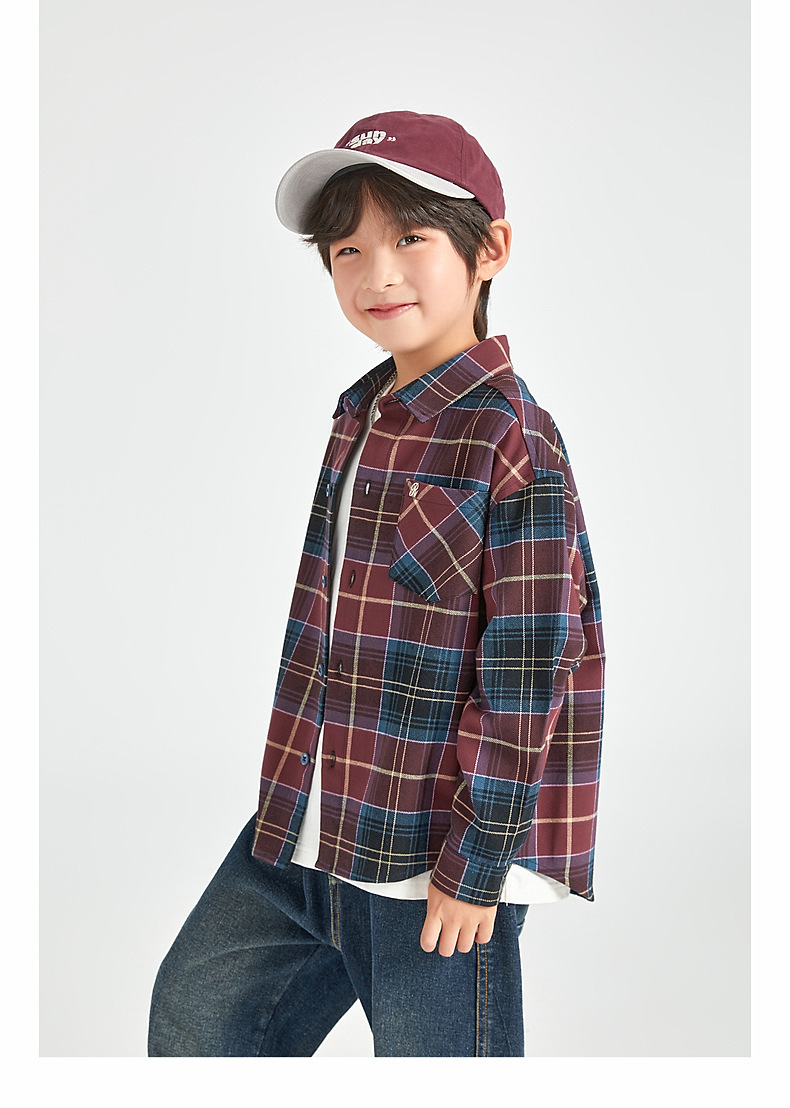 Duojia 소년 셔츠, 기모 처리된 피부 느낌, 봄과 가을 복고풍 격자 무늬 탑, 중대형 어린이 순면 재킷
