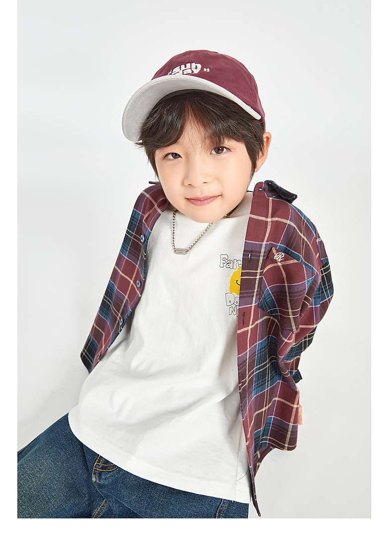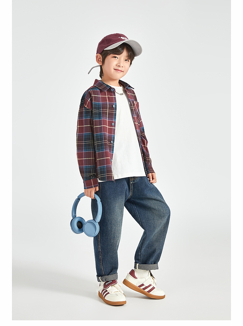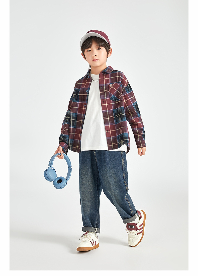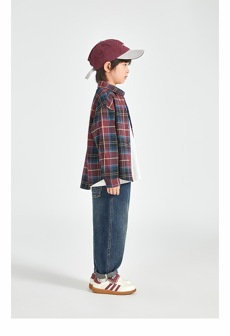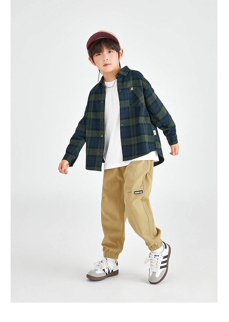 Duojia 소년 셔츠, 기모 처리된 피부 느낌, 봄과 가을 복고풍 격자 무늬 탑, 중대형 어린이 순면 재킷