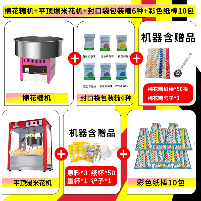 • 마시멜로 기계 + 플랫탑 팝콘 기계 + 밀봉 봉지 포장 설탕 6종/팩당 1000g + 색종이 스틱 10팩/500개