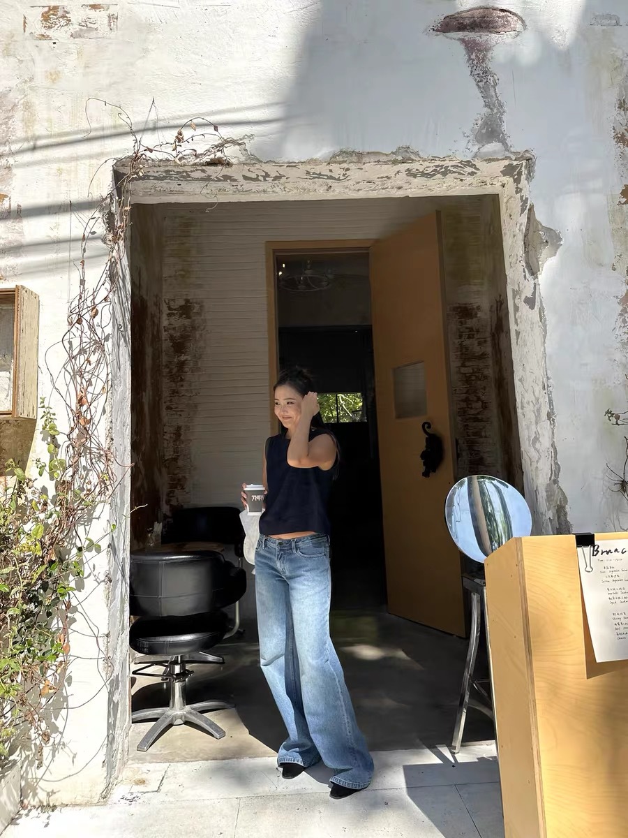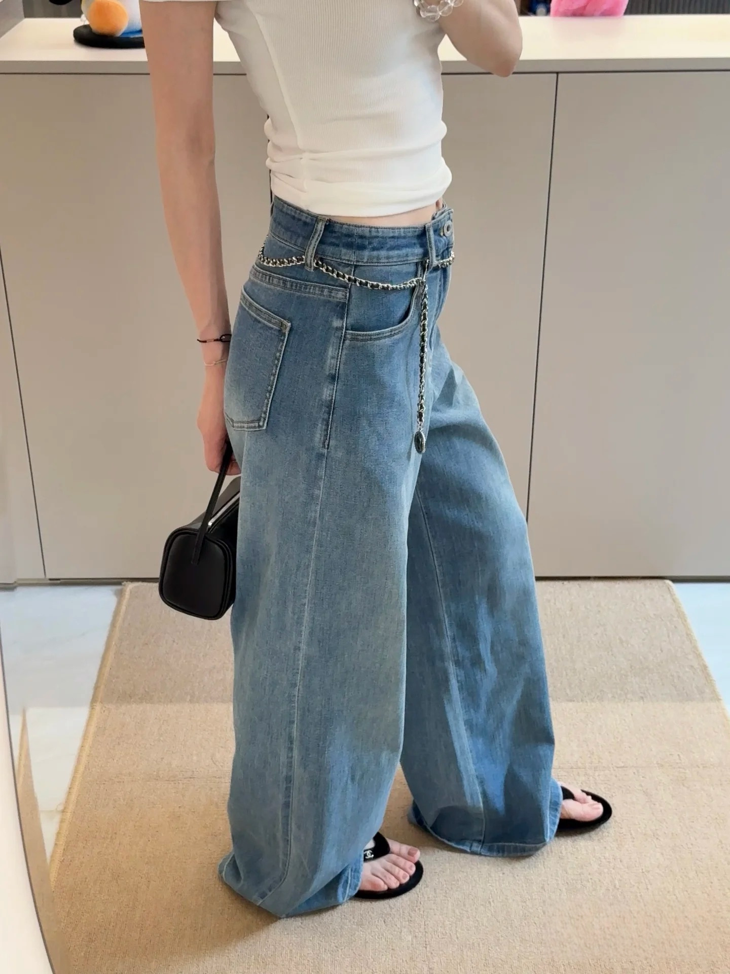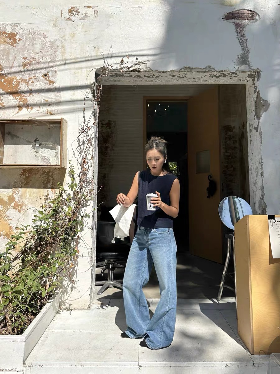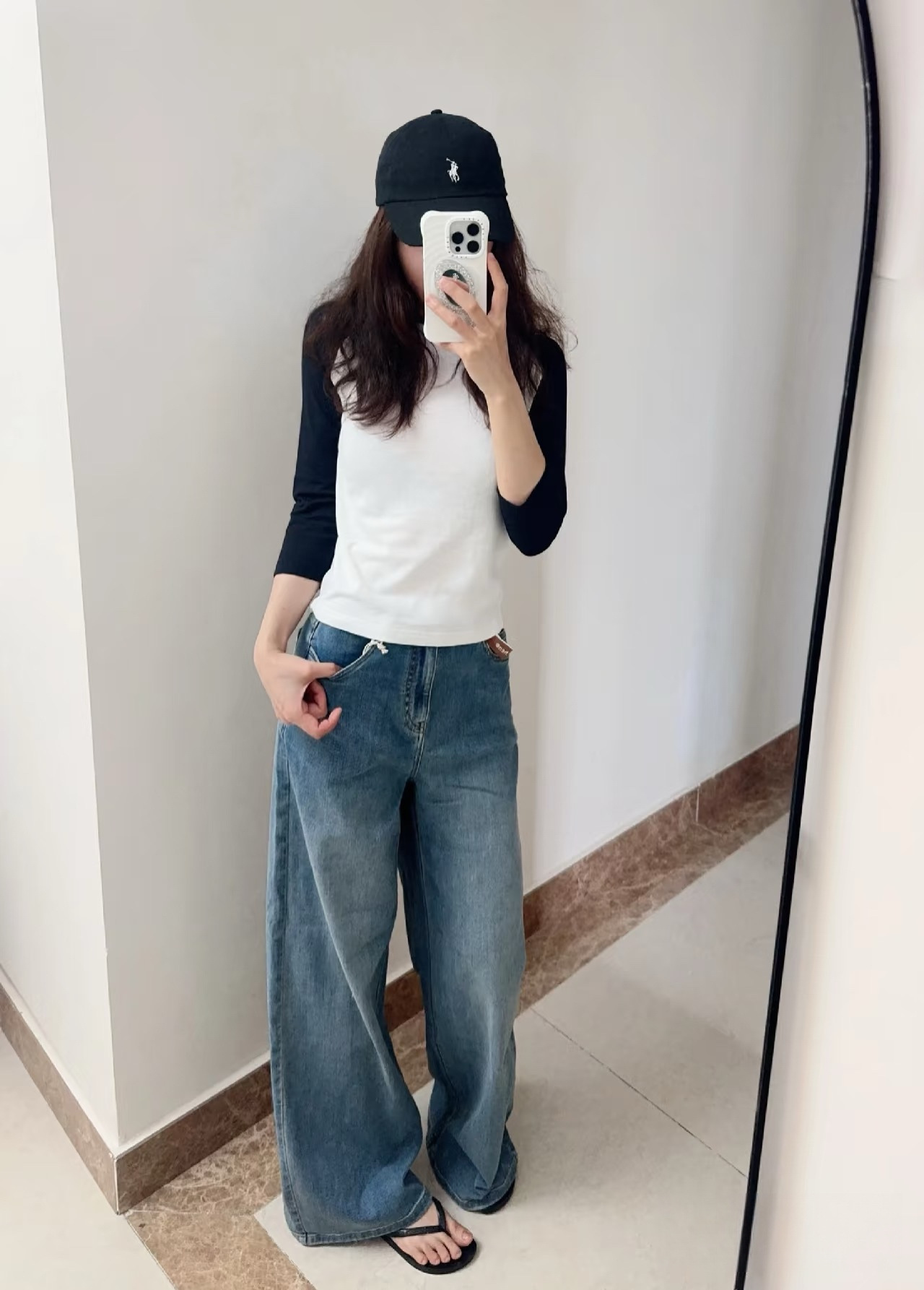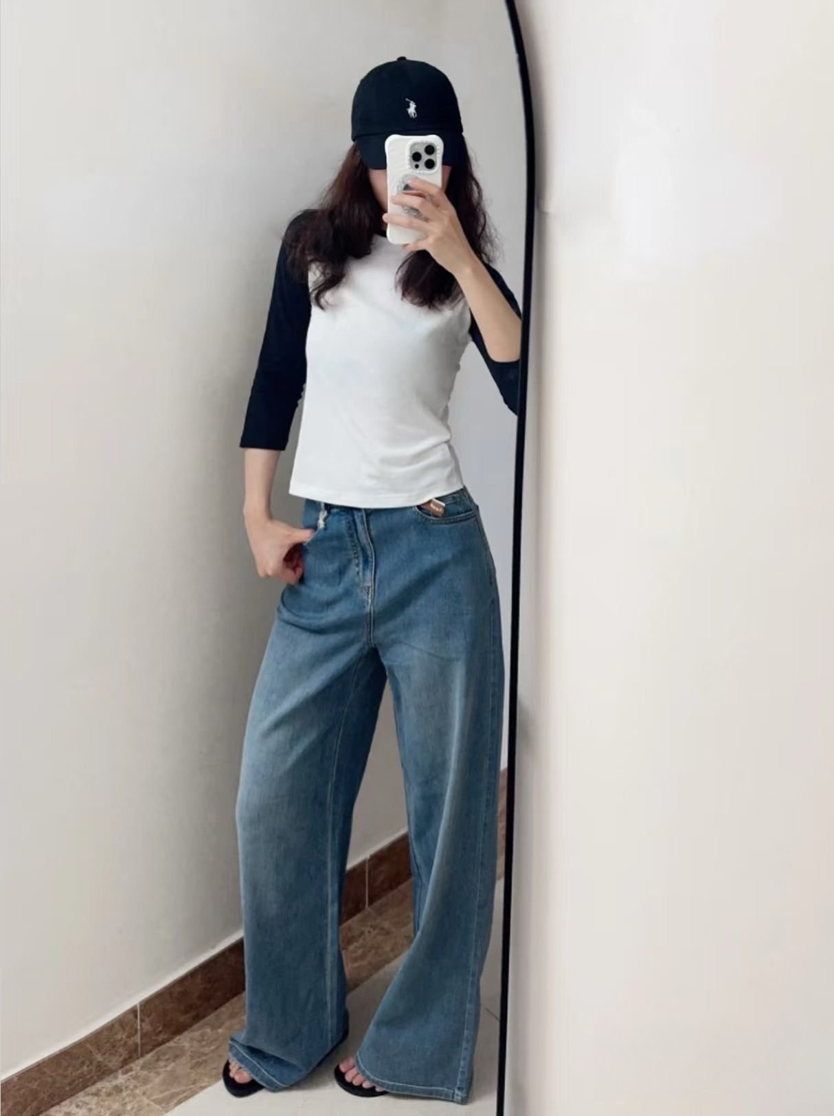 새로운 슬림 1343M 중간 허리 클래식 복고풍 실루엣 부드럽고 얇은 통기성 여름 여성용 와이드 레그 데님 바지 5017스토어 가기