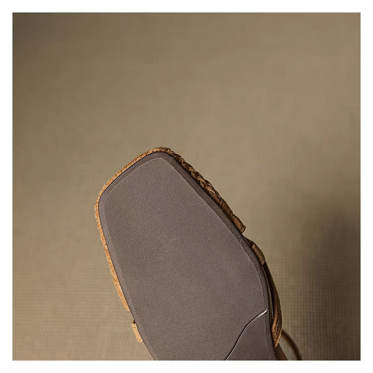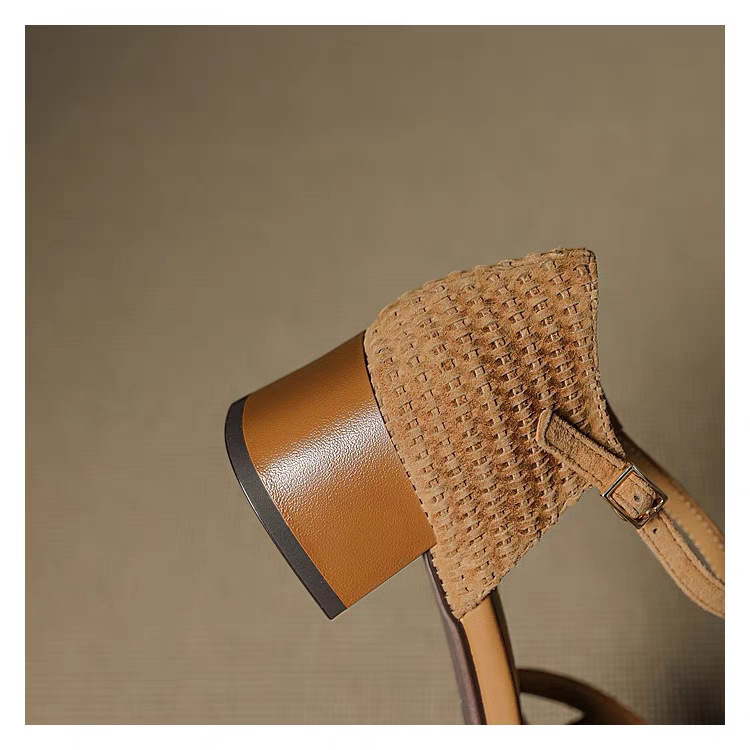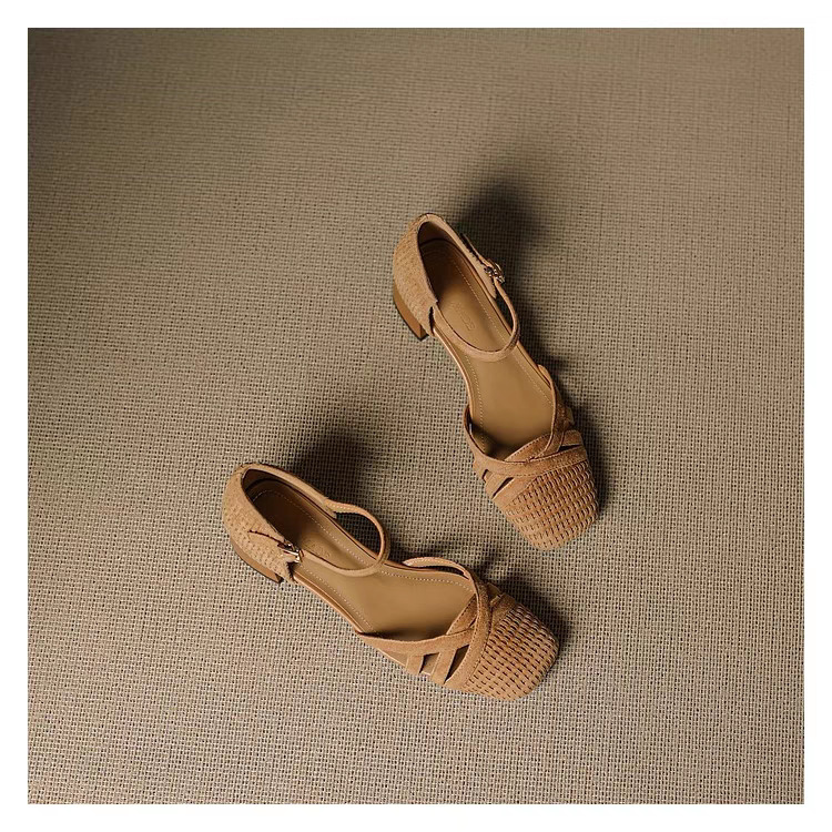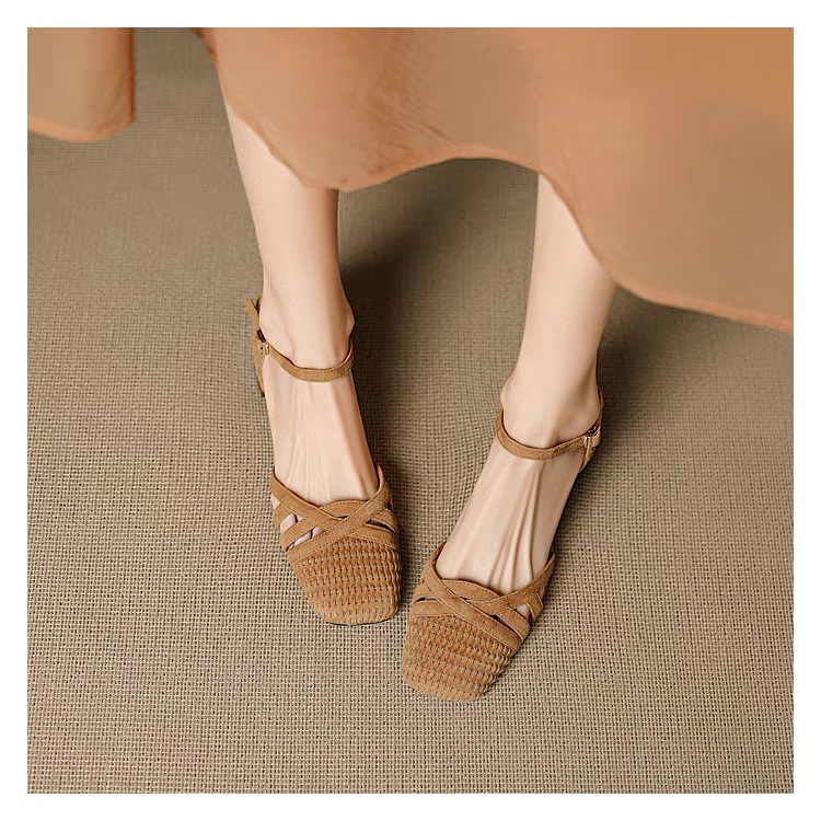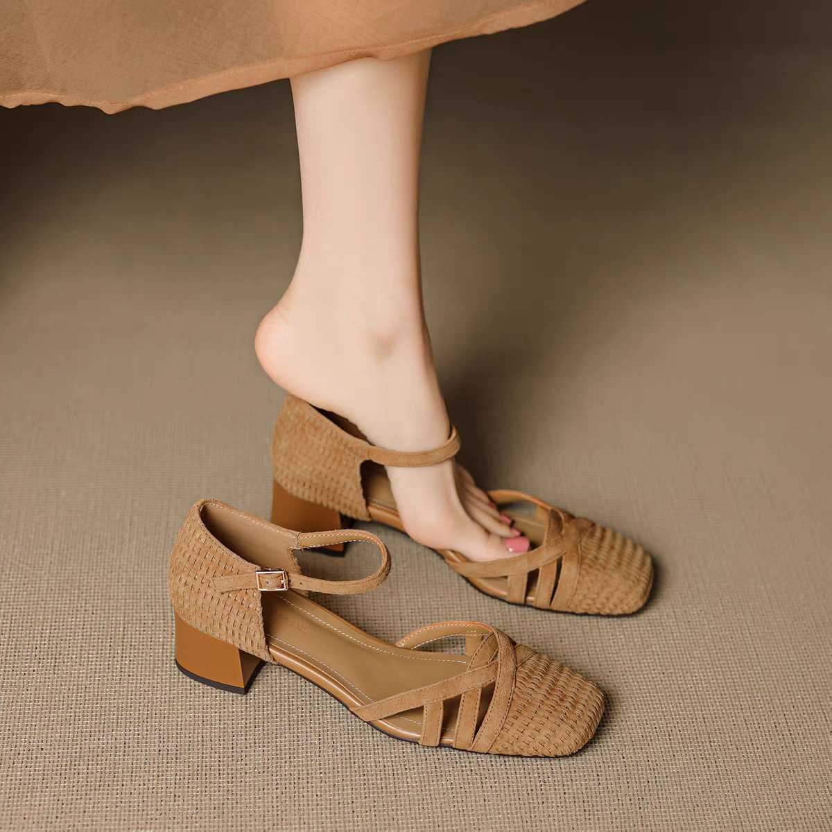 2025년 여름 신상품, 스커트와 복고풍 원라인 두꺼운 굽 신발을 갖춘 여성을 위한 아름다운 플랩 우븐 중공 발가락 샌들스토어 가기
