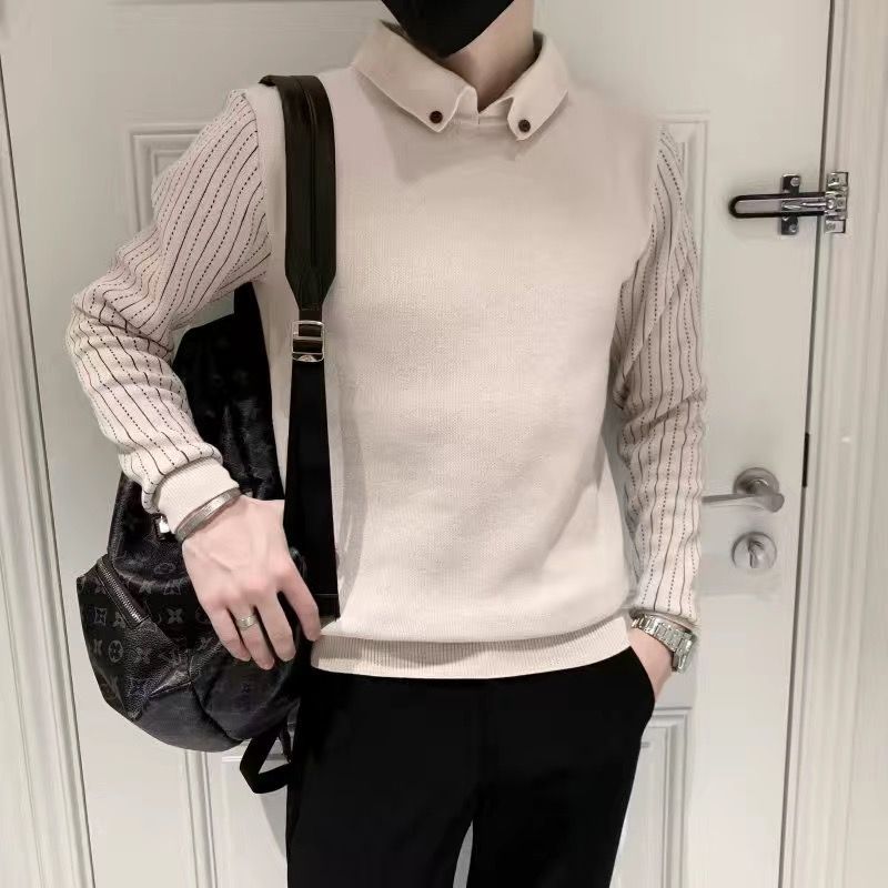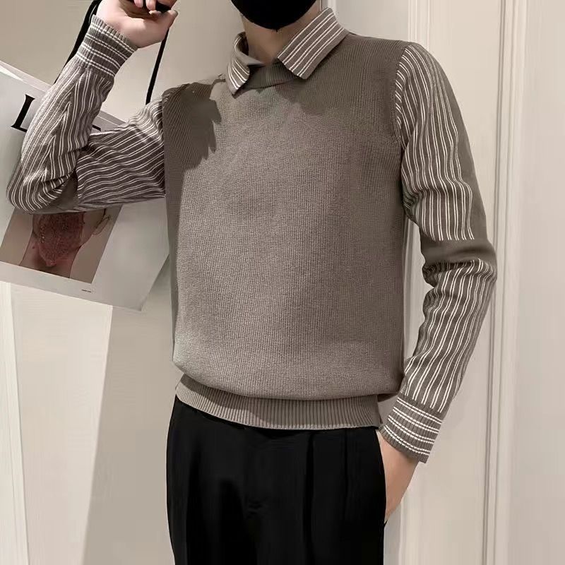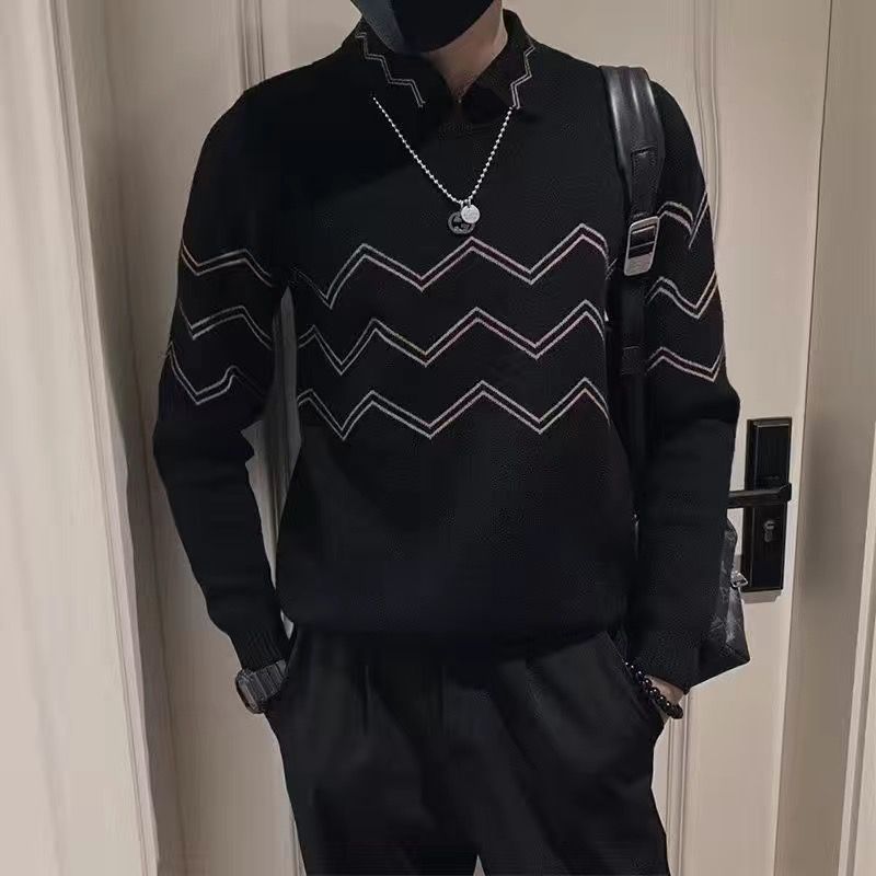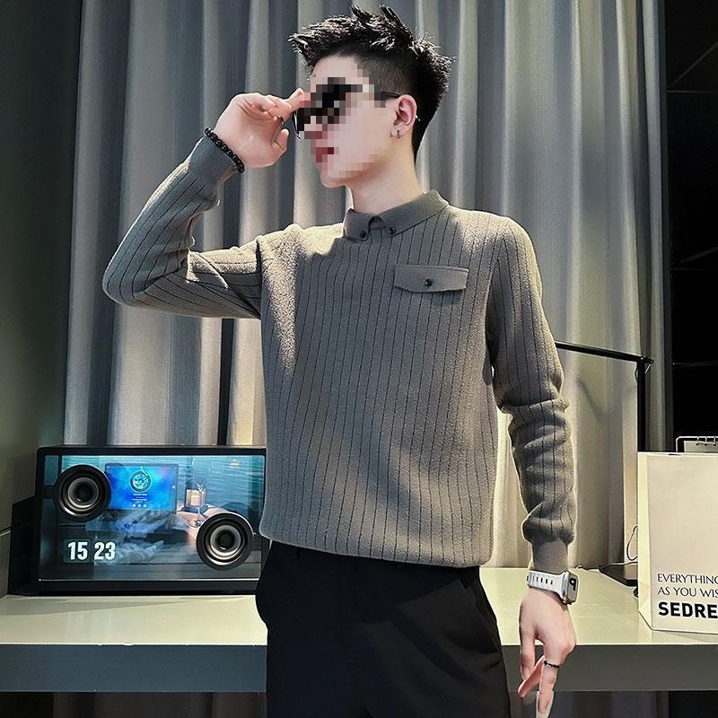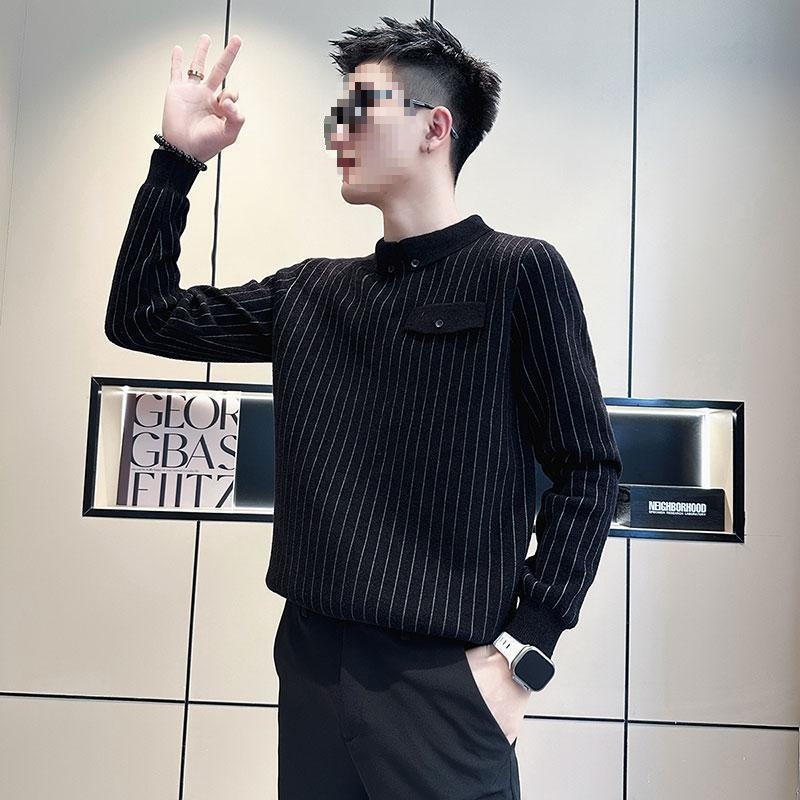 겨울에 멋진 긴팔 옷, 베이스 셔츠 칼라, 슬림 스웨터, 남성용 스트라이프 캐주얼 트렌디 스웨터