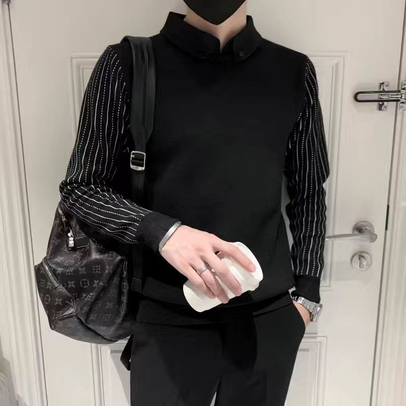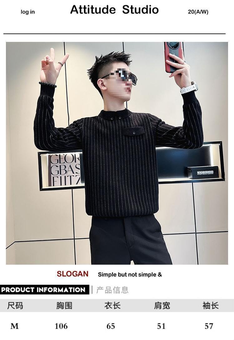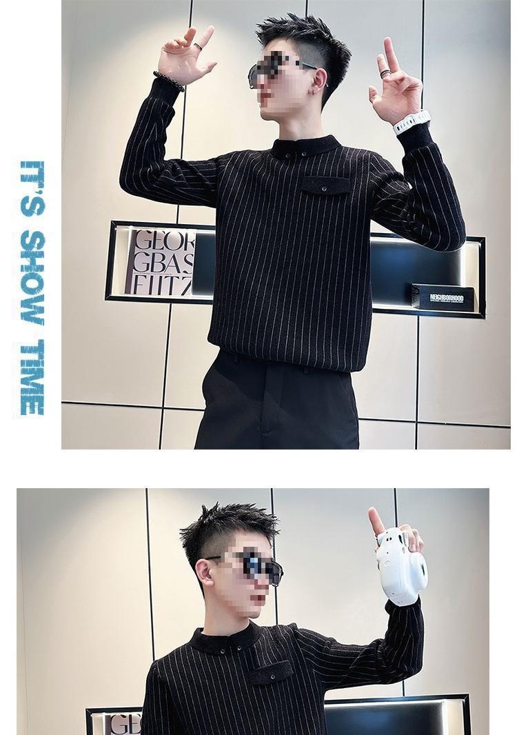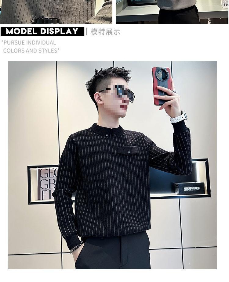 겨울에 멋진 긴팔 옷, 베이스 셔츠 칼라, 슬림 스웨터, 남성용 스트라이프 캐주얼 트렌디 스웨터스토어 가기