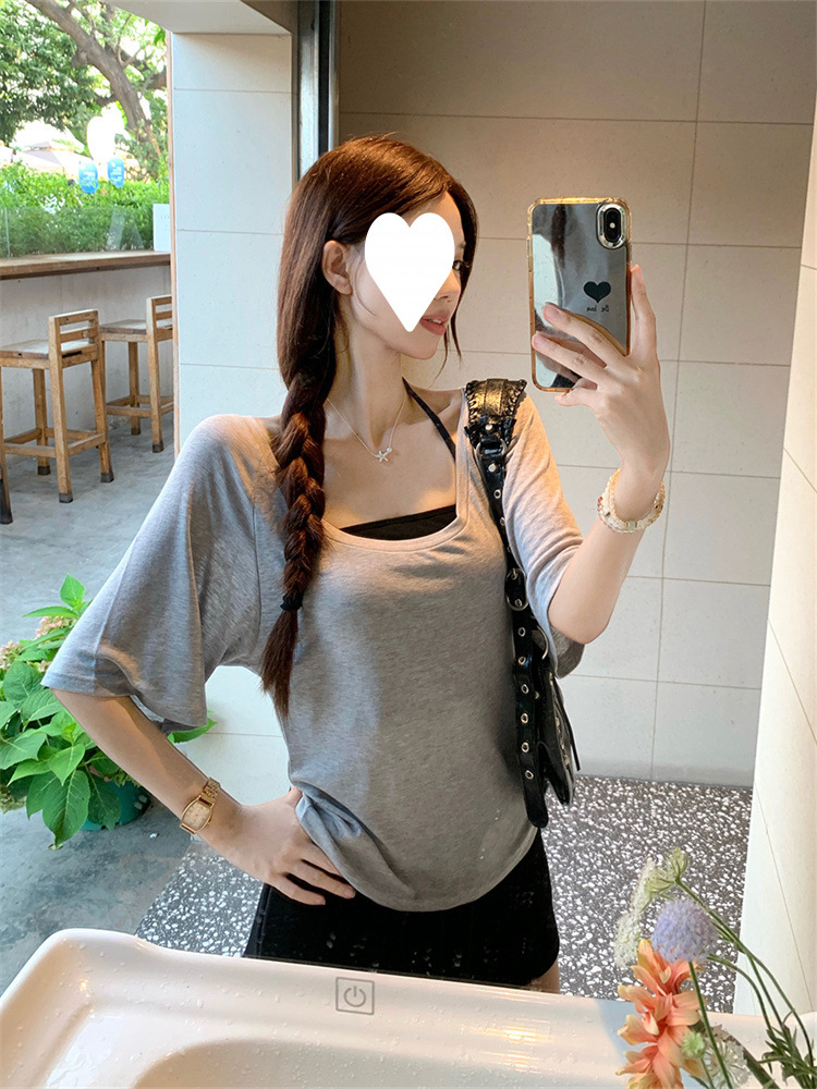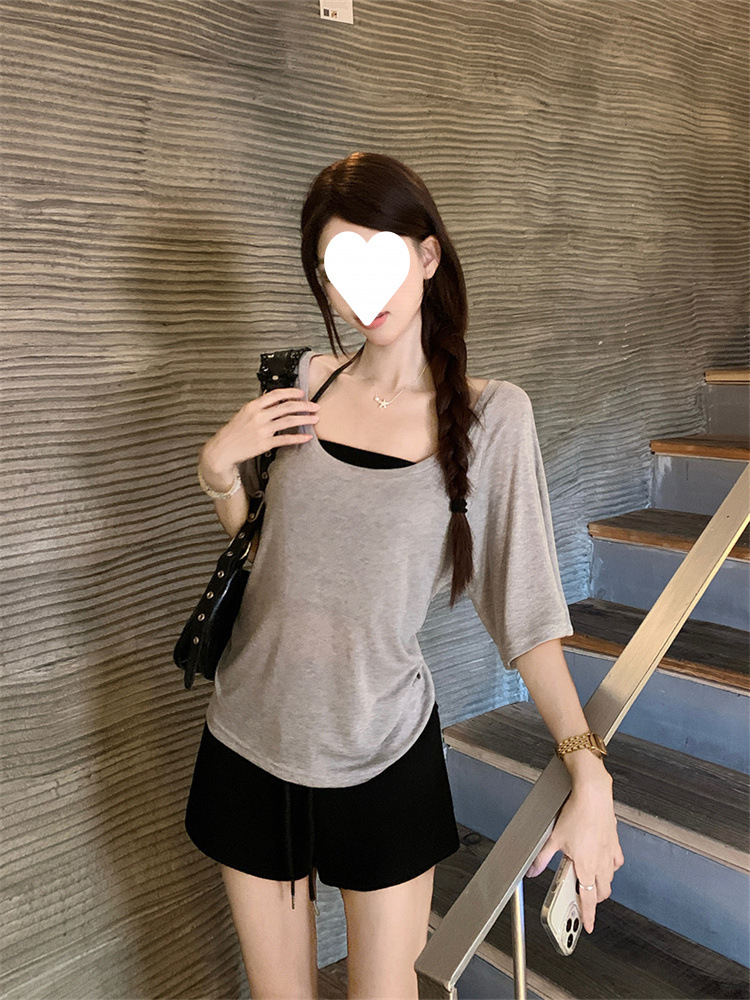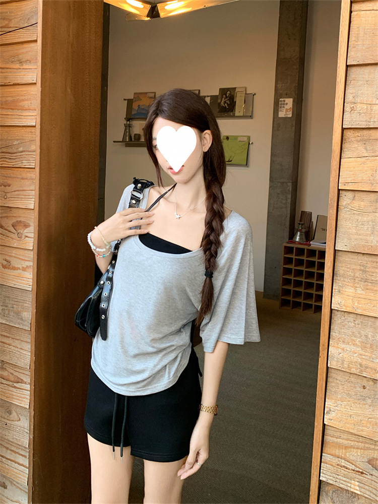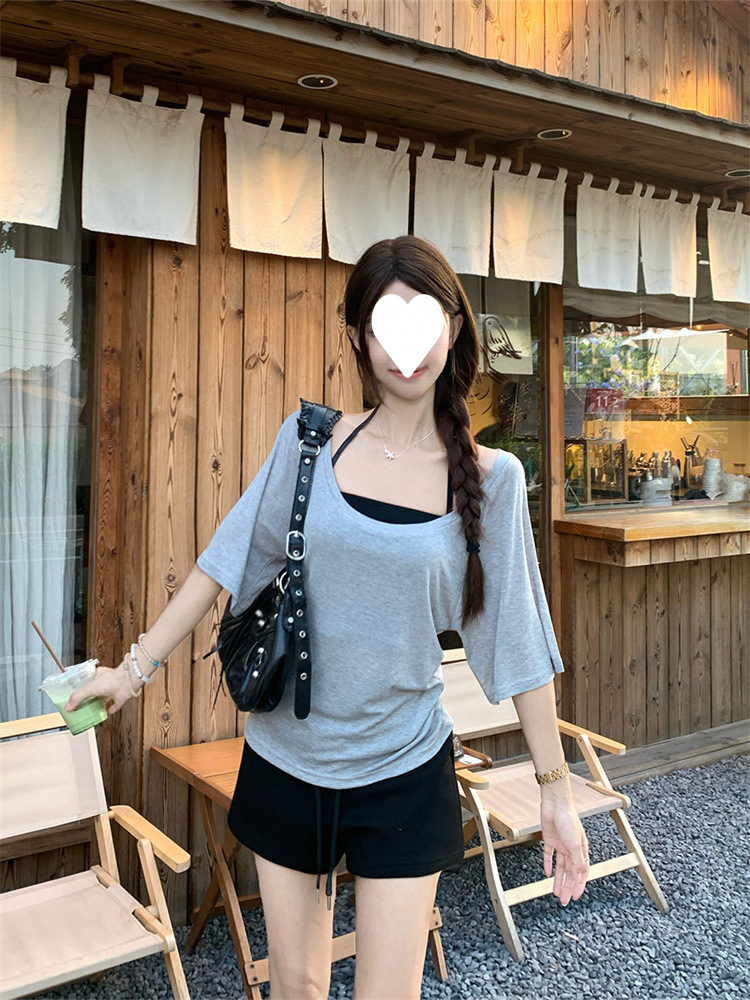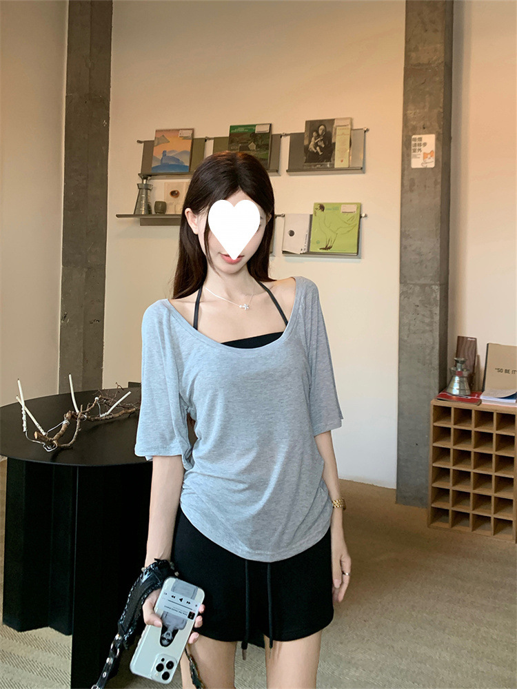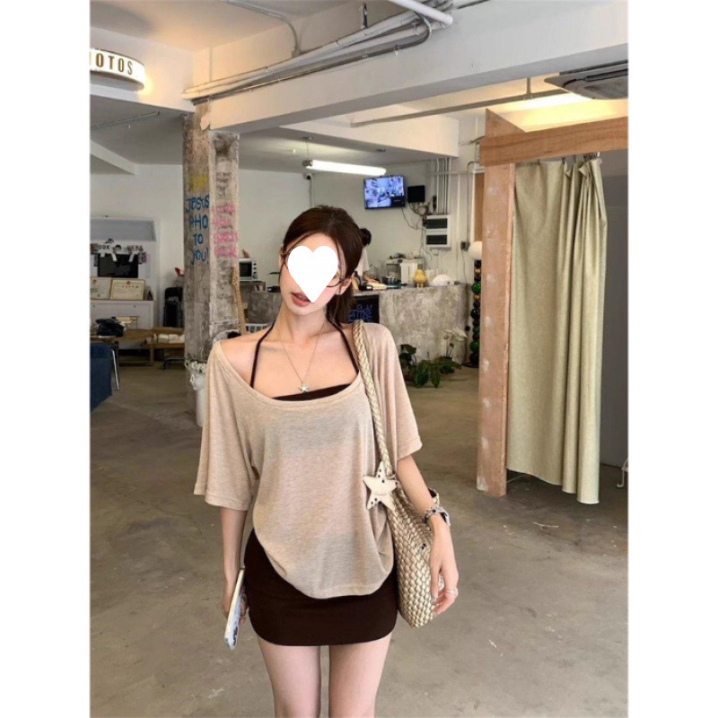여름 여성을 위한 한국 순수한 욕망 스타일 U 넥 반팔 티셔츠 루즈한 게으른 스타일 레이어드 오프 숄더 보텀 셔츠 탑