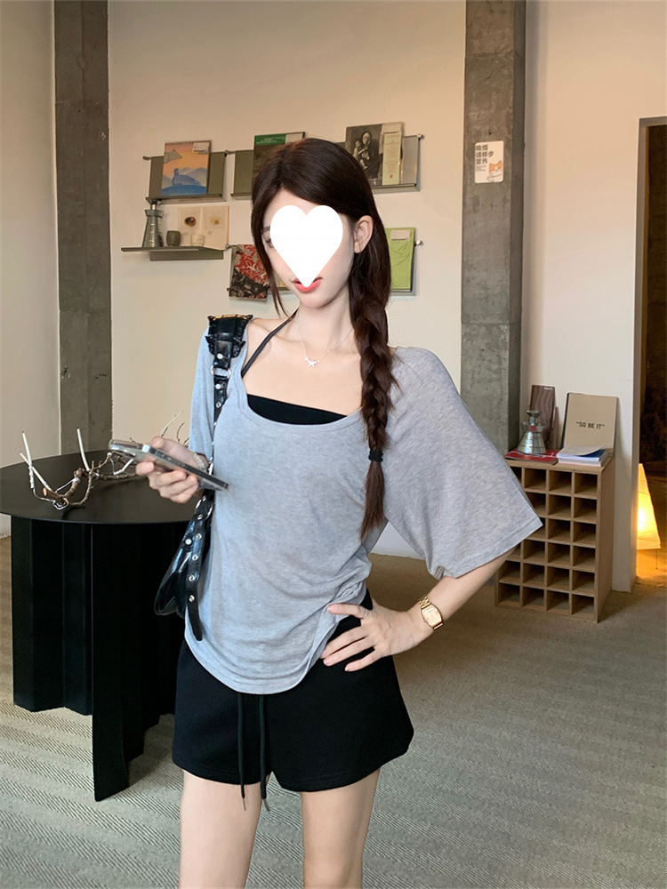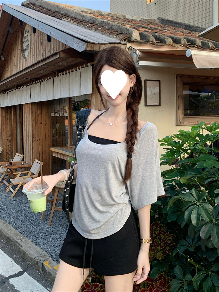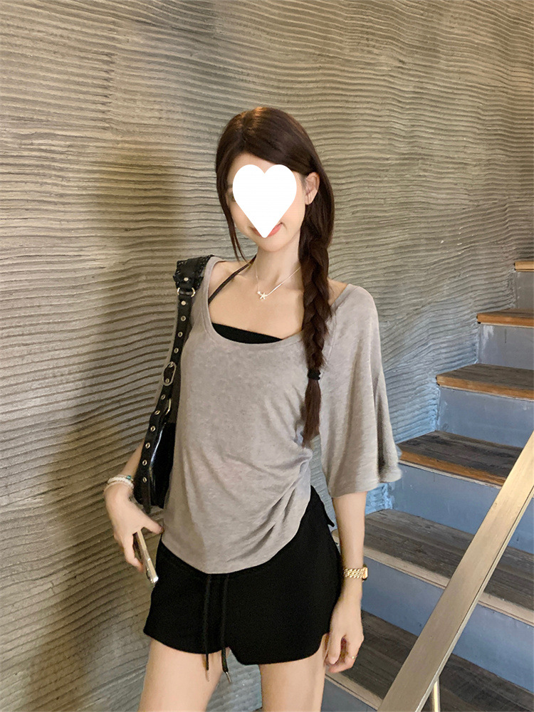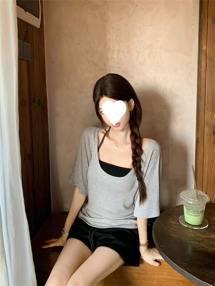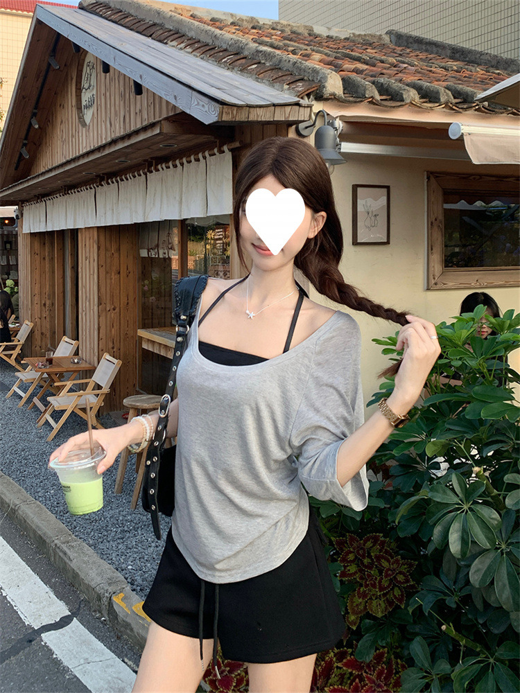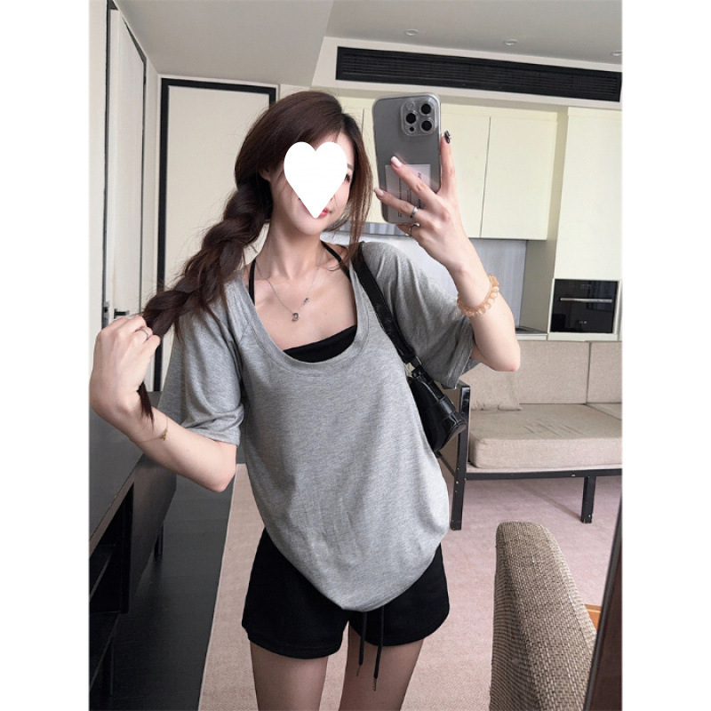 여름 여성을 위한 한국 순수한 욕망 스타일 U 넥 반팔 티셔츠 루즈한 게으른 스타일 레이어드 오프 숄더 보텀 셔츠 탑