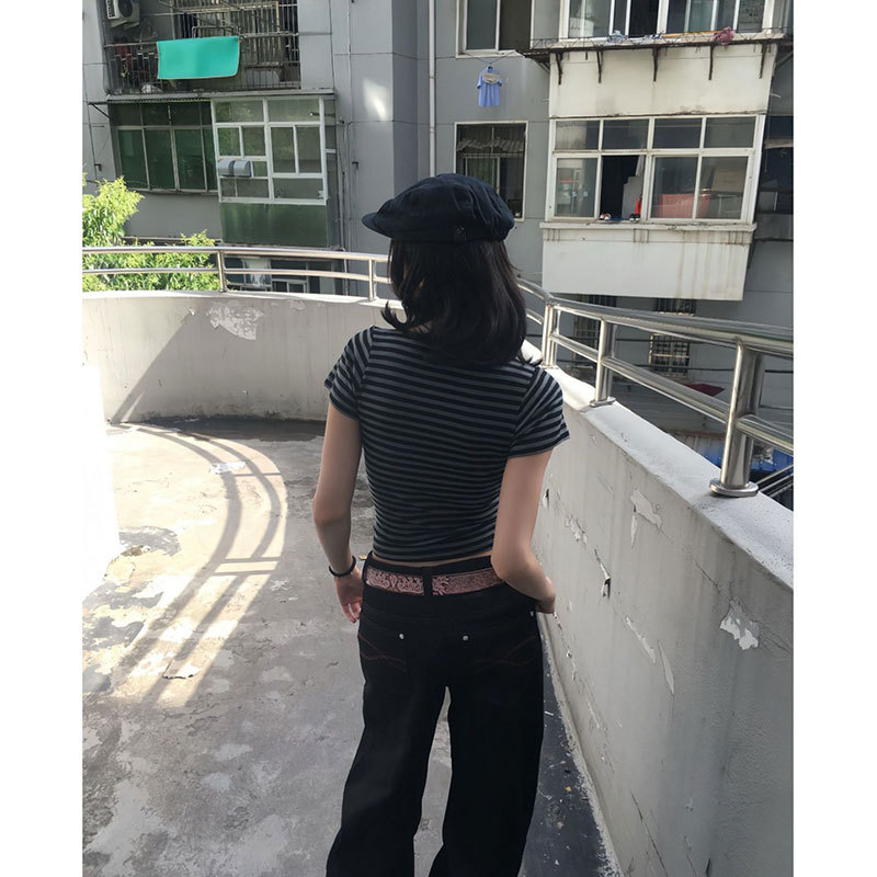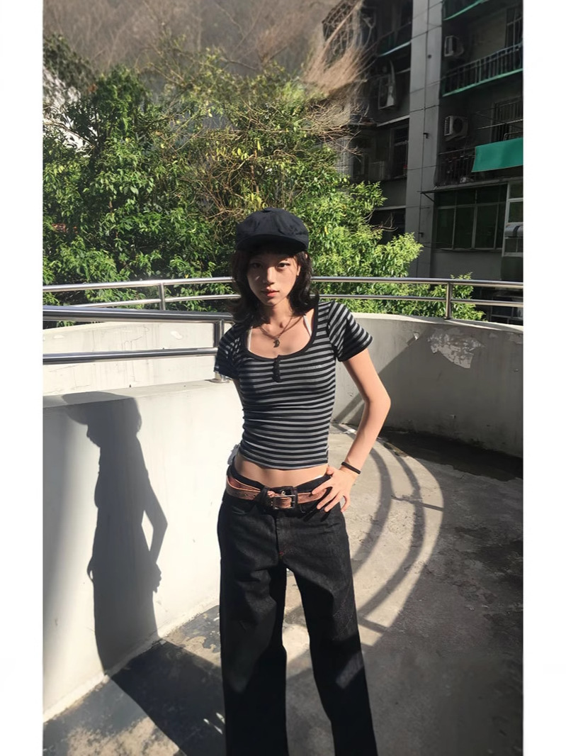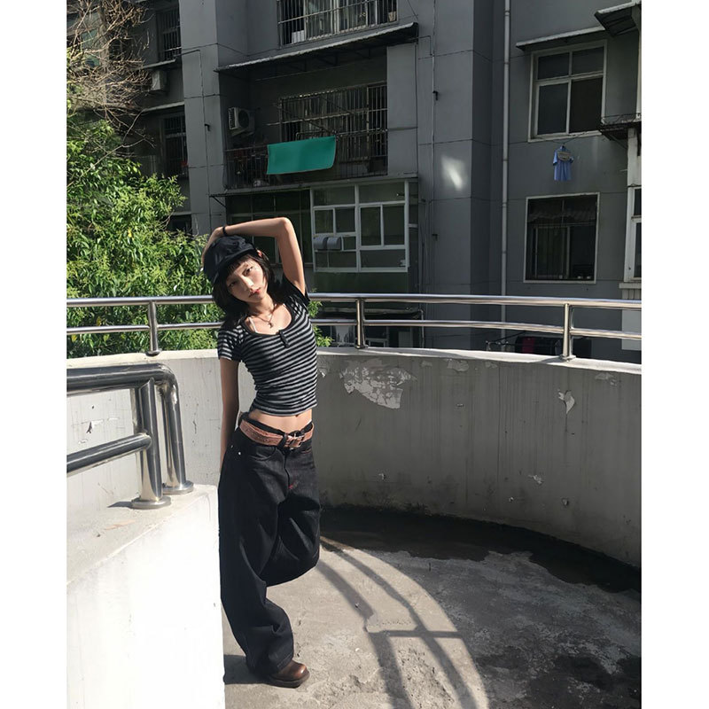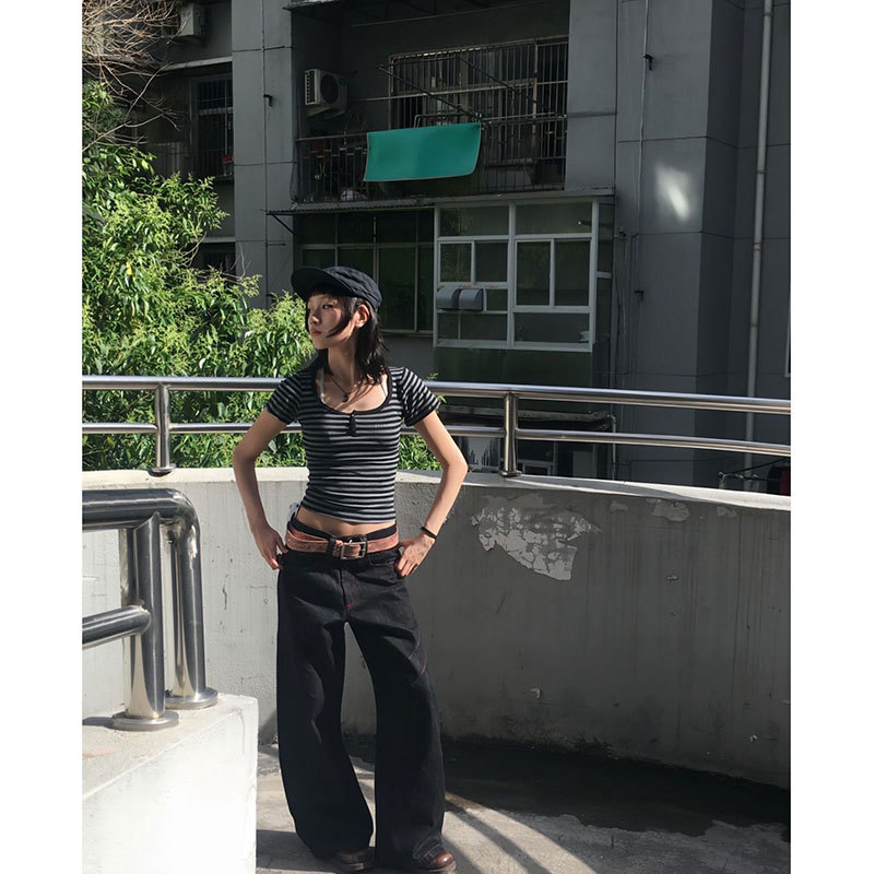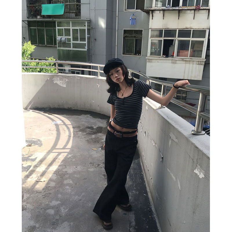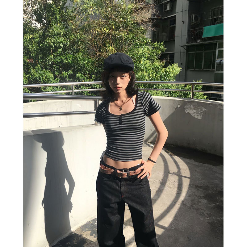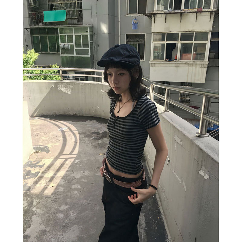 여름 디자인의 여성용 아메리칸 레트로 버튼 U 넥 오른쪽 어깨 반팔 티셔츠 핫 소녀 슬리밍 짧은 탑 트렌디스토어 가기