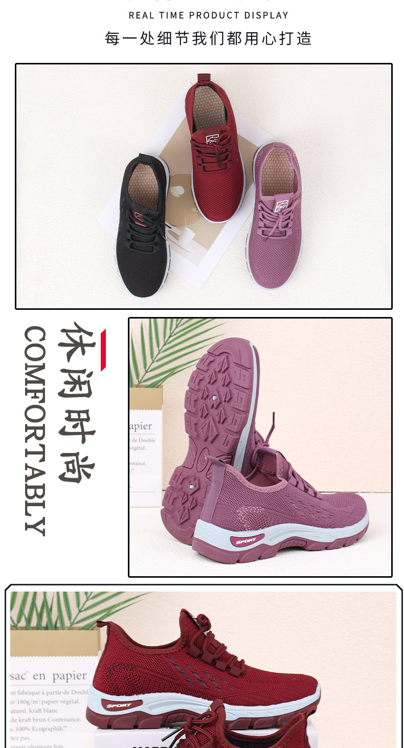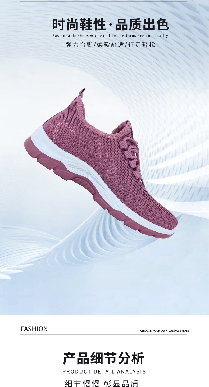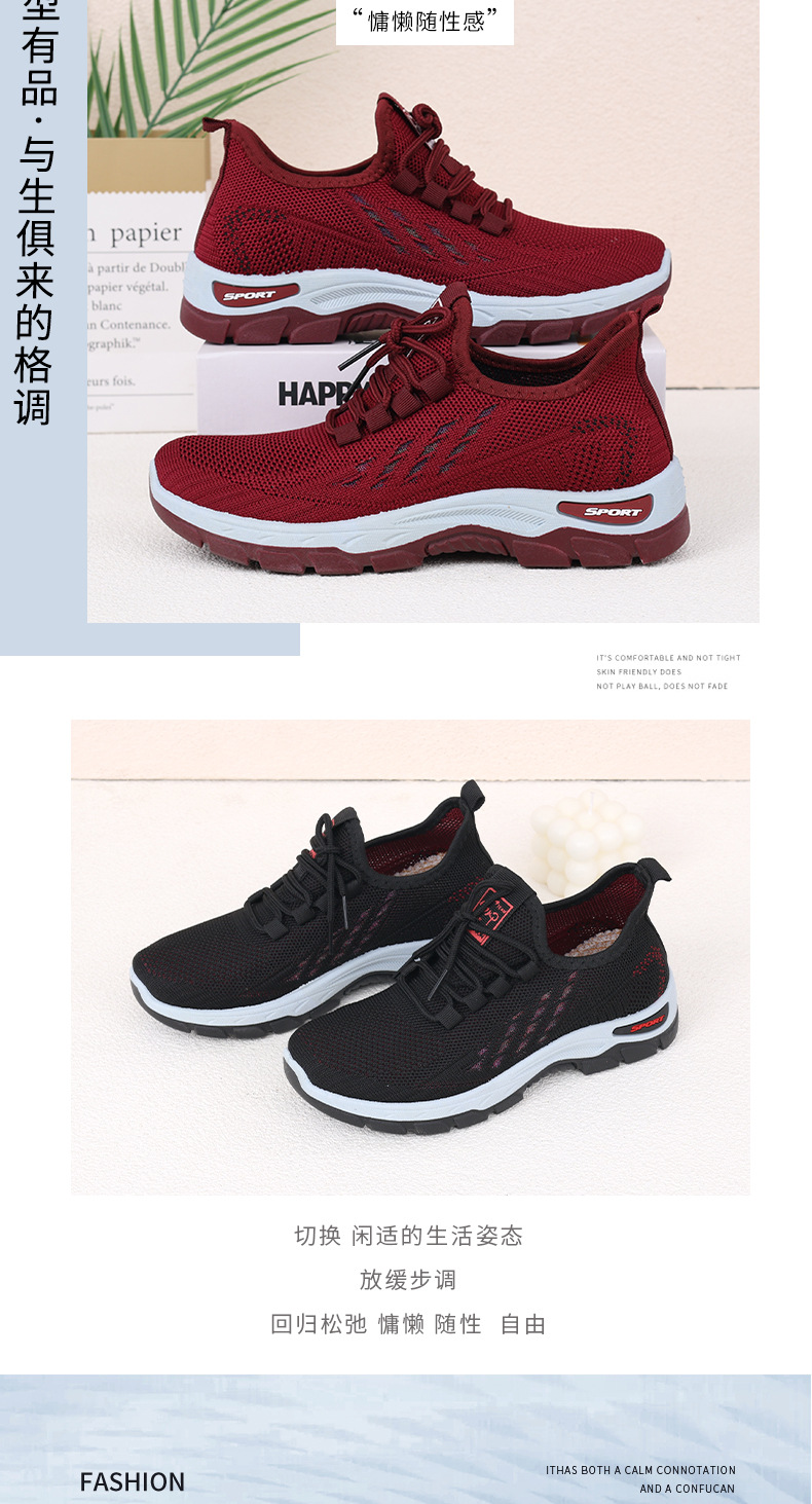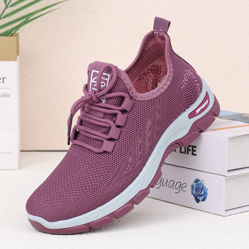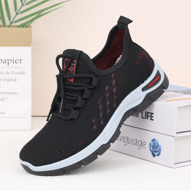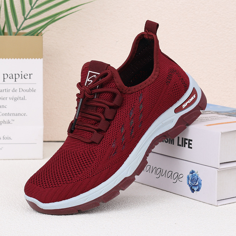 여성을 위한 새로운 스타일의 신발, 통기성이 뛰어난 플라이 니트 탄성 얇은 두꺼운 밑창 미끄럼 방지 스퀘어 댄스 어머니 신발, 레이스 업 베이징 편안함스토어 가기