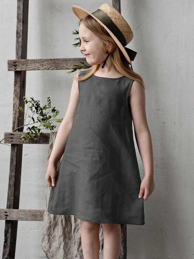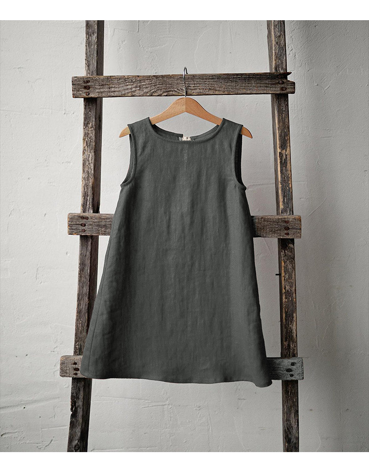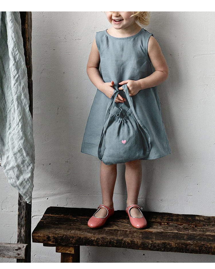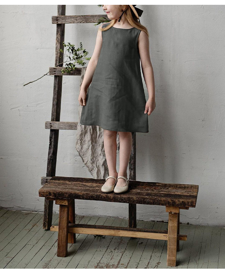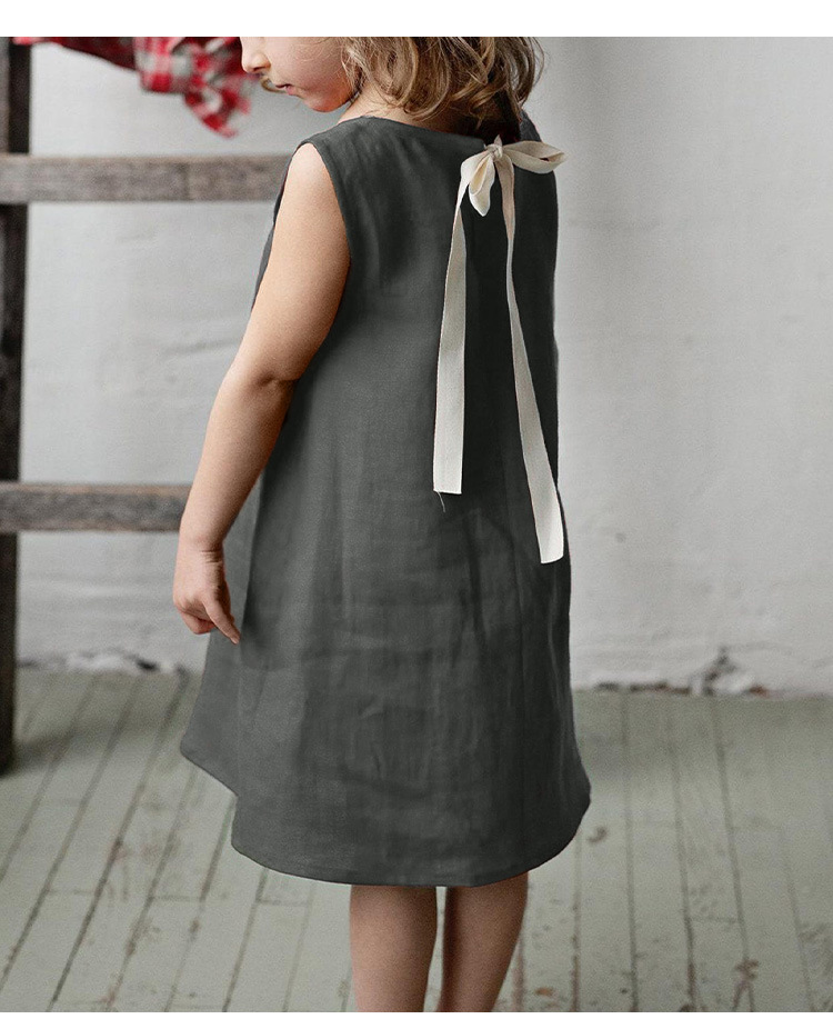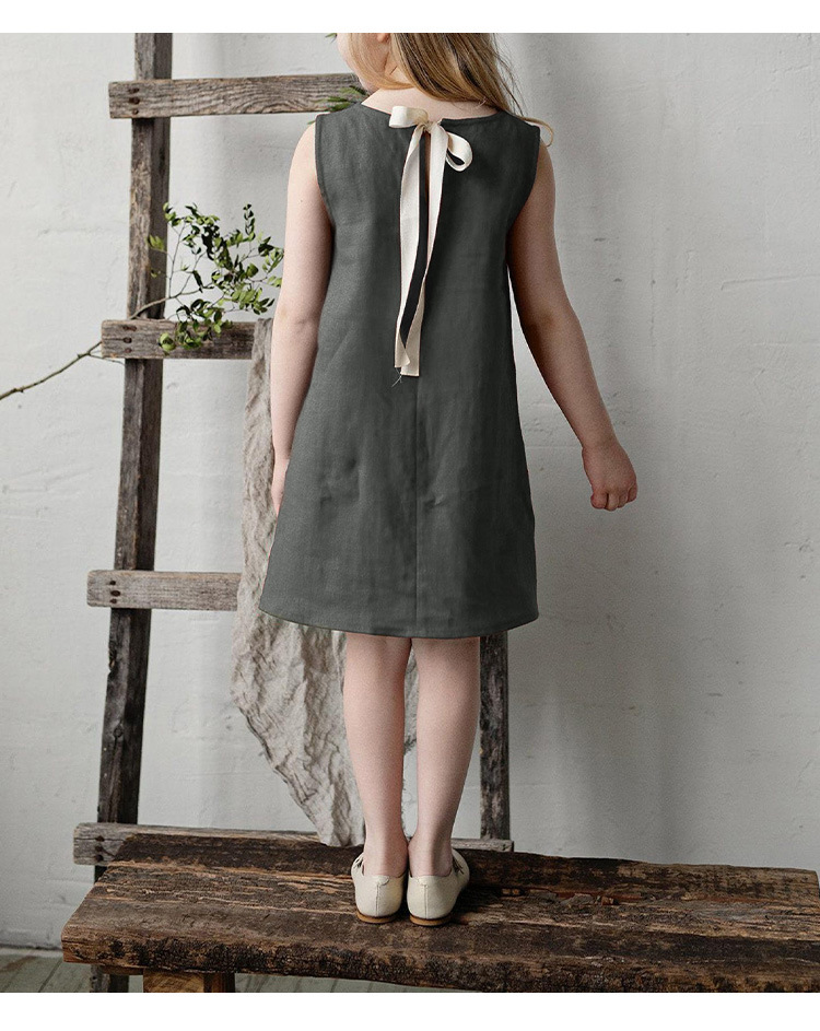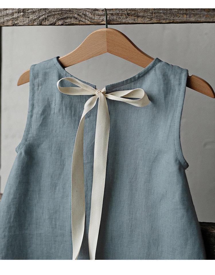 【재고정리】 여아 100% 린넨 민소매 A라인 원피스 리본 장식 여아용 포레스트 스타일 원피스