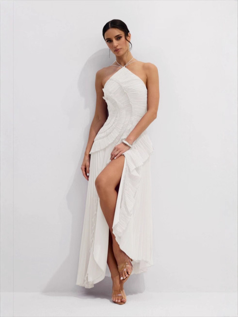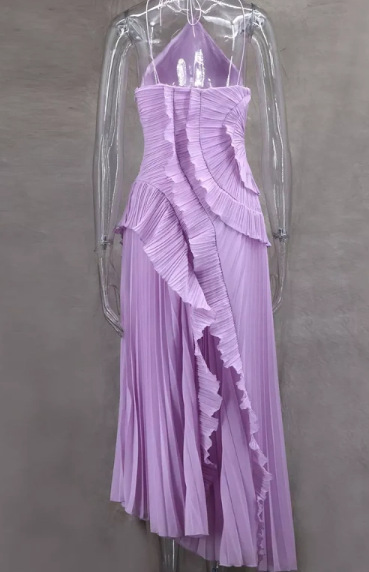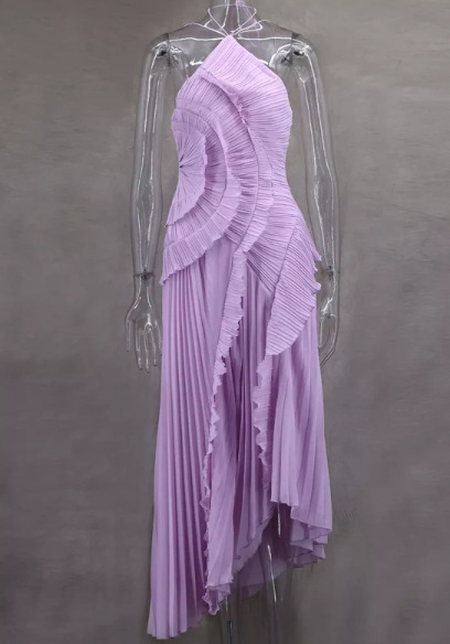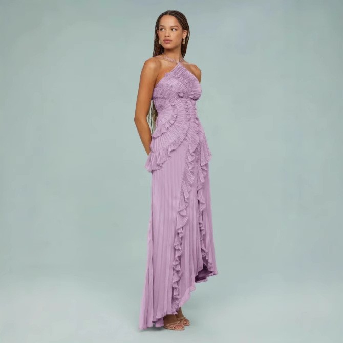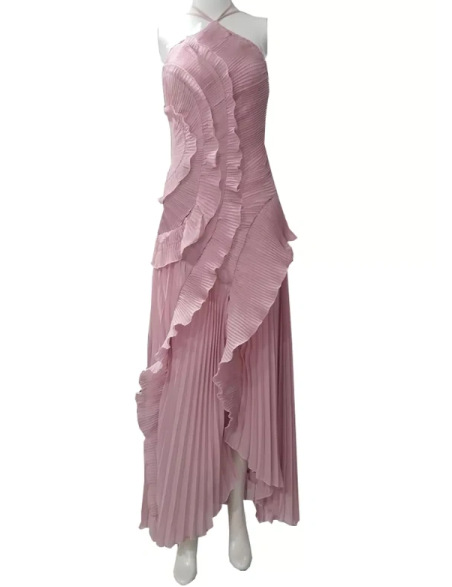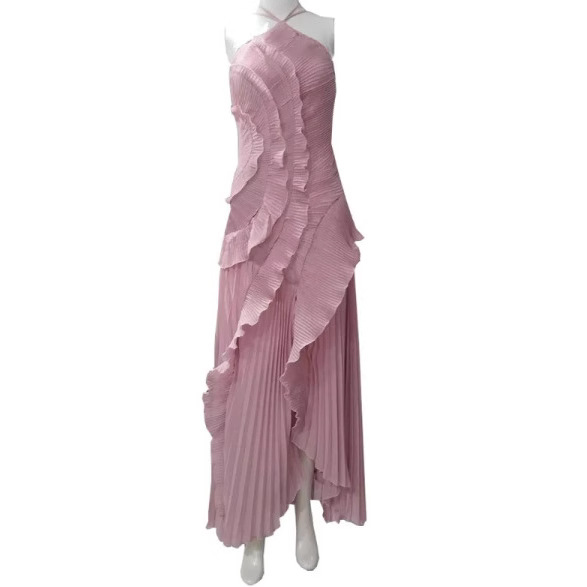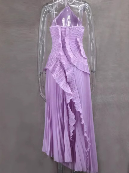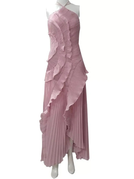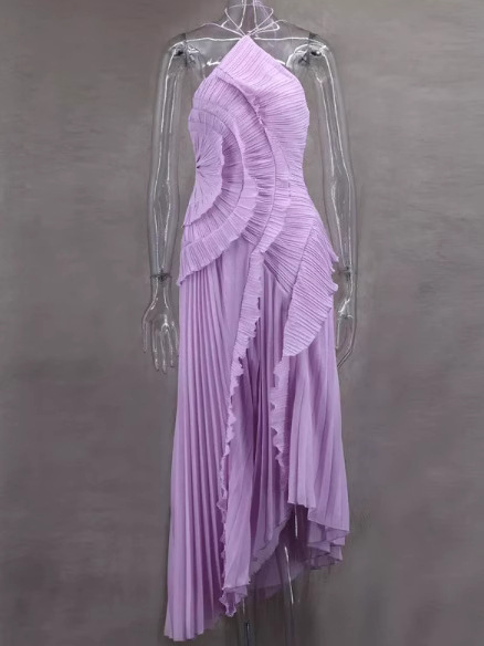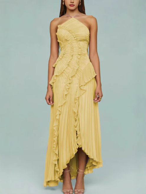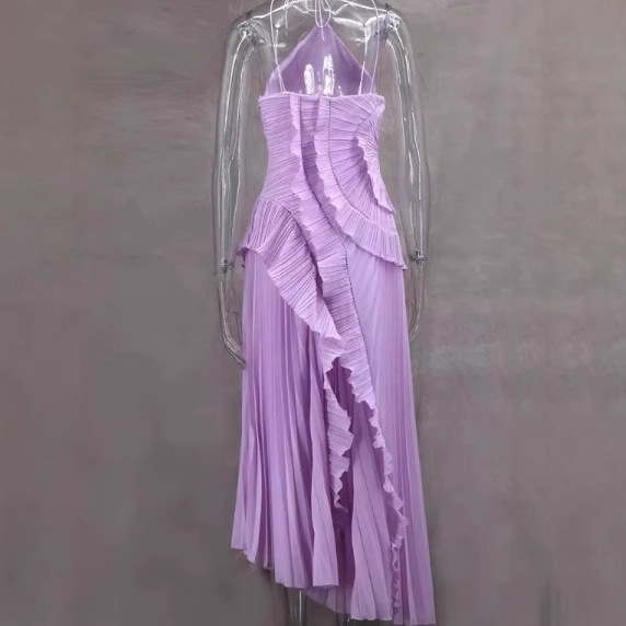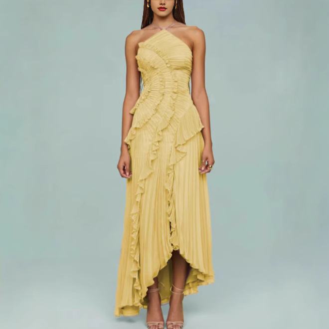 여성용 고급 쉬폰 드레스, 러플 주름 디자인, 슬리밍 중간 길이 스커트, 유럽 및 미국 패션스토어 가기