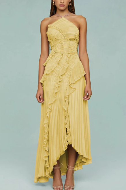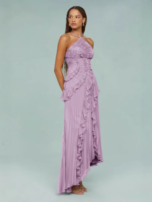 여성용 고급 쉬폰 드레스, 러플 주름 디자인, 슬리밍 중간 길이 스커트, 유럽 및 미국 패션