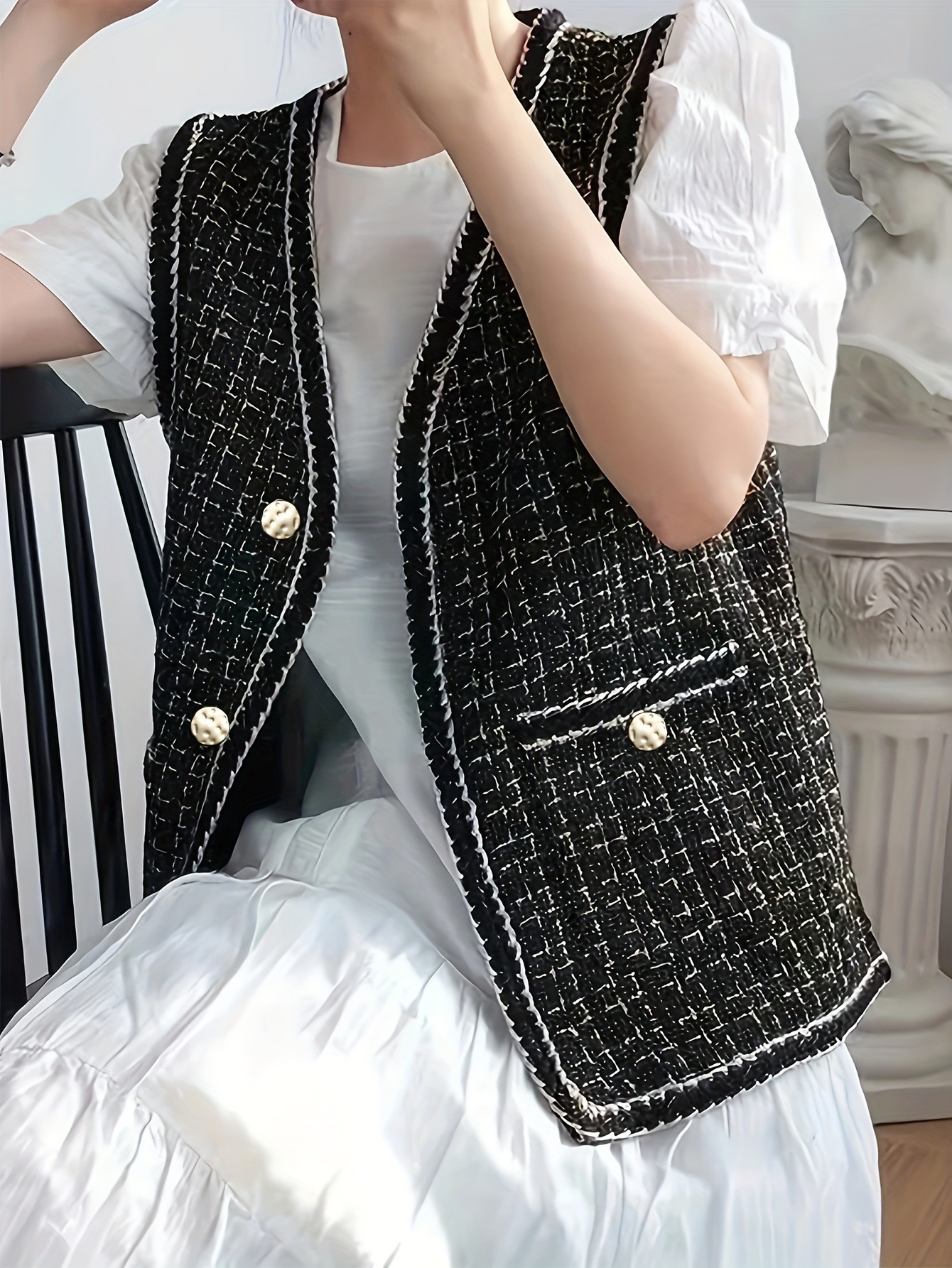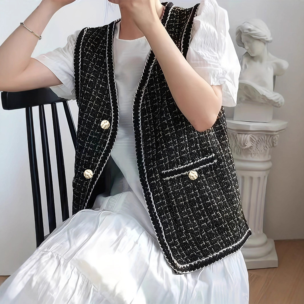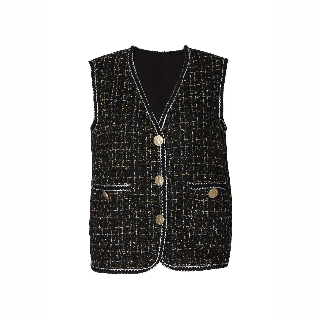 여성용 연예인 스타일 조끼, 한국식 대비색 트위드 직조 브이넥 민소매 체크무늬 조끼