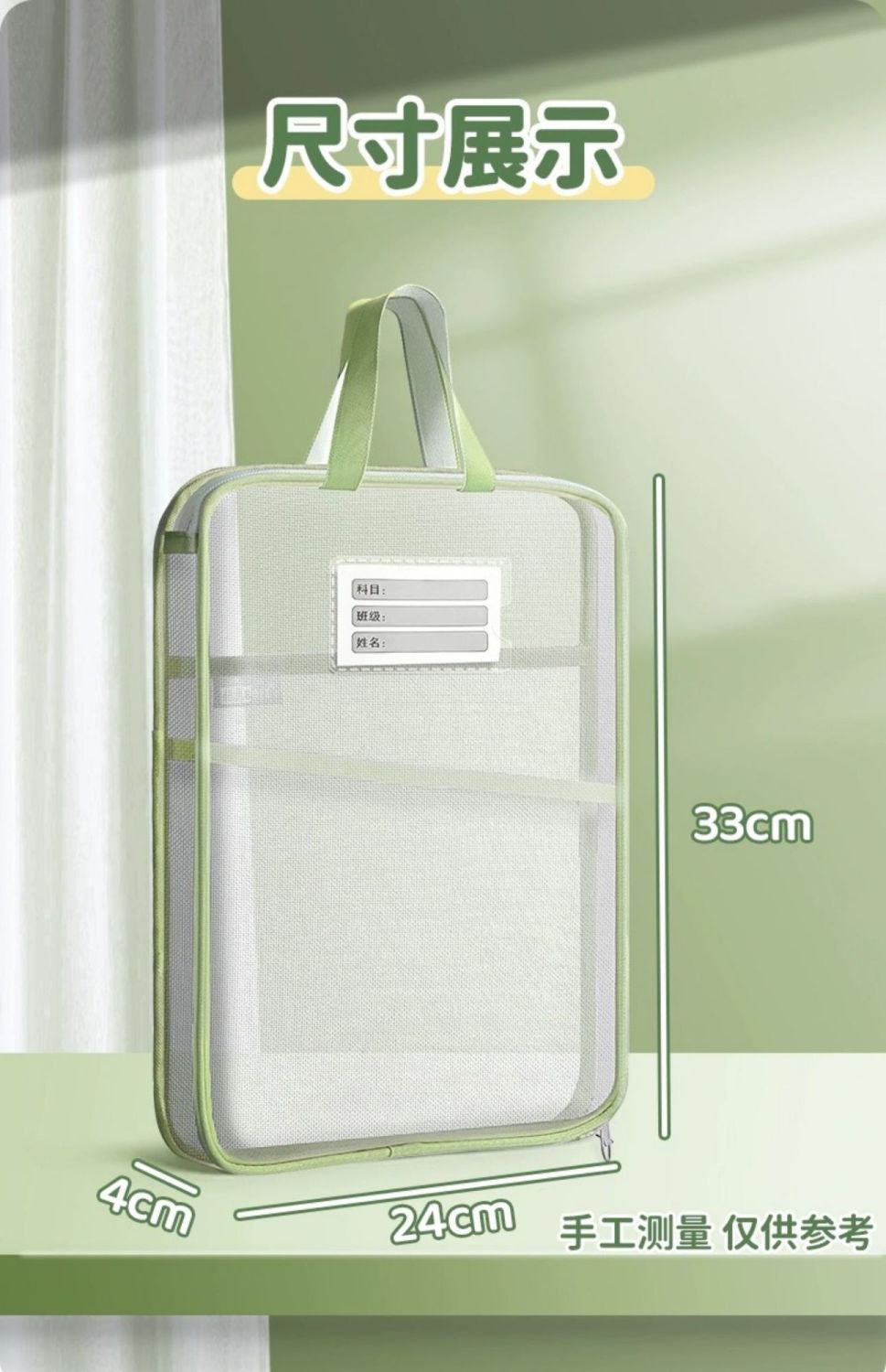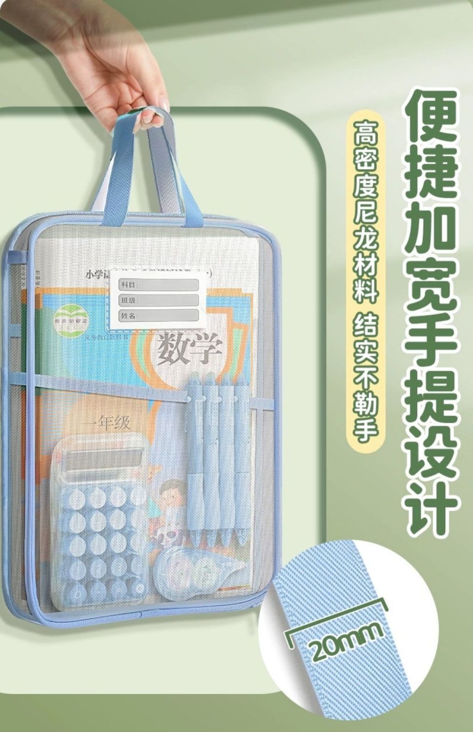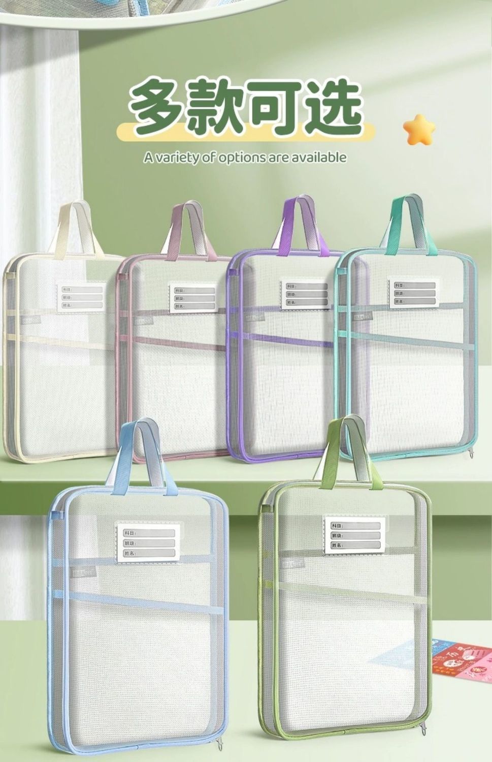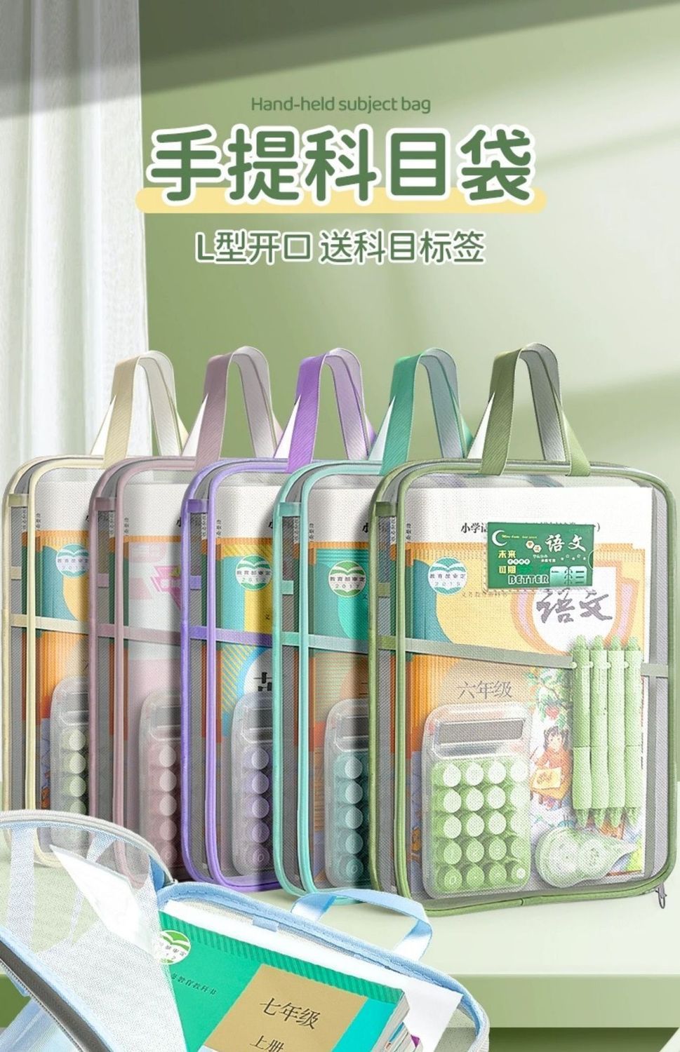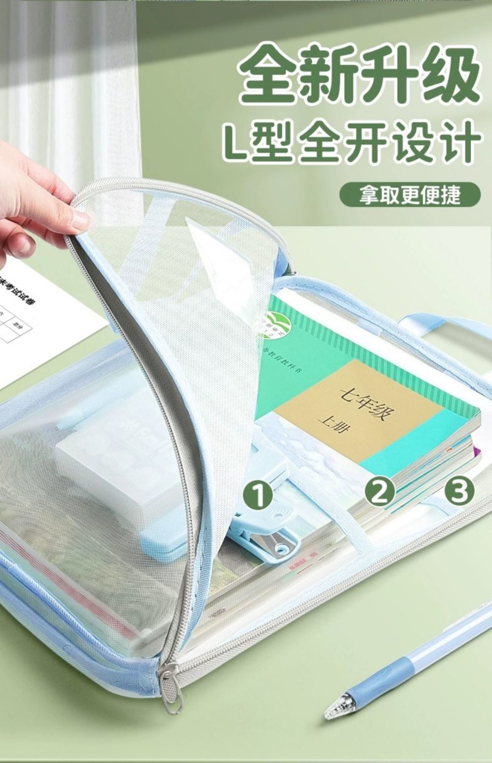 L자형 주제 분류 가방 파일 가방 지퍼가 달린 투명 메쉬 대형 개방형 학생 휴대용 책 가방 시험 가방